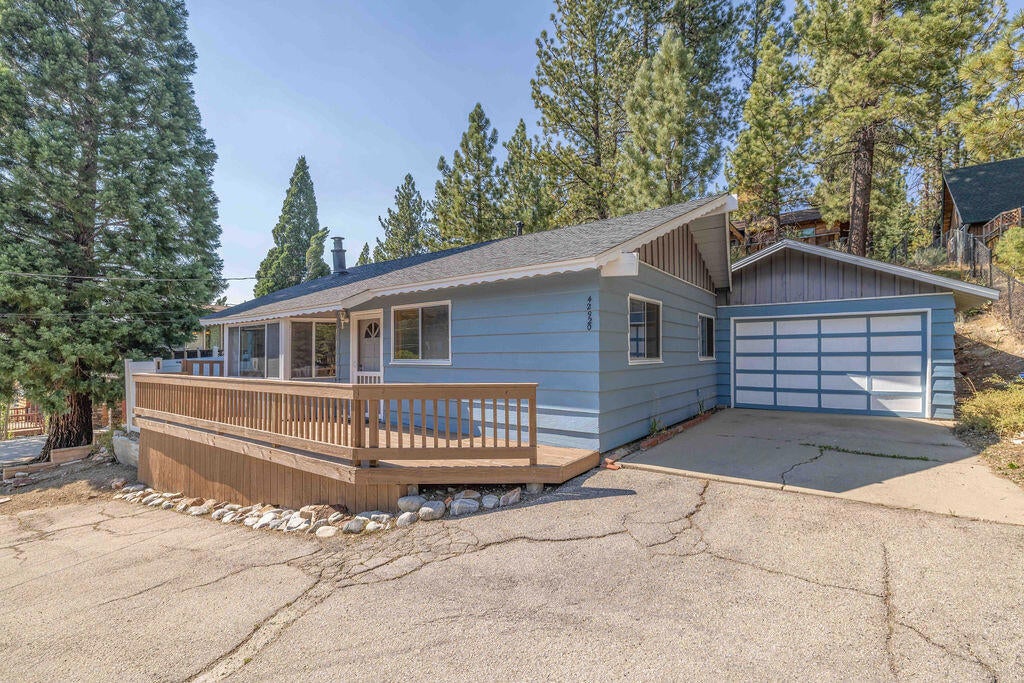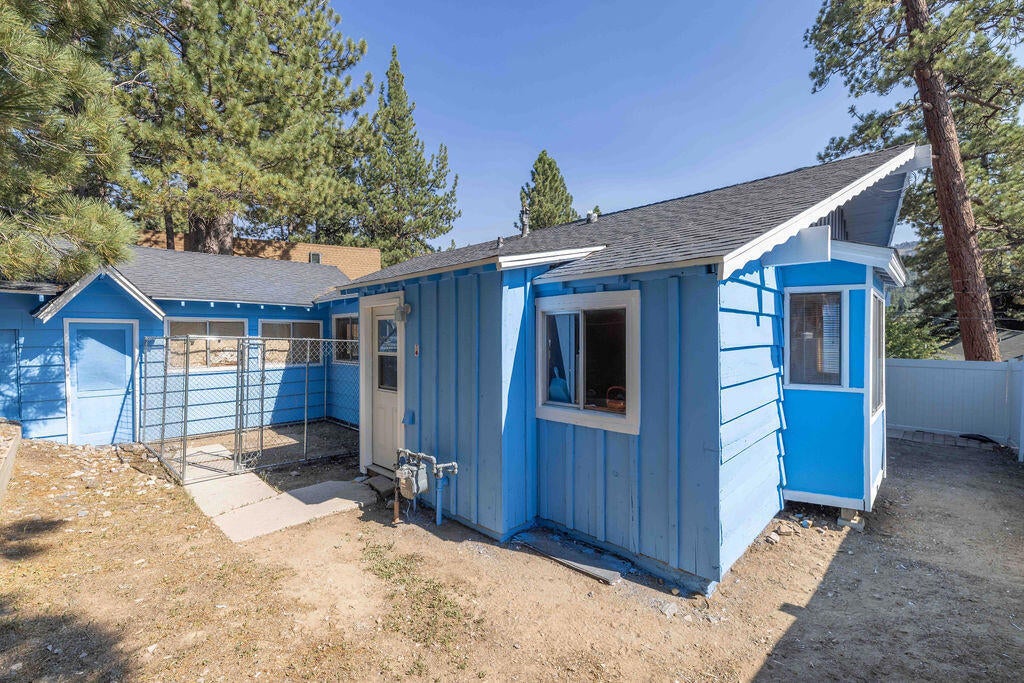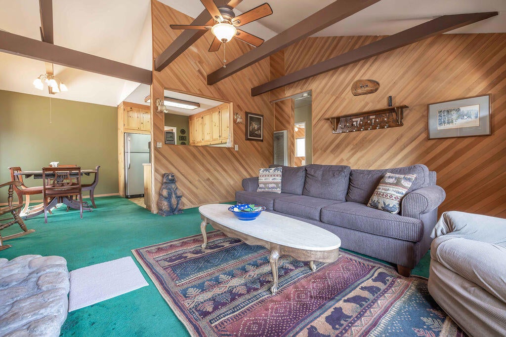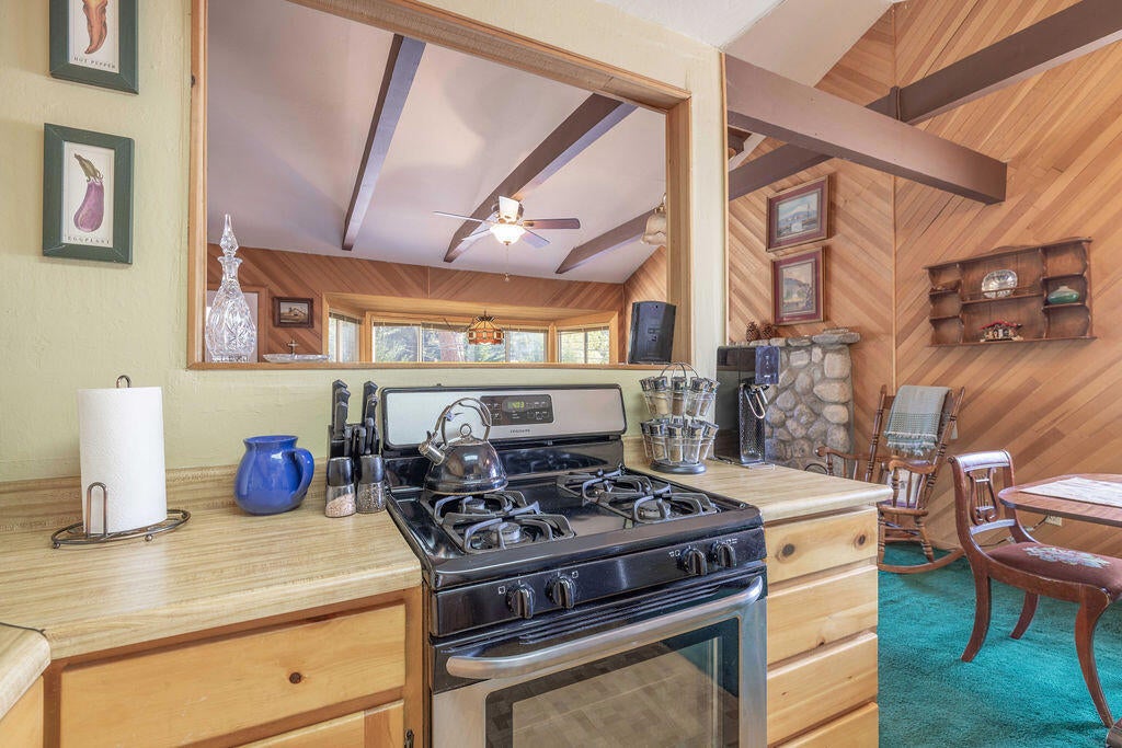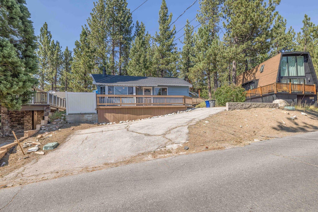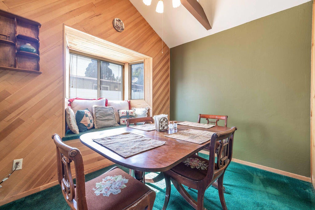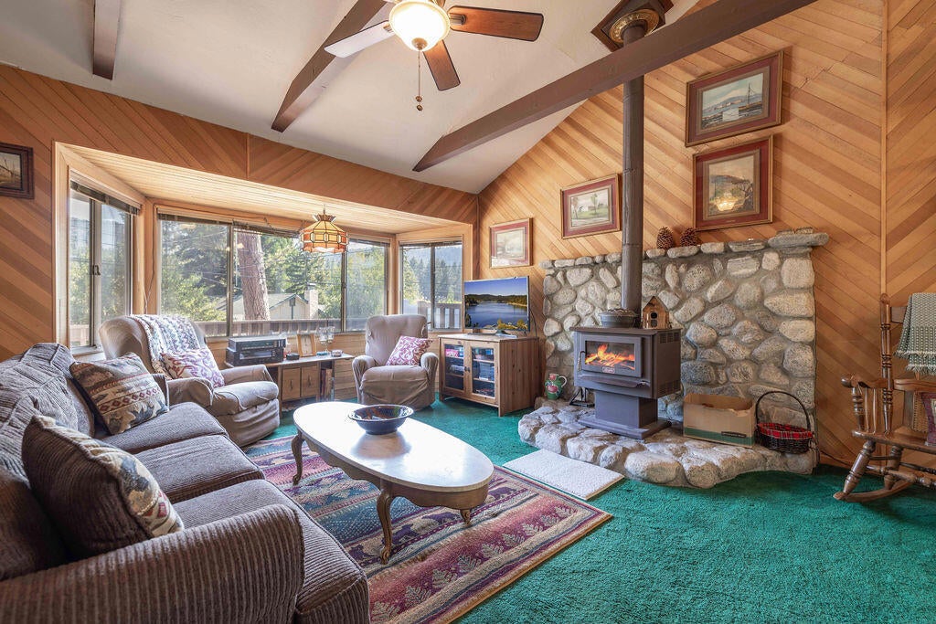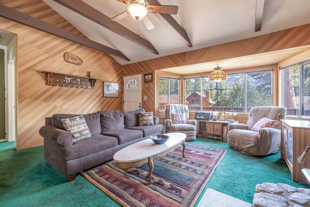 Prime Moonridge location with Ski Slope views! Conveniently located near the base of Bear Mountain Resort, the Big Bear Alpine Zoo, the golf course, and the Moonridge corridor, this home offers year-round appeal. Enjoy stunning ski slope views of both Snow Summit and Bear Mountain. Perfect as a short-term rental, second home, or full-time residence. Inside, you'll find a spacious single-level floor plan with vaulted open-beam ceilings in the living and dining areas, dual-pane windows, and an efficient wood-burning stove for cozy winter nights. The kitchen features charming knotty pine cabinetry, newer stainless-steel stove and refrigerator, built-in dishwasher, and plenty of storage. A separate laundry room adds convenience. Additional features include a two-car garage, fenced backyard with dog run, and furnishings included per seller's inventory (at no monetary value).