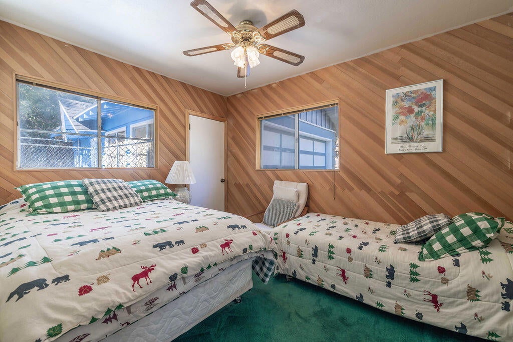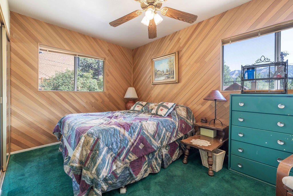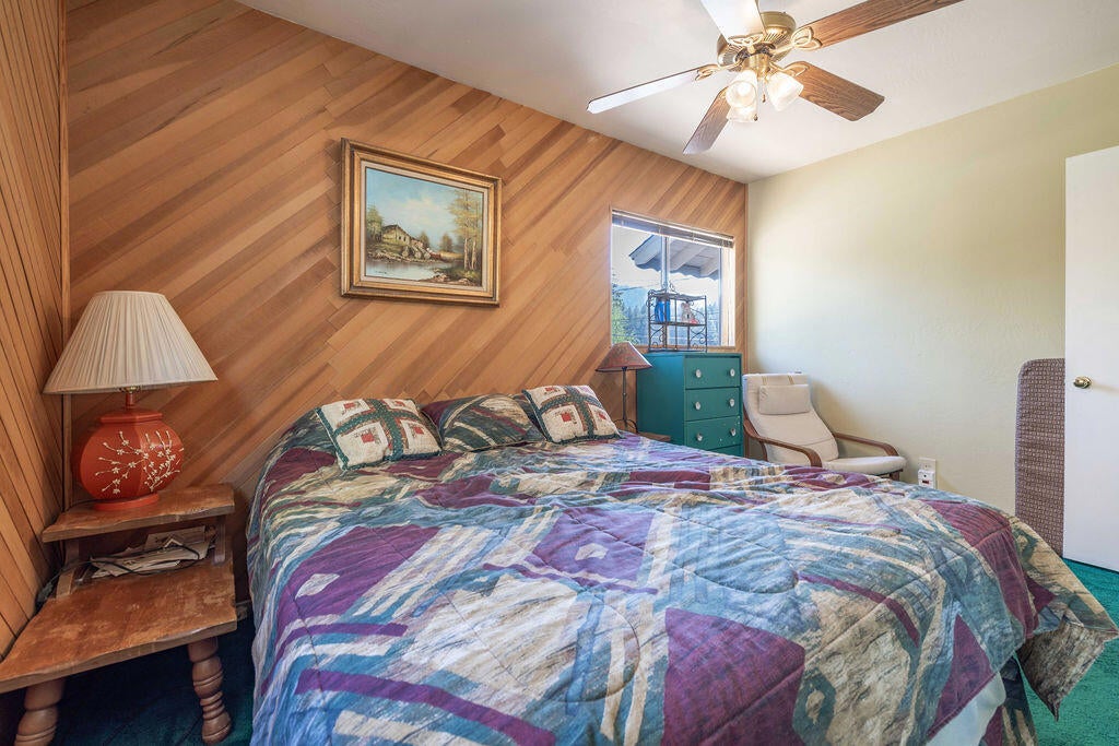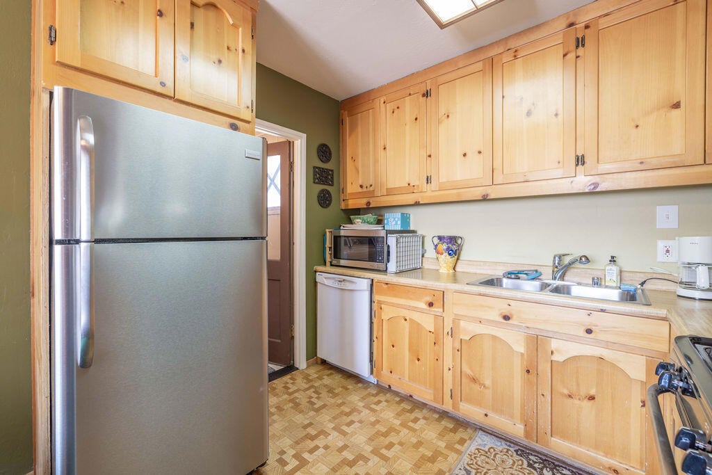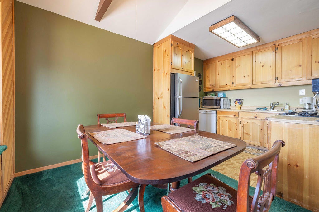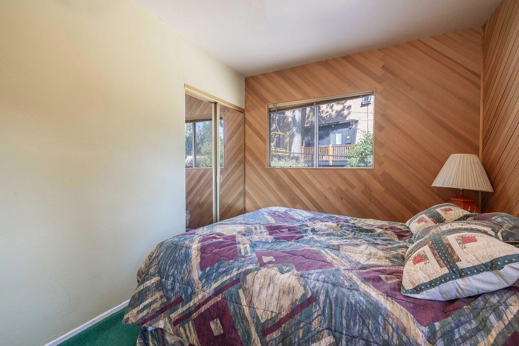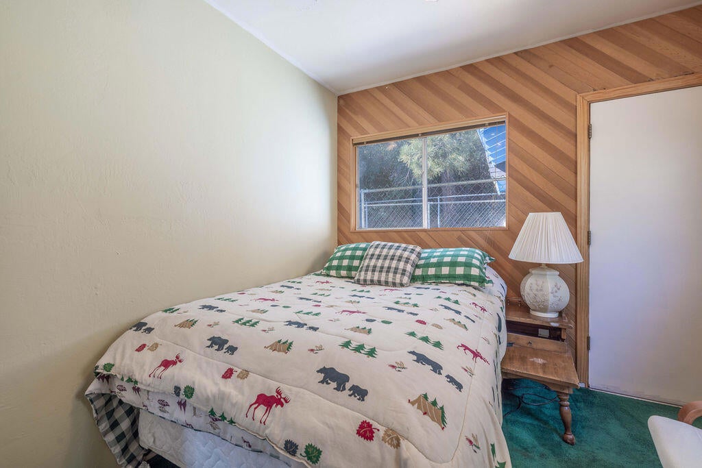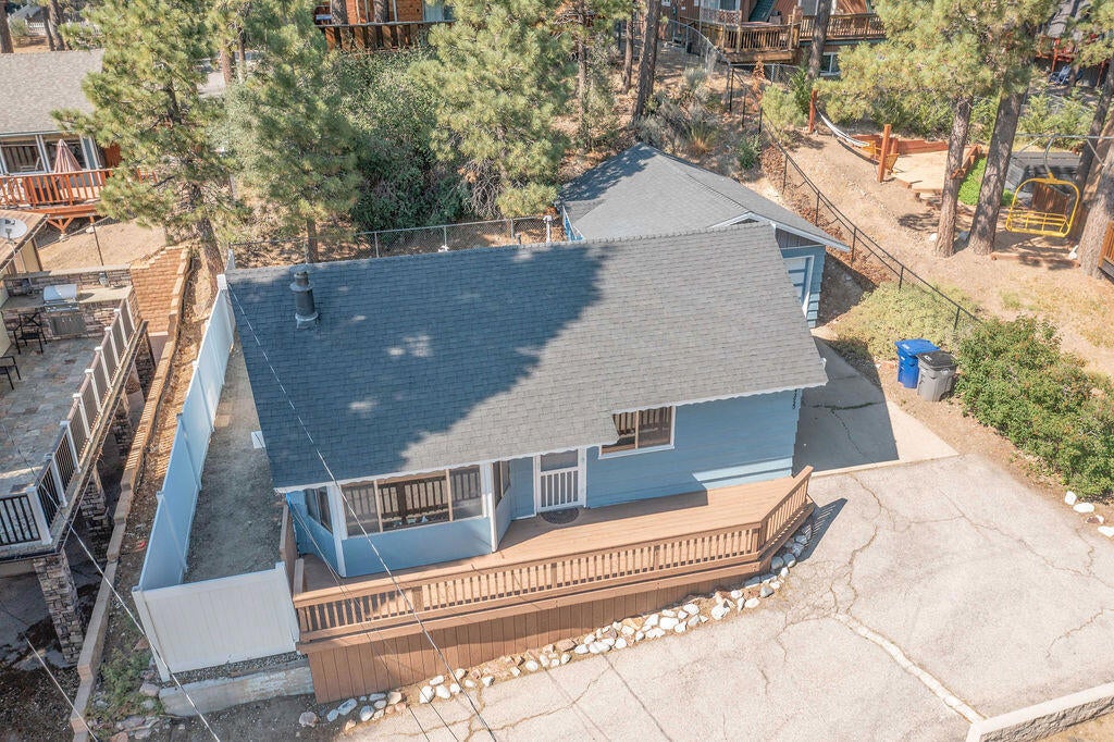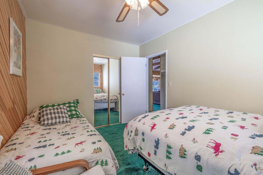 Prime Moonridge location with Ski Slope views! Conveniently located near the base of Bear Mountain Resort, the Big Bear Alpine Zoo, the golf course, and the Moonridge corridor, this home offers year-round appeal. Enjoy stunning ski slope views of both Snow Summit and Bear Mountain. Perfect as a short-term rental, second home, or full-time residence. Inside, you'll find a spacious single-level floor plan with vaulted open-beam ceilings in the living and dining areas, dual-pane windows, and an efficient wood-burning stove for cozy winter nights. The kitchen features charming knotty pine cabinetry, newer stainless-steel stove and refrigerator, built-in dishwasher, and plenty of storage. A separate laundry room adds convenience. Additional features include a two-car garage, fenced backyard with dog run, and furnishings included per seller's inventory (at no monetary value).