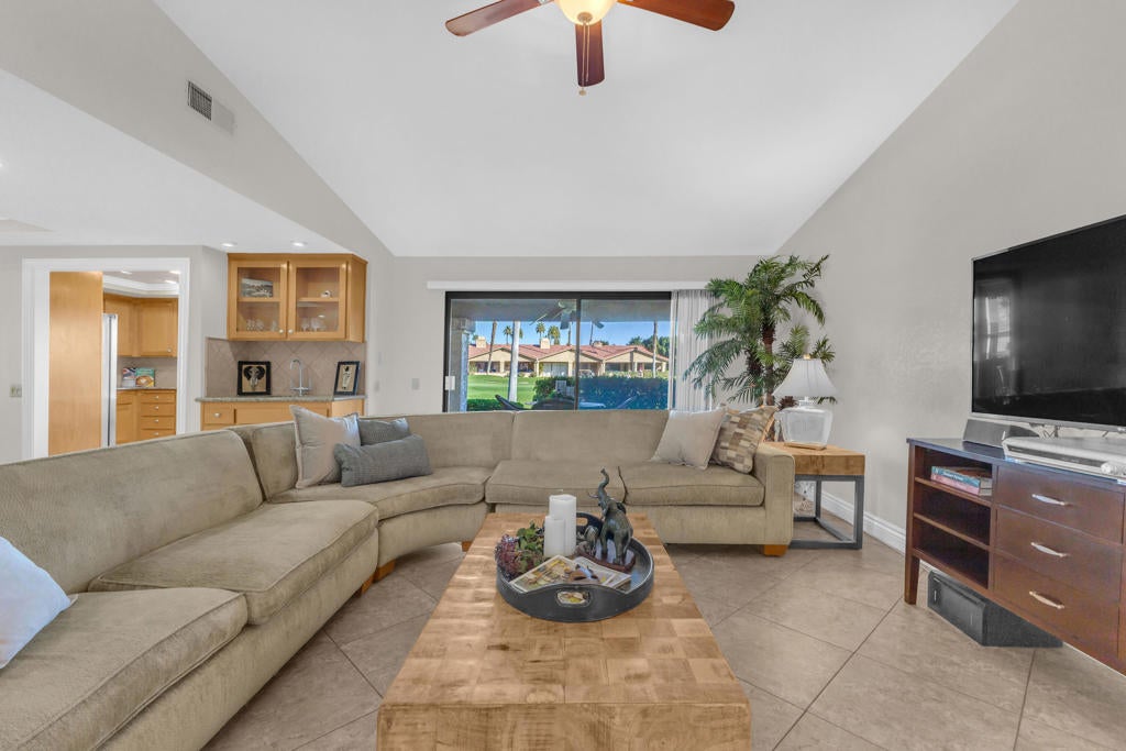 AVAILABLE JAN AND FEB 2025. BOOKED MARCH AND APRIL 2026. New flooring and repainted. 3 bedroom/3bath corner unit overlooks the golf course and putting green and is in move in ready condition with furnishings. This beautiful unit features neutral ceramic tile through the spacious great room with fireplace (bed being added to the third bedroom). Chaparral Country Club is a gated community located in the heart of Palm Desert. The Club offers a full service Restaurant, 8 lighted tennis courts, par 60 golf course, 21 pools and spa, bocce and pickle ball courts. Located only 2 miles away from El Paseo with unparalleled shopping and dining. Golf Course Membership is reasonable. Available to move in at the end of April 2025!