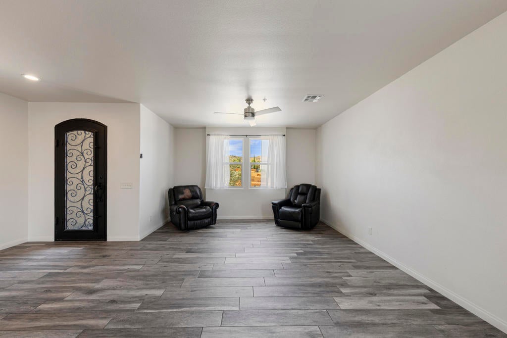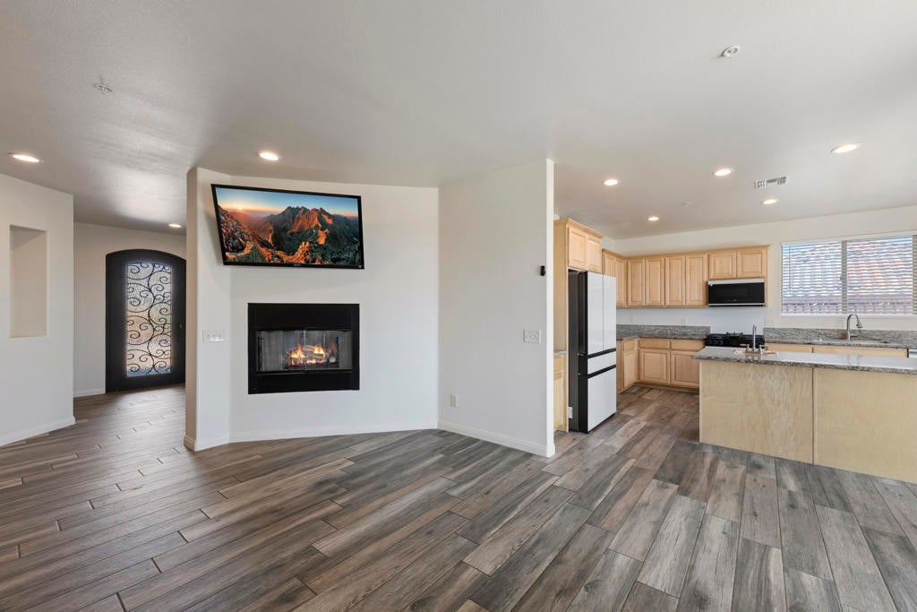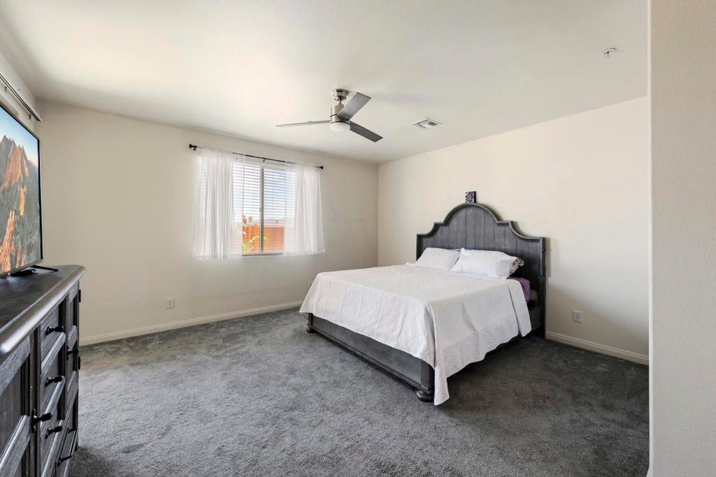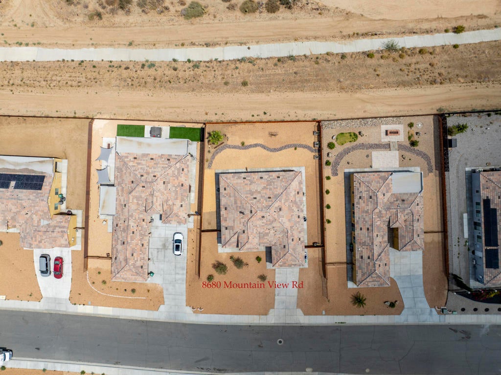 Welcome to 8680 Monument View Drive, an elevated desert retreat offering style, comfort, and sweeping views. Built in 2019, this spacious 4-bedroom, 2.50-bathroom home spans 2,364 sq. ft. on a large 0.27-acre lot surrounded by desert scenery. Inside, natural light pours through abundant windows, highlighting an open floor plan with luxury vinyl plank flooring, ceiling fans throughout, and a cozy living room fireplace. The chef's kitchen is a true centerpiece, featuring modern white glass appliances, thick granite countertops, pendant lighting, and a walk-in pantry, flowing seamlessly into the dining area with mountain views, including snow-capped peaks in the winter. The expansive master suite offers sliding glass doors to a private covered patio along with a spa-inspired bathroom boasting a double vanity, soaking tub, oversized walk-in shower, and a generous walk-in closet. Additional bedrooms are thoughtfully designed, with the third bedroom offering ensuite-style access to the second bath, perfect for guests. Outside, enjoy a beautifully landscaped desert yard with river rock detail, an expansive covered patio overlooking the mountains, and plenty of room to design your own custom pool. With its elevated setting, serene surroundings, and proximity to Joshua Tree National Park, this property blends modern comfort with the beauty of the desert lifestyle.