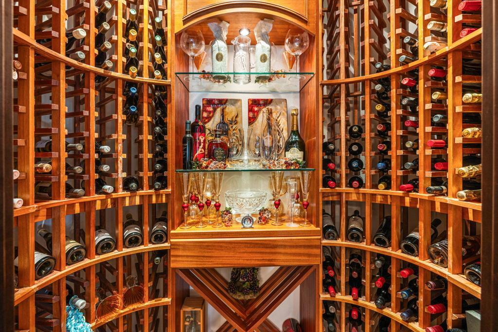 Wet Bar, Breakfast Bar, Built-in Features, Breakfast Area, Crown Molding, Cathedral Ceiling(s), Separate/Formal Dining Room, High Ceilings, Open Floorplan, Recessed Lighting, Storage, Bar, Bedroom on Main Level, Primary Suite, Walk-In Pantry, Wine Cellar, Walk-In Closet(s), Dressing Area, Wired for Sound