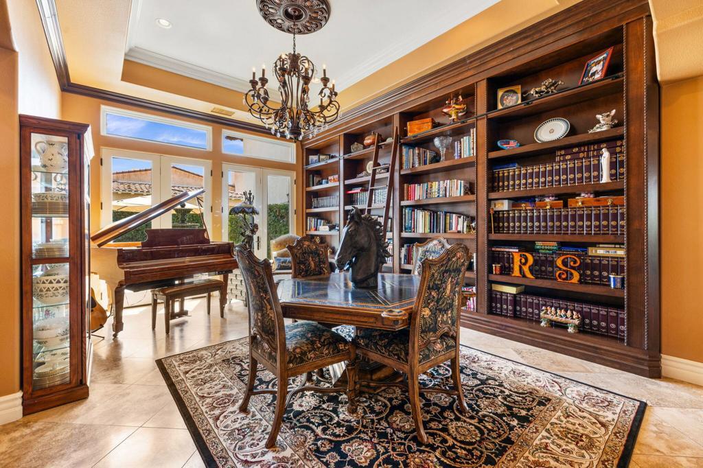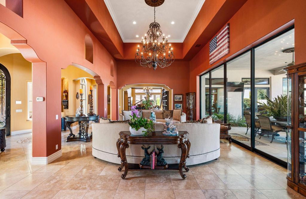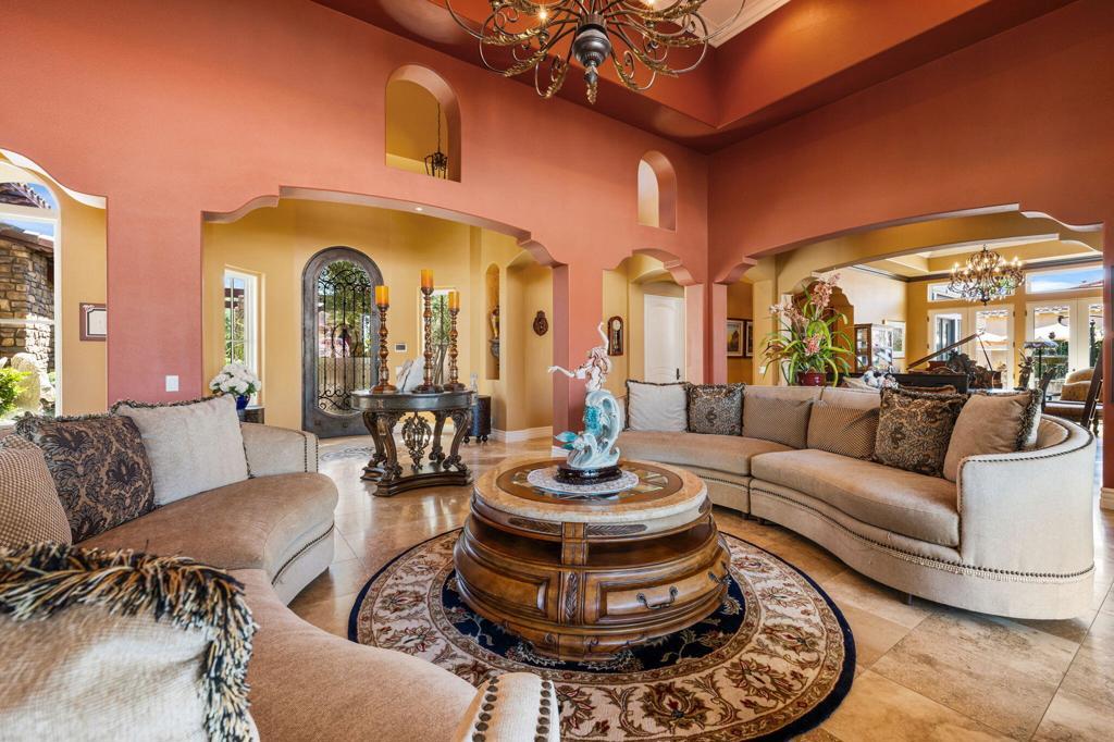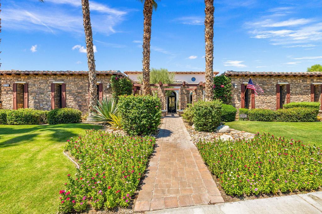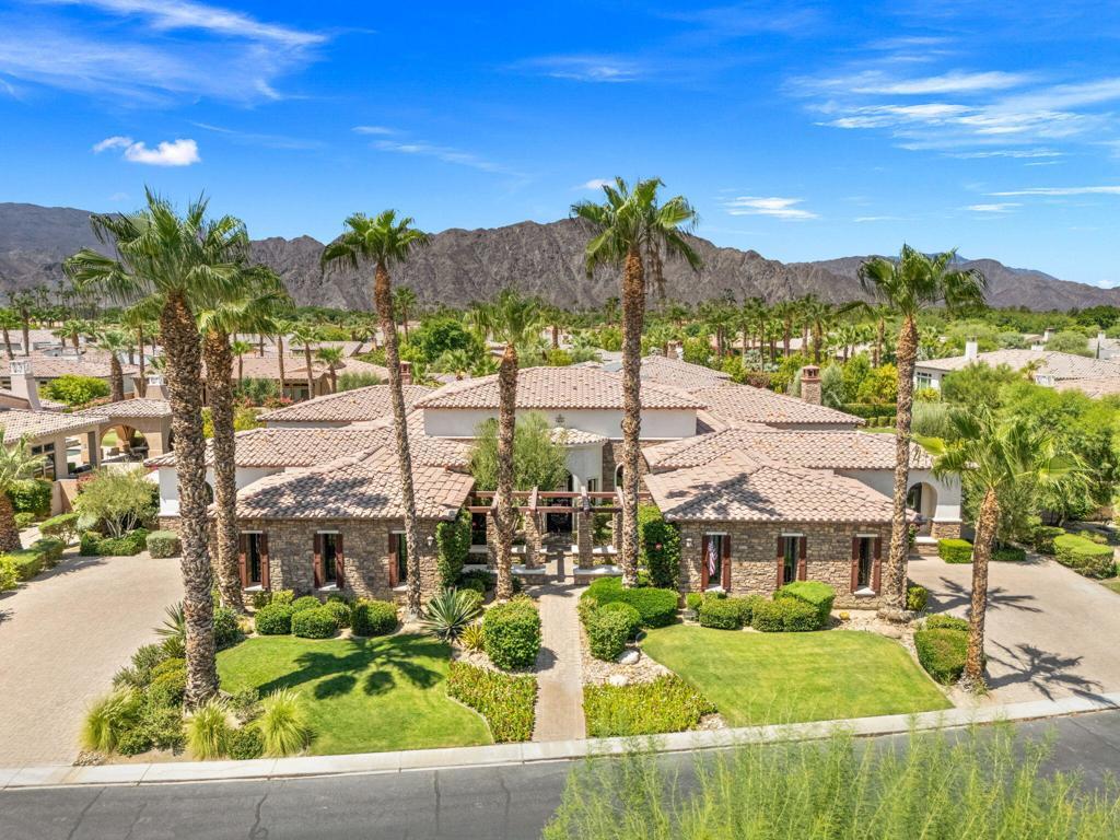 Framed by the breathtaking backdrop of the majestic Santa Rosa Mountains, this timeless masterpiece offers over 5,600 sq. ft. of refined living in the prestigious, guard-gated community of Griffin Ranch. Once part of the storied Merv Griffin estate, this 300-acre enclave was envisioned with an equestrian-inspired design, attracting both horse enthusiasts and those in pursuit of a truly exceptional lifestyle.From the moment you arrive, the home captivates with its impressive curb appeal. Inside, a stately library/office showcases exquisite custom craftsmanship, rich details, and dramatic chandeliers. The primary suite is a private sanctuary, complete with its own retreat and a beautifully appointed fireplace that radiates warmth and sophistication.Designed for both elegance and comfort, the residence features multiple side patios with soothing fountains, a climate-controlled wine room, and sweeping mountain views. Distinctive upgrades include surround sound throughout, extended crown moldings, custom finishes, and designer window treatments. The gourmet kitchen is a chef's dream with Sub-Zero and Wolf appliances, dual Asko dishwashers, and extensive custom cabinetry. A 4-car garage provides both convenience and practicality.Every element of this home reflects unparalleled craftsmanship and sophistication, making it one of the desert's most distinguished residences--perfectly blending luxury, lifestyle, and community.