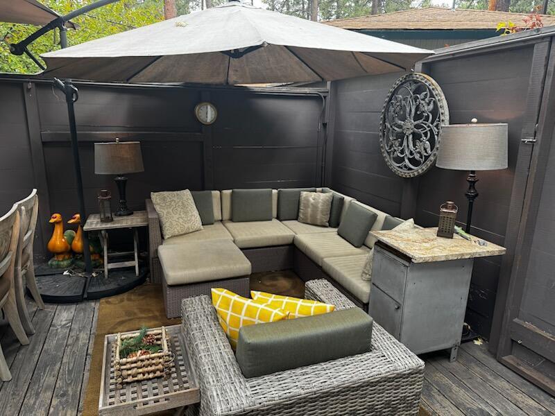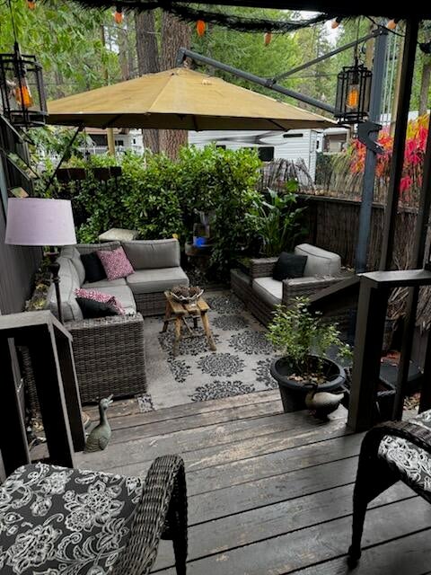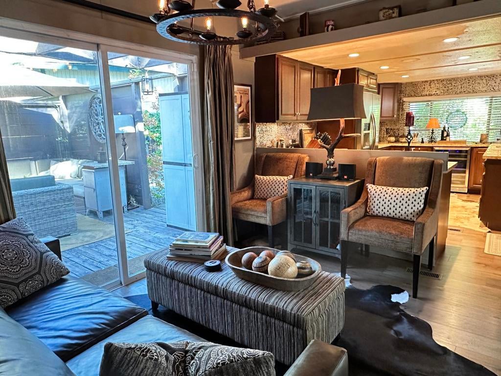 Step into effortless mountain living with this beautifully updated 1966 smart mobile home, offered fully furnished and move-in ready. This inviting 2-bedroom, 1-bath home features a grand kitchen with modern appliances and all the bells and whistles, a spacious dining area with a cozy propane freestanding fireplace, and smart home upgrades including security cameras, a smart system, and automated lighting for comfort and peace of mind. Enjoy multiple outdoor spaces, including a front deck and yard with a tranquil water fountain, a back deck overlooking the open meadow, a large side yard, and a side deck showcasing a private patio area complete with hot tub and entertainment space, as well as a covered area for storage. Parking is available for two cars, and the space rent is $675 per month. With its blend of privacy, smart features, and turnkey comfort, this is a must-see opportunity for your next Idyllwild escape.