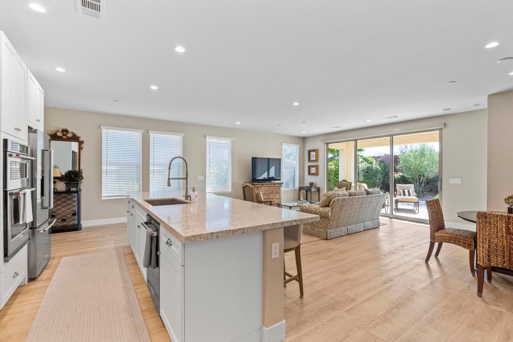 Priced to Sell! Light, bright, and move-in ready, this upgraded Evia model in Trilogy at The Polo Club is your ticket to stylish resort living with breathtaking mountain views.Offering 2 bedrooms + office/den, 2 bathrooms, and over 1,500 sq ft of designer-inspired space, this home blends luxury with comfort. The open-concept great room is anchored by a modern gourmet kitchen featuring stainless steel appliances, quarts countertops, tiled backsplash, an upgraded gas range and oven, built-in microwave, pantry, and a large island with bar seating--perfect for gatherings or quiet mornings at home.Every detail has been elevated with upgrades: luxury plank flooring, wide baseboards, soft close cabinetry, designer window coverings, and great lighting throughout. The primary suite is a serene retreat with dual sinks, quartz counters, and a frameless tiled glass shower.Step outside to your private expanded patio with upgraded landscaping and peek-a-boo mountain views. Plumbed for a fire pit or BBQ, this space was made for entertaining, relaxing, and soaking in desert sunsets.Additional features include tankless water heater, new washer, dryer, leased solar, and energy-efficient design.Trilogy at The Polo Club is one of the desert's premier 55+ communities, offering optional club membership with access to a resort-style pool, lap pool, state-of-the-art fitness center, pickleball, tennis, bocce, and a top-rated on-site restaurant. Conveniently close to world-class golf, shopping, dining, and entertainment, this is desert living at its finest.Don't miss this opportunity to make Trilogy your home--where connection, convenience, and quiet elegance come together.
