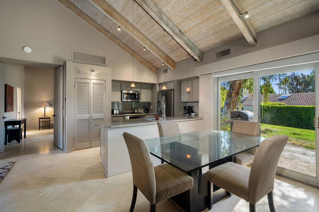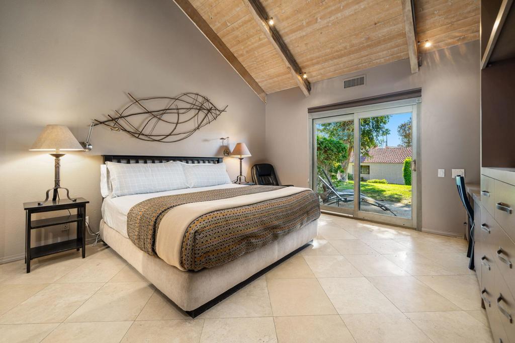 Welcome to this beautifully maintained, turnkey-furnished one-bedroom Tennis Villa, ideally located inside prestigious Mission Hills Country Club. Perfectly positioned to capture stunning mountain views, this charming residence offers a warm and inviting interior featuring soaring wood-beamed ceilings, custom flooring, upgraded lighting, and double-pane sliding glass doors that fill the space with natural light. The well-appointed kitchen includes granite countertops and stainless-steel appliances, overlooking a spacious Great Room with a decorative fireplace--ideal for relaxing or entertaining. The generous primary suite provides a peaceful retreat with a built-in desk/entertainment center and an updated en-suite bathroom boasting dual vanities and an oversized walk-in shower. Whether you're seeking a full-time residence, vacation getaway, or investment property, this villa delivers exceptional comfort and style. Mission Hills Country Club offers a variety of membership options for tennis and golf enthusiasts, with world-class amenities including three championship golf courses, 30 tennis courts (grass, clay, and hard), pickleball and croquet courts, a state-of-the-art fitness center, spa services, and a vibrant calendar of dining and social events--all within one of Rancho Mirage's most sought-after communities.
