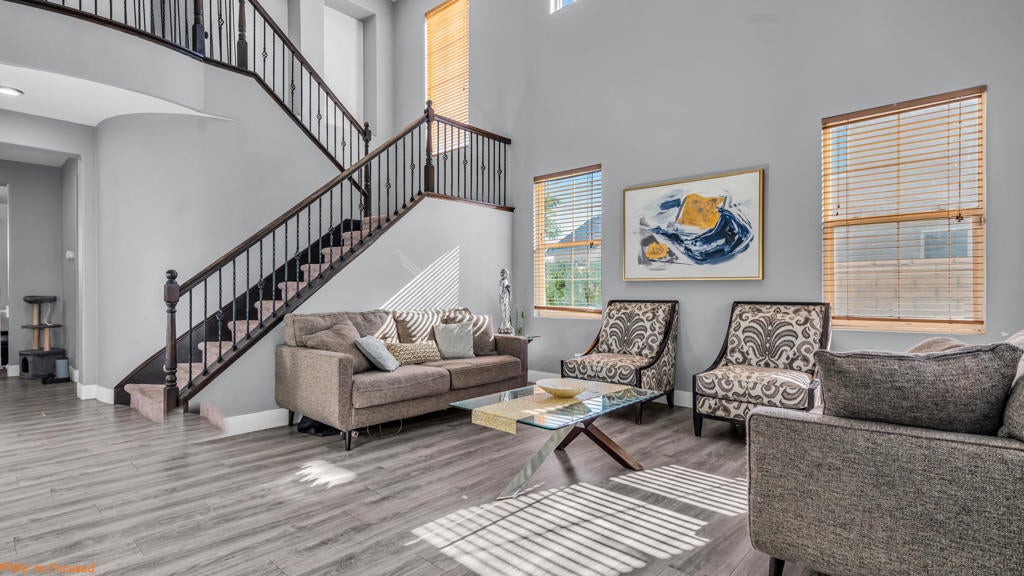 Spacious 2-story: 1st floor has 1 bedroom, 1 bathroom, gourmet kitchen, informal living area, and formal living area with a cozy fireplace. 2nd floor has 4 bedrooms 2 bathrooms, included is Master suite with walk-in closet, soaking tub & dual sinks. Laundry room is also located upstairs. Entertainer's backyard with palapa, outdoor BBQ, and wiring for speakers and TV. Spacious 3-car garage. Home sits across from park, low HOA!