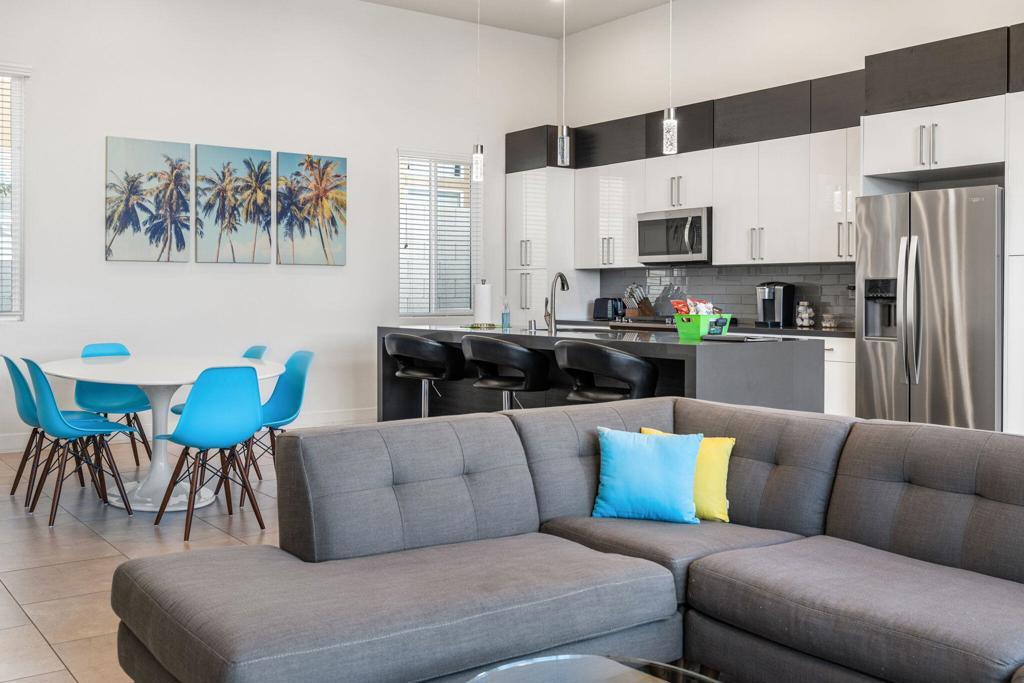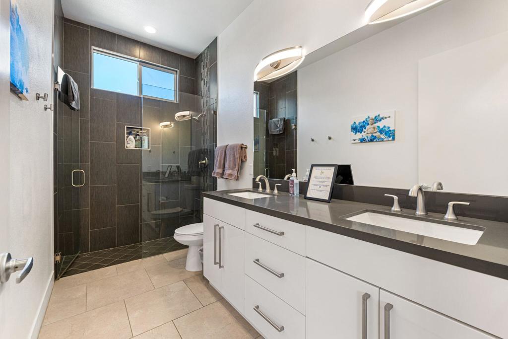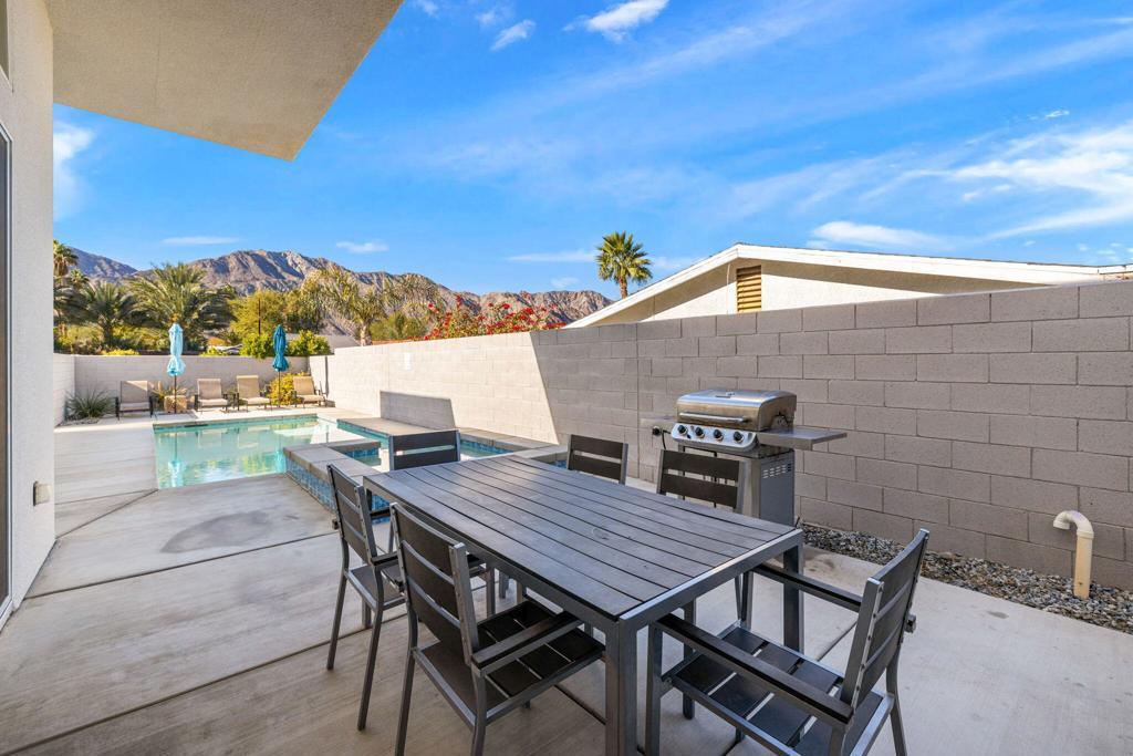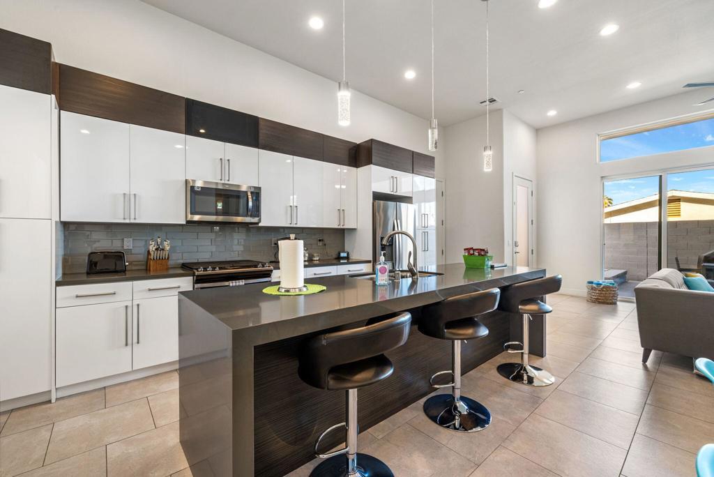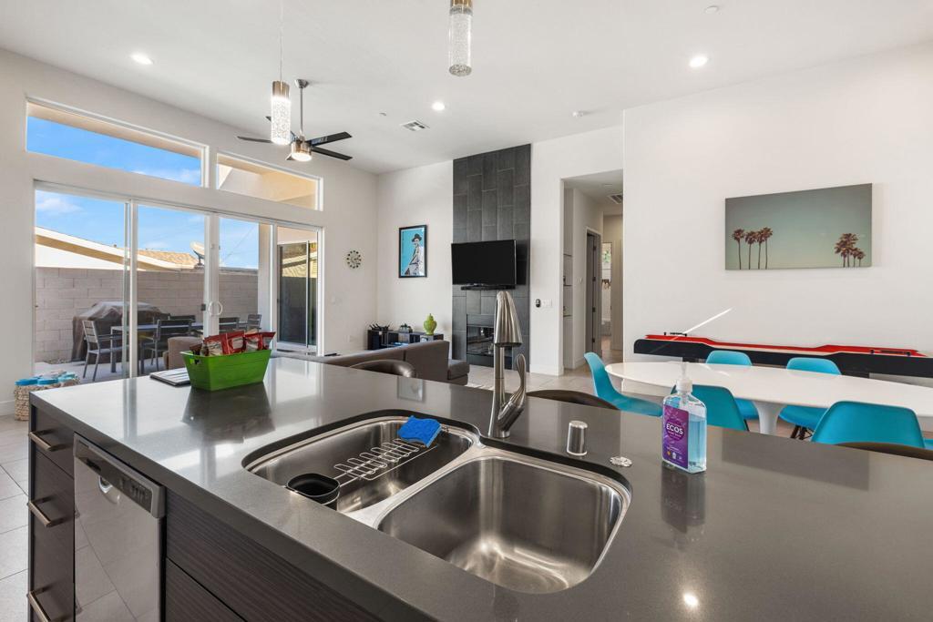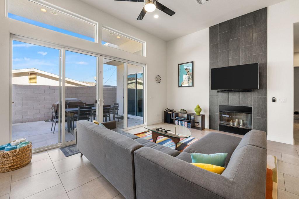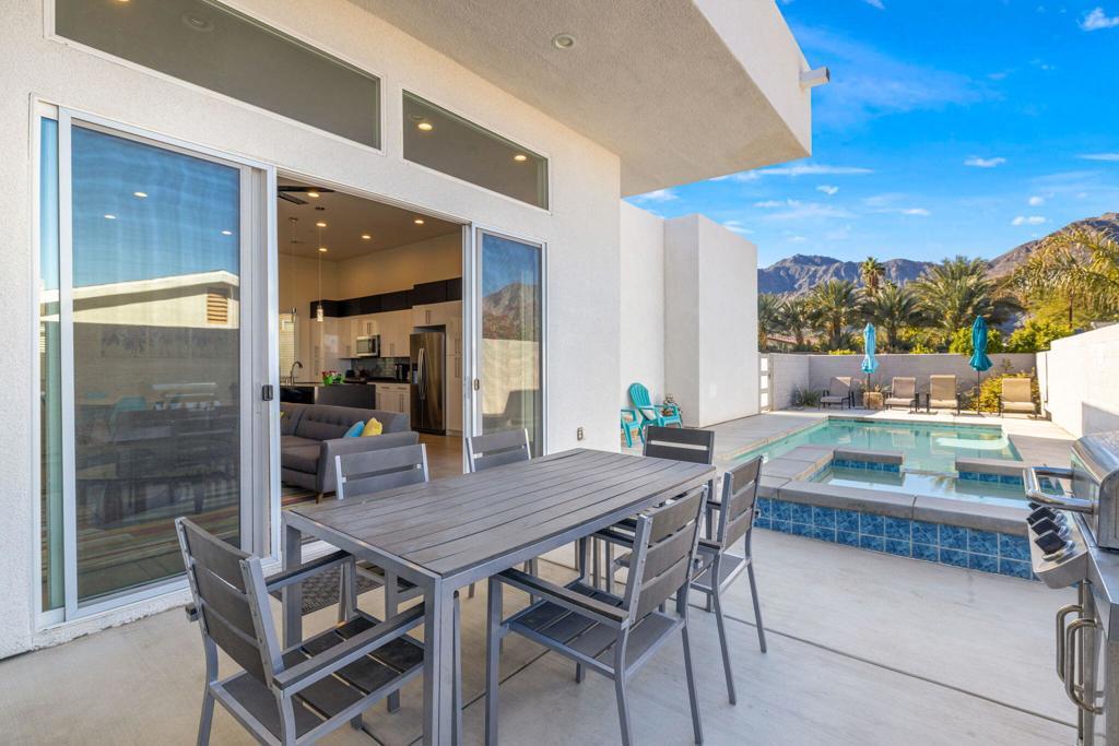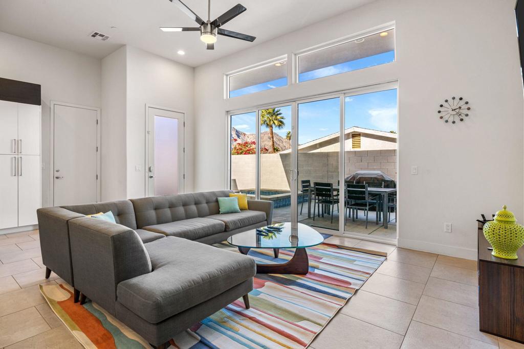 This modern retreat is designed to impress at every turn. With a seamless open floor plan, it blends indoor comfort with outdoor living, ideal for both everyday enjoyment and elegant entertaining. Striking details include a custom fireplace, subway tile backsplash, stainless steel appliances, soaring 12-foot ceilings, and 8-foot doors throughout. The chef's kitchen is the centerpiece, anchored by a dramatic quartz waterfall island perfect for hosting gatherings of any size.The primary suite offers a true escape, showcasing panoramic mountain views, direct access to the private hot tub, and a spa-inspired bath with dual quartz vanities and a custom-tiled walk-in shower. Outdoors, the resort-style pool area provides abundant space for dining and lounge seating, all framed by breathtaking sunset views.After a day exploring nearby hiking trails, dining, shopping, and local art fairs, return home to unwind beneath the stars from your patio or soak in the serenity of your spa. A rare opportunity to own a contemporary desert sanctuary awaits--schedule your private showing today.