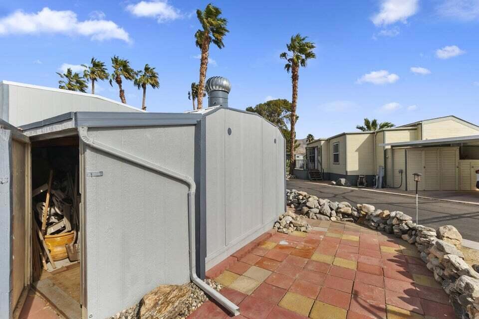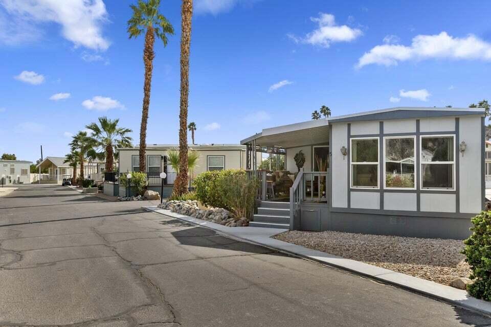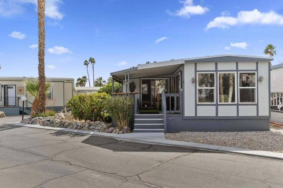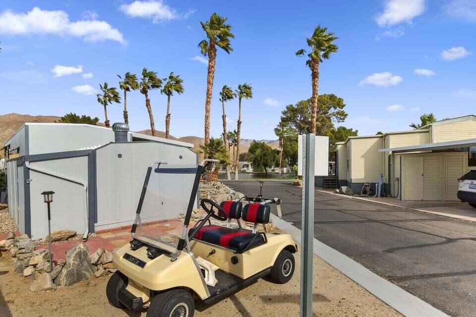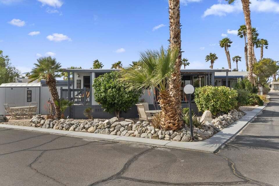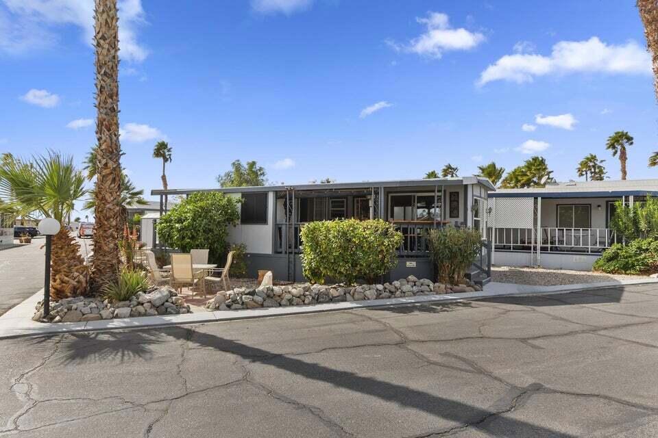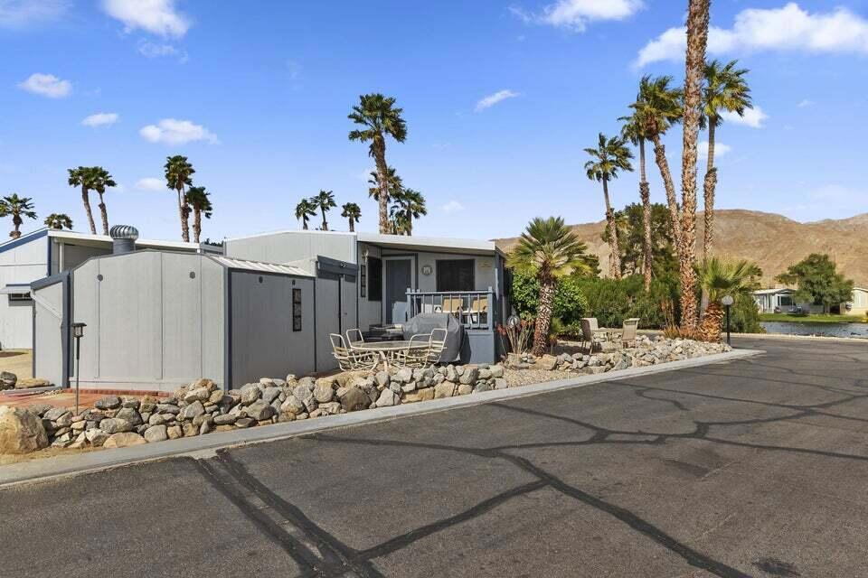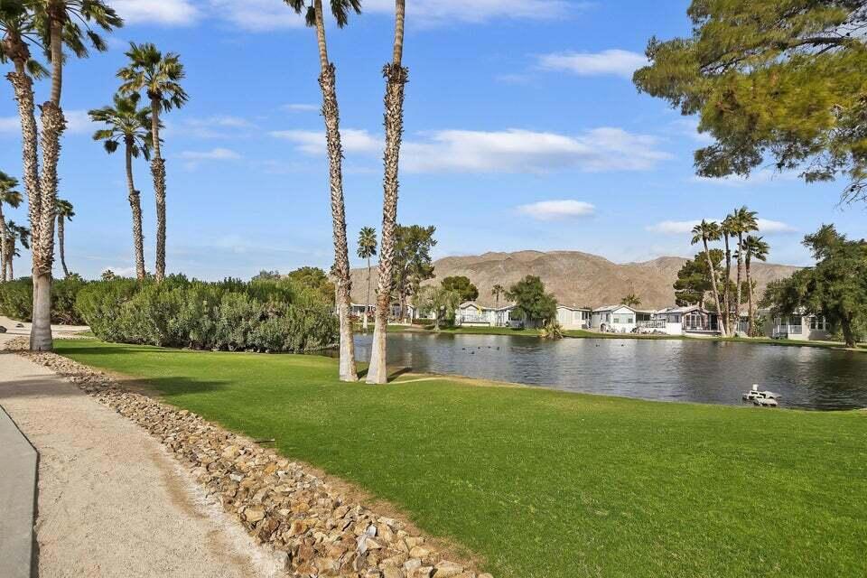 Welcome to Family Friendly 'Sky Valley Resort' This DMV registered Park Model is located on a huge corner lot with a beautiful lake and majestic mountain views. The lake view is spectacular in the evening with all of the lights as well as, during the day. Located just 1 block from the west side resort facilities. The same seasonal owners for 19 years, so no pets, no renters. Tastefully furnished (minus a few items) The California room that can be used for many venues to suit your needs. Ample storage inside the house and also with the over-sized shed. There is an amazing view of the lake from the living room, kitchen and porches. There are 2 porches and 3 additional outside spaces for entertaining, 2 parking spaces and enough room in the front yard to add a 3rd parking space. There is a new washer/dryer combo in the shed and an additional refrigerator. The shed is oversized and is very functional. New hot water tank, new furnace thermostat, recent service on LP line to the home, recent interior/exterior paint, new toilet and sink taps, diamond plate vanity, newer double insulated roof coat, new frosted privacy windows in the living area, newer flooring and carpet, new sub-floor on the deck and house. Enjoy freshly picked pink grapefruit and lemons from your own trees! This home lacks nothing and is immaculate! Enjoy the RARE and healing mineral water in the pools and spas, pickleball, tennis, open Desert hiking and beautiful lifestyle of Sky Valley Resort. The Desert has so much to offer! Warm Winters, PGA golf tournaments, music festivals, art festivals, Acrisure Arena, fine dining and shopping on El paseo or quaint Palm Springs! Perfect permanent home or warm Winter Getaway! No property taxes and a low monthly space rent of 920.00 per month!