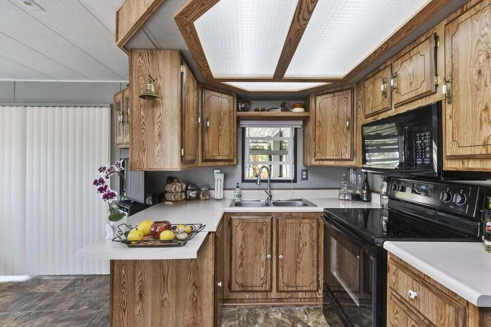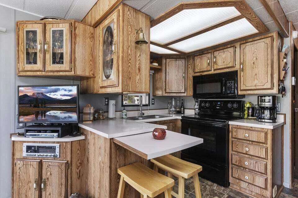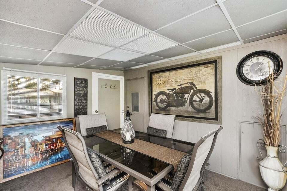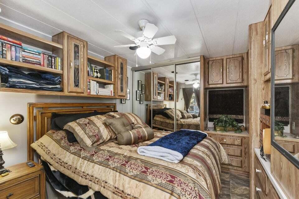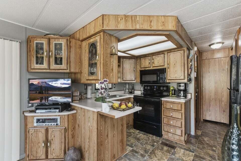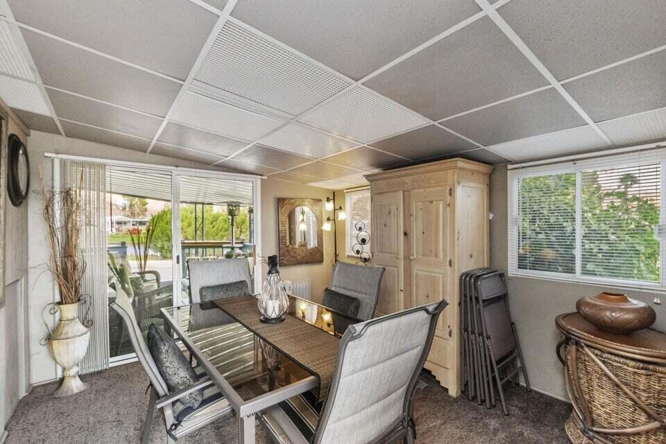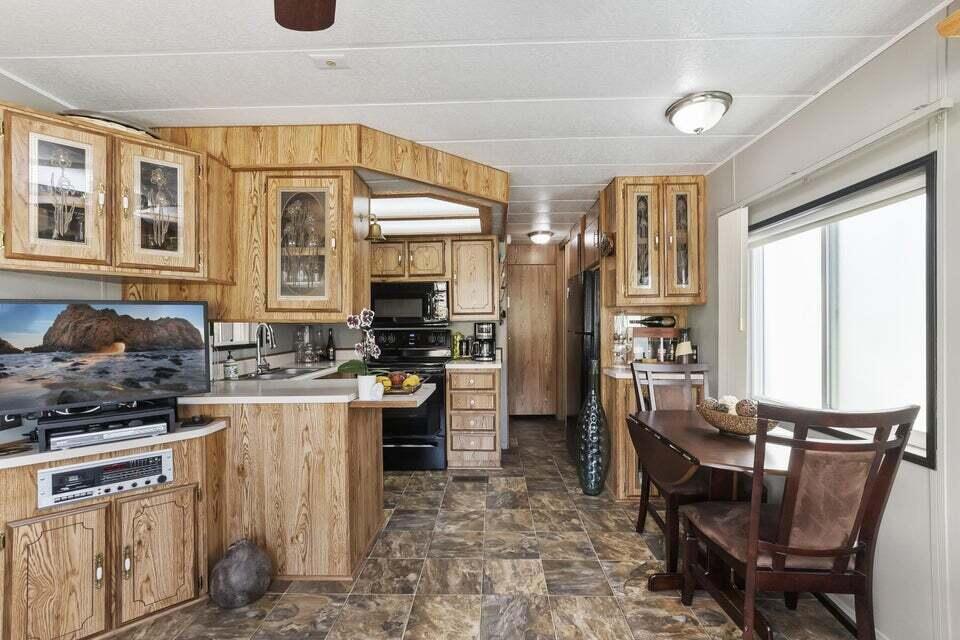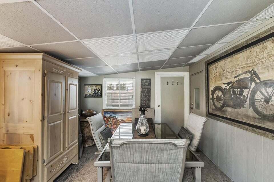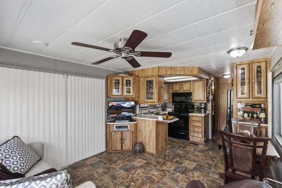 Welcome to Family Friendly 'Sky Valley Resort' This DMV registered Park Model is located on a huge corner lot with a beautiful lake and majestic mountain views. The lake view is spectacular in the evening with all of the lights as well as, during the day. Located just 1 block from the west side resort facilities. The same seasonal owners for 19 years, so no pets, no renters. Tastefully furnished (minus a few items) The California room that can be used for many venues to suit your needs. Ample storage inside the house and also with the over-sized shed. There is an amazing view of the lake from the living room, kitchen and porches. There are 2 porches and 3 additional outside spaces for entertaining, 2 parking spaces and enough room in the front yard to add a 3rd parking space. There is a new washer/dryer combo in the shed and an additional refrigerator. The shed is oversized and is very functional. New hot water tank, new furnace thermostat, recent service on LP line to the home, recent interior/exterior paint, new toilet and sink taps, diamond plate vanity, newer double insulated roof coat, new frosted privacy windows in the living area, newer flooring and carpet, new sub-floor on the deck and house. Enjoy freshly picked pink grapefruit and lemons from your own trees! This home lacks nothing and is immaculate! Enjoy the RARE and healing mineral water in the pools and spas, pickleball, tennis, open Desert hiking and beautiful lifestyle of Sky Valley Resort. The Desert has so much to offer! Warm Winters, PGA golf tournaments, music festivals, art festivals, Acrisure Arena, fine dining and shopping on El paseo or quaint Palm Springs! Perfect permanent home or warm Winter Getaway! No property taxes and a low monthly space rent of 920.00 per month!