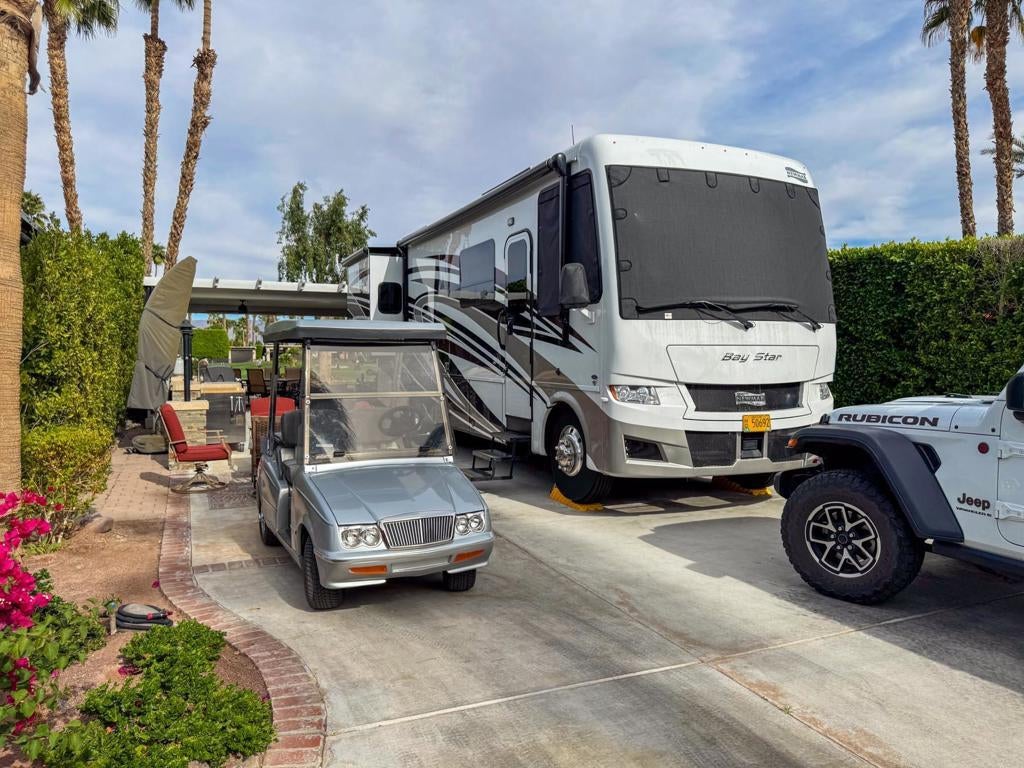 Nestled in a serene and private setting, this premium Class A RV lot offers the ultimate retreat with an expansive, unobstructed view of the lush golf course. Wake up to the perfect morning sun and enjoy the peaceful ambiance created by long privacy hedges on both sides. A solid-roof Alumawood pergola provides shade and comfort, complemented by two ceiling fans to keep you cool as you relax outdoors. Thoughtful landscaping enhances the beauty of the space, while a mounted outdoor TV lets you unwind in style. The lot is equipped with a solar-powered security camera for added peace of mind, and manual shades provide customizable privacy. Located just steps from the satellite pool, sauna, hot tub, showers, and laundry facilities, this property blends luxury, convenience, and community in an exclusive resort setting.Designed for both relaxation and entertaining, this lot features a well-appointed medium-sized outdoor kitchen with a dishwasher, burner, built-in BBQ, hot water, and a fridge--perfect for cooking and dining al fresco. Additional amenities include extra storage containers, two rolling storage carts, and two umbrellas to enhance your outdoor living experience. A negotiable golf cart, recently upgraded with new batteries last November and a protective cover, adds ease and convenience for exploring the resort. Whether you're seeking a quiet retreat or a vibrant social atmosphere, this property provides the perfect balance of privacy, luxury, and friendly community living for discerning Class A RV owners.‍Outdoor Resort Indio is a Class A RV resort.