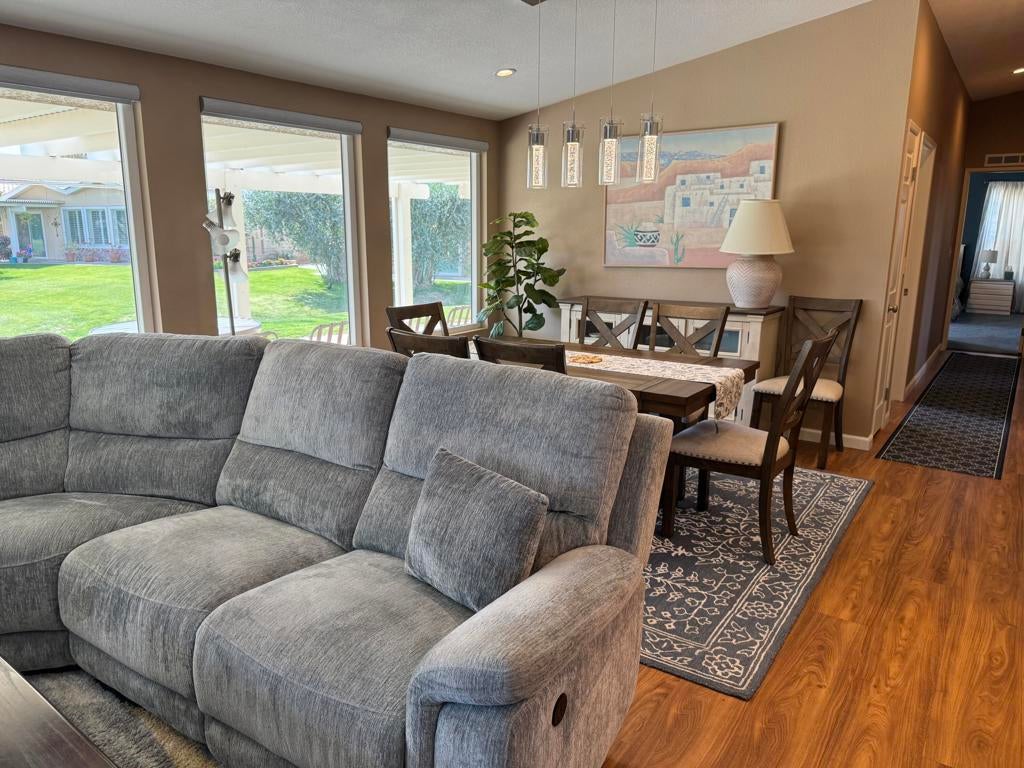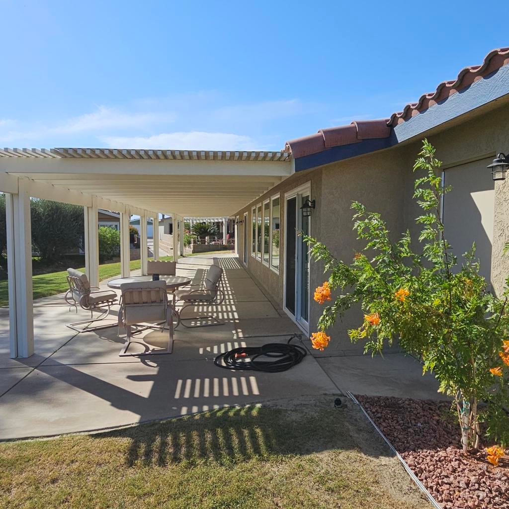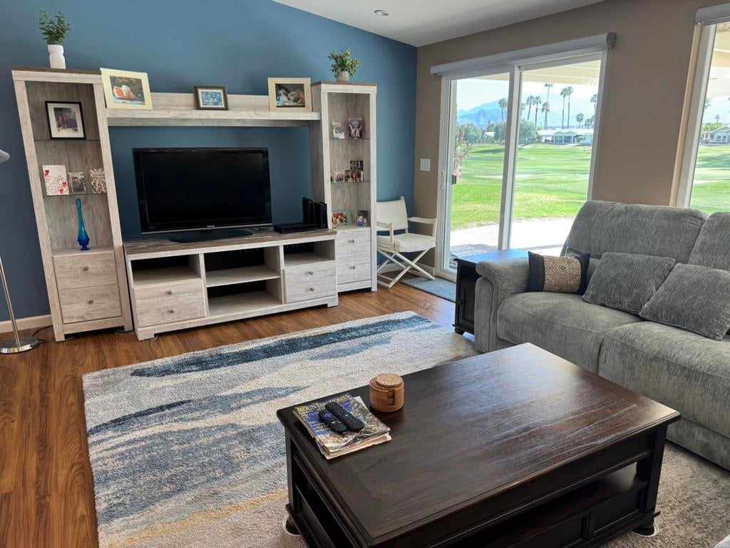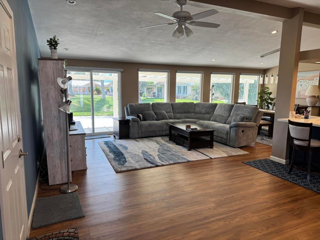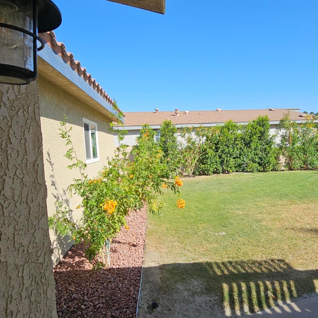 Welcome to this stunning, beautifully remodeled, Golf Course property located in the coveted 55+ community of Jack Ivey Ranch. This completely furnished, move-in-ready home offers everything you need for luxury living, including a golf cart, linens, bedding, dishes, and electronics. Set on a large, quiet 9,583 sq. ft. corner lot, this Mediterranean-style home boasts 2 bedrooms, 2 bathrooms, and a spacious office/den with a futon. This home has an open floorplan that provides ample space for both comfort and convenience. Enjoy panoramic views of the 10th Hole on the golf course, and the majestic San Jacinto and San Gorgonio Mountains from your expansive backyard patio. Inside, you'll find elegant upgrades such as new windows, fresh paint, new flooring throughout, stainless steel appliances, quartz countertops, and modern recessed lighting. With a new furnace and A/C (2022), a new water heater (2023), and a well-maintained landscape, this home is both beautiful and efficient. Located just steps away from the golf course and offering easy access to local amenities, this home is truly a gem. Don't miss the chance to own this beautifully remodeled home with breathtaking views in a peaceful and welcoming community! This home is being offered Turnkey Furnished. Ivey Ranch CC & GC, is a gated, senior community of manufactured homes integrated with a 9 hole golf course, Pro-shop, Driving Range, 4 community pools, 2 community spas, Club House and a Seasonal Restaurant. In Ivey Ranch you own the land.