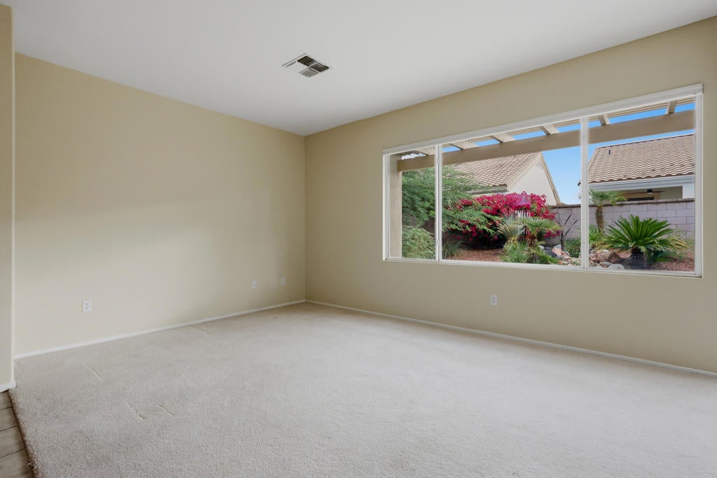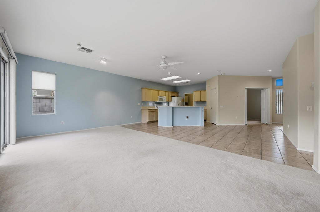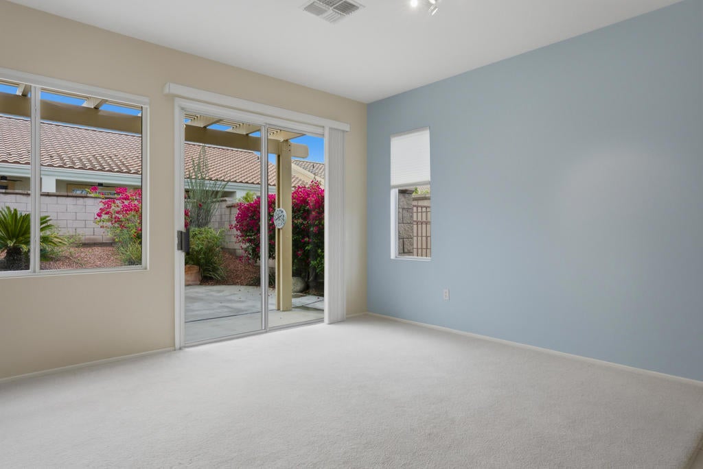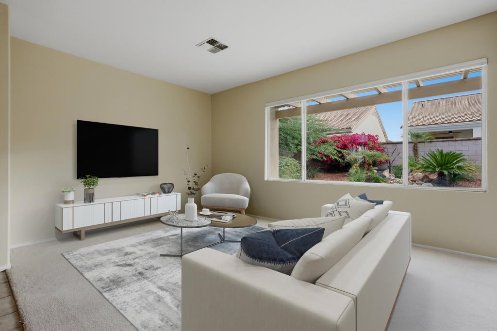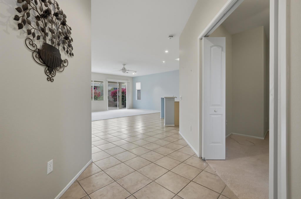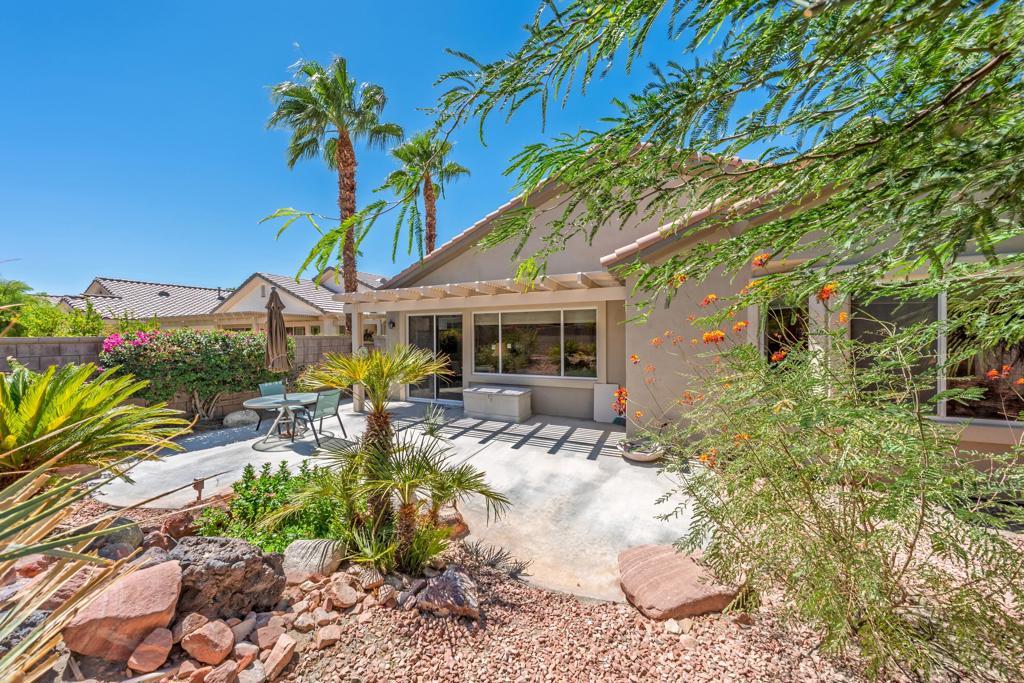 Sun City Palm Desert - St. Maarten. This sought-after St. Maarten greatroom floorplan offers 2 bedrooms, 2 bathrooms, plus a den. The spacious east-facing backyard features an extended patio with alumawood cover and lush desert landscaping for outdoor enjoyment. Updated exterior paint and vibrant flowering cacti enhance curb appeal. Inside, tile flooring extends throughout the main living areas, while the great room opens directly to the rear patio through sliding glass doors. The kitchen includes a chef's island with breakfast bar, Corian counters, a bright recipe window, and a pantry. Off the hallway, a generous den makes the perfect office or hobby space. The primary suite offers a bay window, large walk-in closet, and bathroom with sitting vanity and glass-enclosed shower. A guest bedroom with walk-in closet is adjacent to the full guest bath with tub/shower combo. Additional highlights include a laundry room with built-in storage, a 2-car garage with cabinetry, and a newer AC unit installed in 2019.
