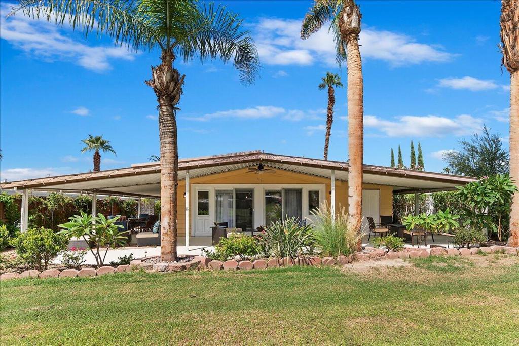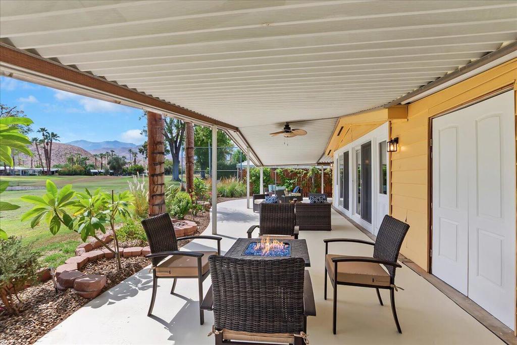 Designed to the 9's with Amazing Mountain & Sunset Views! Nestled within the premium ''back nine greens'' of the Date Palm Country Club, this extraordinary home resides directly on the community's epic Ted Robinson designer golf course with fabulous views of the Santa Rosa andSan Jacinto Mountains. Overlooking a lovely fairway pond with sparklingfountain, the spacious wrap-around covered patio is literally an entertainer'sdelight with an abundance of space to host an evening amongst friends orto indulge in a private picturesque morning with a cup of coffee. Uponentering one is greeted by an inviting coastal-rustic themed interior, with ahint of retro, coupled with a remarkable amount of natural light that illumesfrom the dual sliding patio doors. The fresh, modern paint colors, stunningaccessories and ideal accents throughout the inside and outside permeate anew yet timeless charm and appeal that will be appreciated every day thishome is your very own. The elegantly upgraded living room with vaultedceilings, custom fireplace wall and richly refined full bar with stylish stoolsmakes a wonderful indoor oasis for creating cherished moments or a relaxingretreat. Dine in style seated at the custom banquette dining area just off theimmaculate kitchen that boasts quartz-countertops throughout, a chicbreakfast bar, stainless-steel appliances, fashionable fixtures, and whiteshaker cabinets with gorgeous gold handles. The luxurious primary suiteoffers both her and his closets in addition to a phenomenal master bath witha contemporary tiled shower, free standing soaking tub, and dual vanity with a brilliant touch-lit mirror. The spacious second bedroom provides a mirror-wall closet and direct access to the exquisite guest bath with an ovation-curved shower/tub. Adding to the convenience and value of this incrediblehome is a third bedroom that can be used as an office, den, or guest roomfor the grandkids. The indoor laundry room includes a stainless-steel basinadjacent to a space saving stacked washer and dryer. All the old windowsthroughout have been replaced with new insulated windows that include alifetime warranty. The old lawn sprinklers have been upgraded to a reliableeasy-to-program irrigation system to maintain the vast amount of new lushlandscaping. Most impressively this amazing property is primarily poweredby solar panels leased at only $119 per month. An opportunity of a lifetimefor those