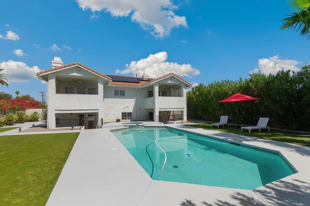 Stunning split level pool home offers great curb appeal with fully gated front yard and driveway, and low maintenance rockscape and cactus landscaping. The interior features vaulted ceilings with recessed lights, plank floors in the main living areas, 2 primary bedrooms, and many upgrades throughout including a new A/C unit in 2024. The formal entry has a gorgeous chandelier, take the staircase up to the main floor with spacious living room with fireplace and updated kitchen offering white cabinetry, stainless steel appliances, tile backsplash, and a center island with bar seating. There is a balcony with views of the backyard and pool. The primary suite is also located on the 2nd floor and also offers a private balcony, a 2-way fireplace and a spa-like ensuite with fireplace, 2 pedestal sinks, a soaking tub, and a walk-in closet with built-in storage. Downstairs you will find a bonus room with a kitchenette - great for guests or hosting parties, there is a fireplace, a private covered patio, a full-size bathroom, the laundry room, plus 2 more bedrooms with 1 bedroom including a private ensuite. The gorgeous backyard is like your own private resort with in-ground pool and spa, turf grass, covered pergola, palm trees, lush privacy hedge, and new landscape lighting installed in 2024! There is also an attached, insulated, 2-car garage with A/C! Located on a large corner lot, and no HOA fees, schedule your private tour today!