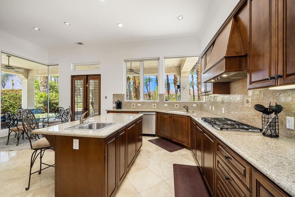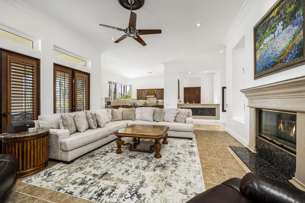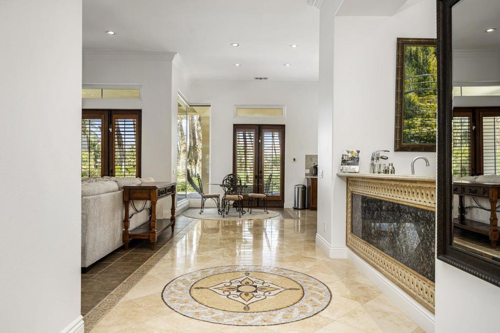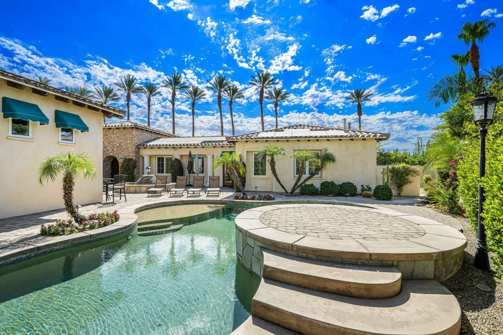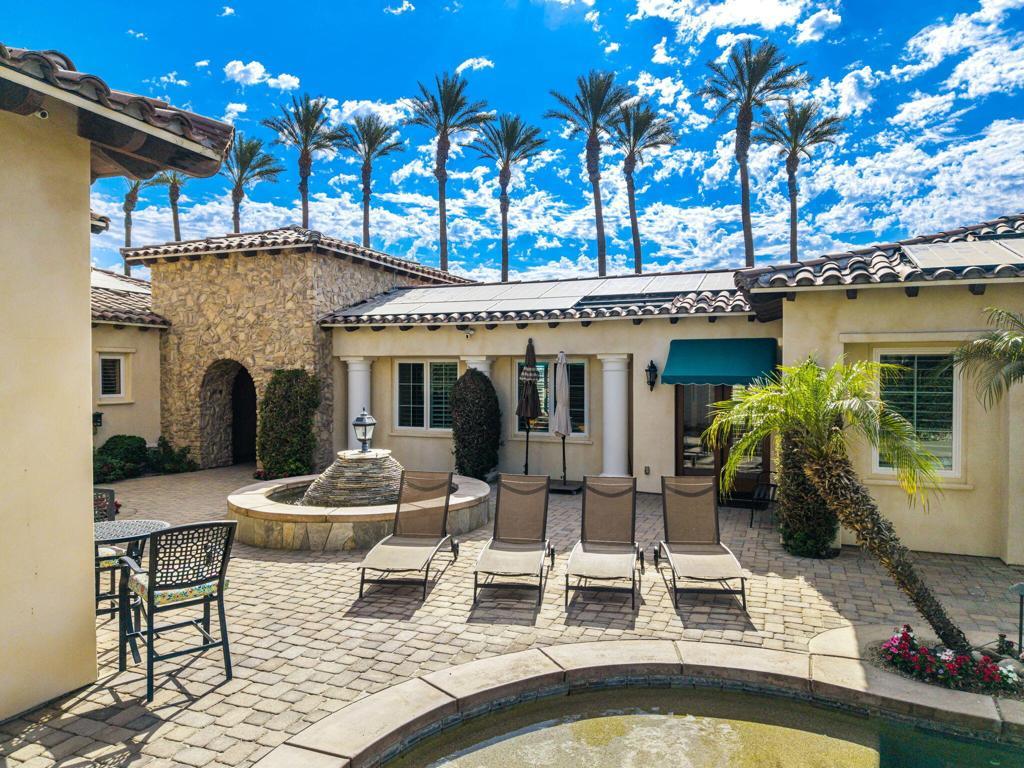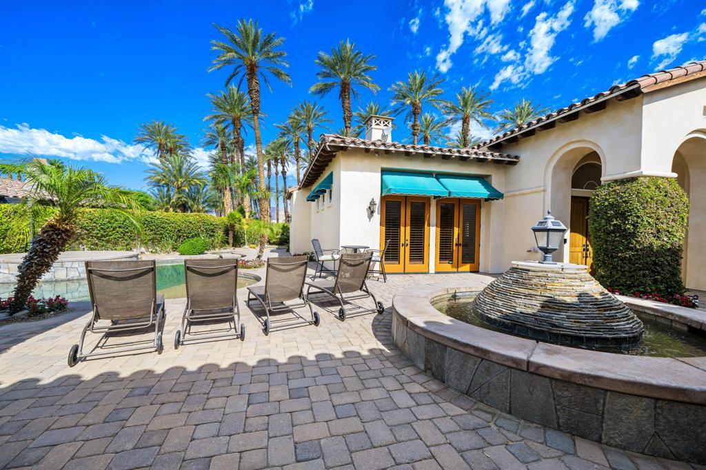 Experience the pinnacle of resort-style country club living at 56985 Village Drive, located in the highly sought-after Palms Country Club. This fully furnished, European Chateau-inspired estate offers 4 bedrooms, 4.5 bathrooms, and a private casita with its own entrance, kitchenette, dining, living, office area, bedroom, and spa-like bathroom with soaking tub, ideal for guests, extended family, or long-term visitors. Every detail of this home has been designed for comfort, elegance, and entertaining. Enter through a monumental private wooden gate into a grand courtyard featuring a central fountain, setting the tone for a residence that blends sophistication with timeless charm. Inside, the formal entryway opens to a formal living room with a billiards table and double-sided fireplace. To the right, a formal dining room, and off the kitchen, the breakfast room which offers expansive windows overlooking the golf course, offering stunning views of the greens, mountains, and palm trees. The chef's kitchen is a culinary dream, featuring a Sub-Zero refrigerator, commercial-grade stainless steel appliances, dual sinks, an eat-up island, and abundant custom built-ins. The residence also includes a large wet bar with wine fridge, perfect for entertaining family and friends. The primary suite serves as a private retreat, with a spa-like bathroom complete with dual vanities, soaking tub, shower, and a generous walk-in closet. Two additional bedrooms provide ample space, while multiple skylights, custom shutters, and ceiling fans throughout the home create an atmosphere of elegance and comfort. A spacious laundry room and 3-car garage, including room for a golf cart, add convenience and practicality. Step outside to a backyard that opens directly onto the golf course, surrounded by mature, lush landscaping. Stone pavers guide you through multiple entertaining areas, including a large covered patio with cathedral ceilings and ceiling fans, and an outdoor built-in BBQ. The pool area is a showstopper, with a large baja shelf, a river-style water feature that wraps around the property, and a waterfall spa. This estate provides seamless access to La Quinta's premier country club amenities, including a lively social calendar, clubhouse, dining, shopping, and nearby equestrian venues, polo fields, and tennis garden. Designed for those who desire luxury, privacy, and an elevated lifestyle, 56985 Village Drive is the ultimate combination of sophistication and desert charm.