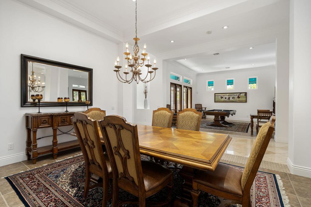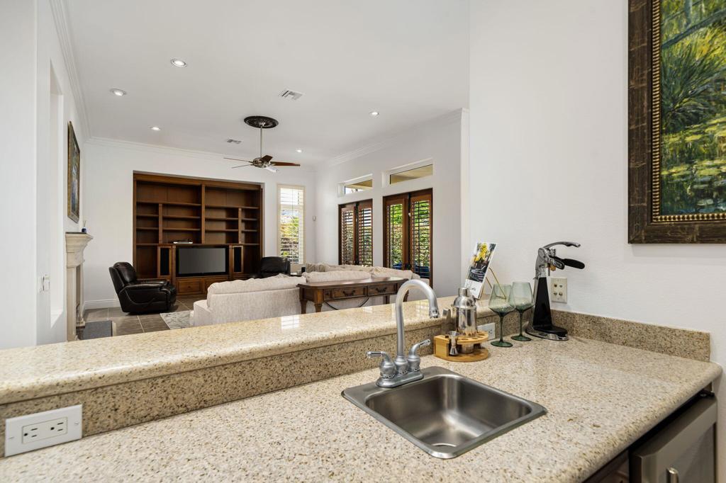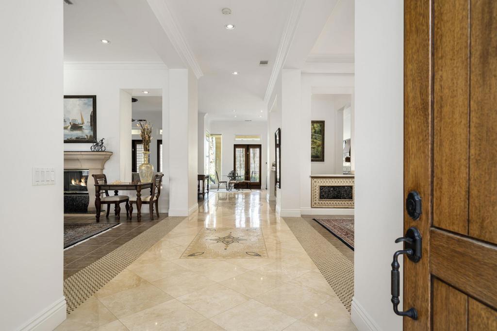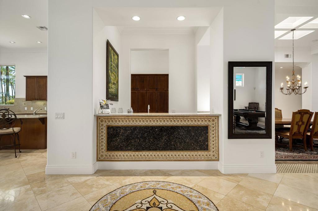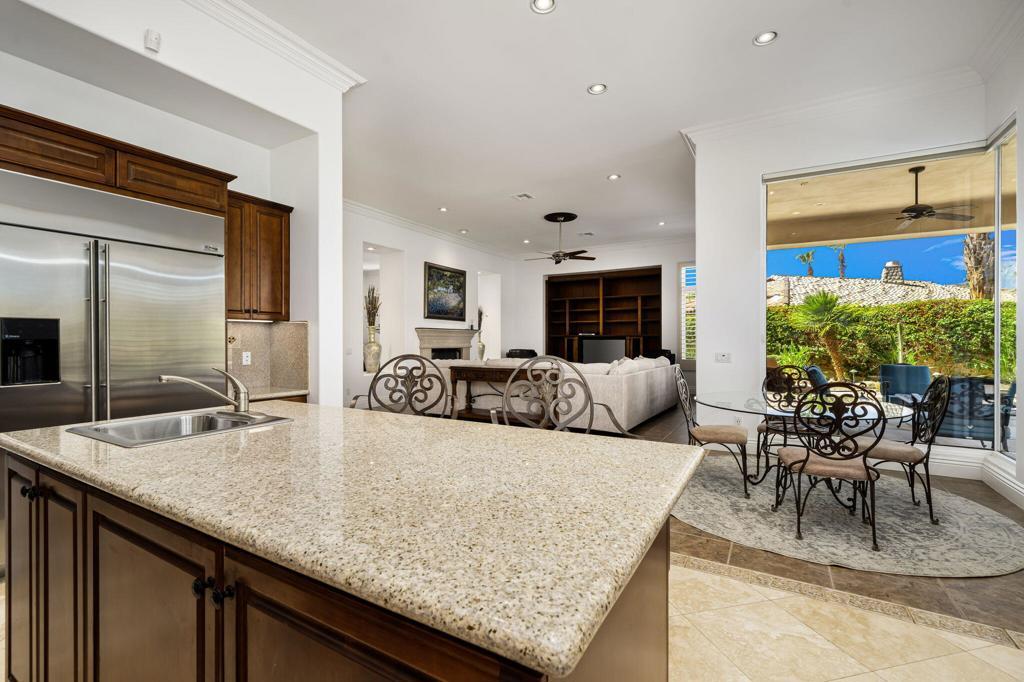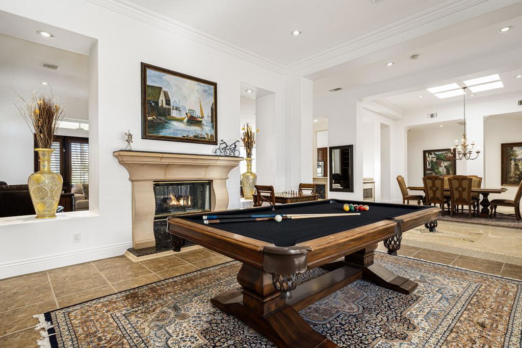 Experience the pinnacle of resort-style country club living at 56985 Village Drive, located in the highly sought-after Palms Country Club. This fully furnished, European Chateau-inspired estate offers 4 bedrooms, 4.5 bathrooms, and a private casita with its own entrance, kitchenette, dining, living, office area, bedroom, and spa-like bathroom with soaking tub, ideal for guests, extended family, or long-term visitors. Every detail of this home has been designed for comfort, elegance, and entertaining. Enter through a monumental private wooden gate into a grand courtyard featuring a central fountain, setting the tone for a residence that blends sophistication with timeless charm. Inside, the formal entryway opens to a formal living room with a billiards table and double-sided fireplace. To the right, a formal dining room, and off the kitchen, the breakfast room which offers expansive windows overlooking the golf course, offering stunning views of the greens, mountains, and palm trees. The chef's kitchen is a culinary dream, featuring a Sub-Zero refrigerator, commercial-grade stainless steel appliances, dual sinks, an eat-up island, and abundant custom built-ins. The residence also includes a large wet bar with wine fridge, perfect for entertaining family and friends. The primary suite serves as a private retreat, with a spa-like bathroom complete with dual vanities, soaking tub, shower, and a generous walk-in closet. Two additional bedrooms provide ample space, while multiple skylights, custom shutters, and ceiling fans throughout the home create an atmosphere of elegance and comfort. A spacious laundry room and 3-car garage, including room for a golf cart, add convenience and practicality. Step outside to a backyard that opens directly onto the golf course, surrounded by mature, lush landscaping. Stone pavers guide you through multiple entertaining areas, including a large covered patio with cathedral ceilings and ceiling fans, and an outdoor built-in BBQ. The pool area is a showstopper, with a large baja shelf, a river-style water feature that wraps around the property, and a waterfall spa. This estate provides seamless access to La Quinta's premier country club amenities, including a lively social calendar, clubhouse, dining, shopping, and nearby equestrian venues, polo fields, and tennis garden. Designed for those who desire luxury, privacy, and an elevated lifestyle, 56985 Village Drive is the ultimate combination of sophistication and desert charm.