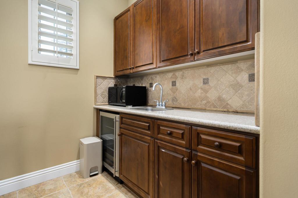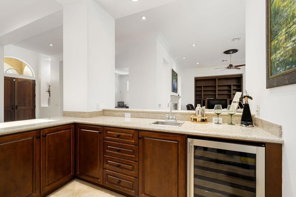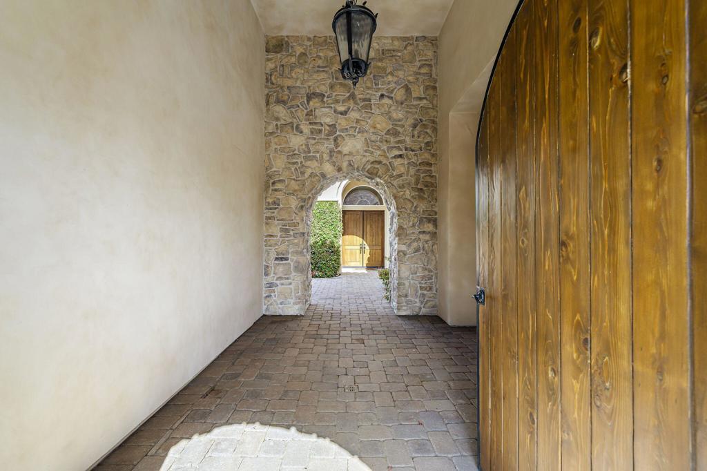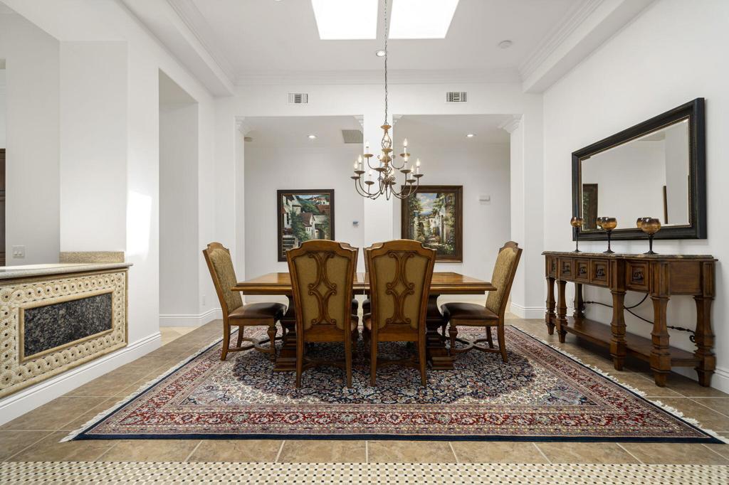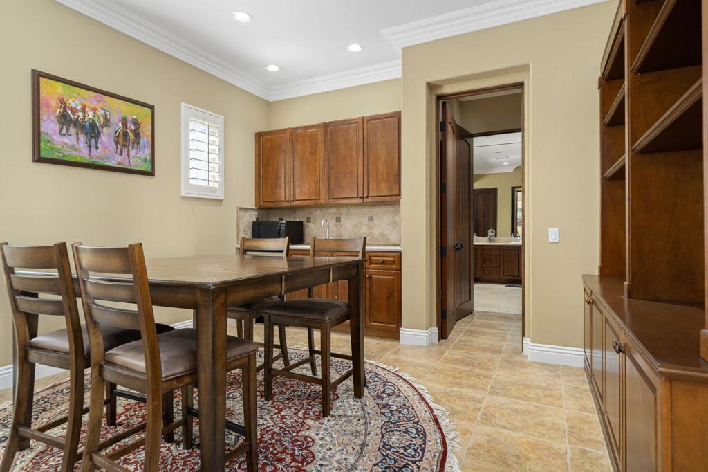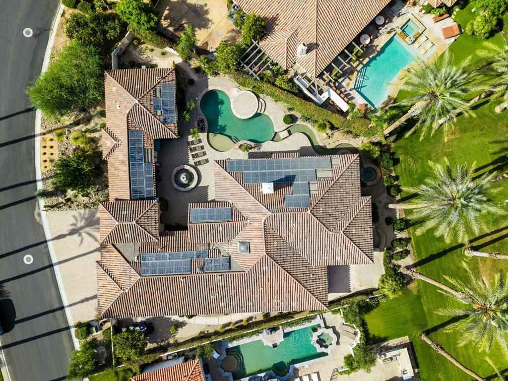Experience the pinnacle of resort-style country club living at 56985 Village Drive, located in the highly sought-after Palms Country Club. This fully furnished, European Chateau-inspired estate offers 4 bedrooms, 4.5 bathrooms, and a private casita with its own entrance, kitchenette, dining, living, office area, bedroom, and spa-like bathroom with soaking tub, ideal for guests, extended family, or long-term visitors. Every detail of this home has been designed for comfort, elegance, and entertaining. Enter through a monumental private wooden gate into a grand courtyard featuring a central fountain, setting the tone for a residence that blends sophistication with timeless charm. Inside, the formal entryway opens to a formal living room with a billiards table and double-sided fireplace. To the right, a formal dining room, and off the kitchen, the breakfast room which offers expansive windows overlooking the golf course, offering stunning views of the greens, mountains, and palm trees. The chef's kitchen is a culinary dream, featuring a Sub-Zero refrigerator, commercial-grade stainless steel appliances, dual sinks, an eat-up island, and abundant custom built-ins. The residence also includes a large wet bar with wine fridge, perfect for entertaining family and friends. The primary suite serves as a private retreat, with a spa-like bathroom complete with dual vanities, soaking tub, shower, and a generous walk-in closet. Two additional bedrooms provide ample space, while multiple skylights, custom shutters, and ceiling fans throughout the home create an atmosphere of elegance and comfort. A spacious laundry room and 3-car garage, including room for a golf cart, add convenience and practicality. Step outside to a backyard that opens directly onto the golf course, surrounded by mature, lush landscaping. Stone pavers guide you through multiple entertaining areas, including a large covered patio with cathedral ceilings and ceiling fans, and an outdoor built-in BBQ. The pool area is a showstopper, with a large baja shelf, a river-style water feature that wraps around the property, and a waterfall spa. This estate provides seamless access to La Quinta's premier country club amenities, including a lively social calendar, clubhouse, dining, shopping, and nearby equestrian venues, polo fields, and tennis garden. Designed for those who desire luxury, privacy, and an elevated lifestyle, 56985 Village Drive is the ultimate combination of sophistication and desert charm.