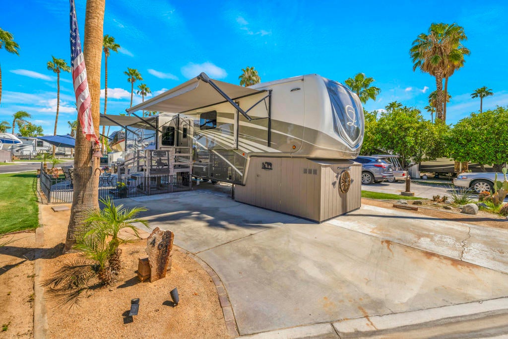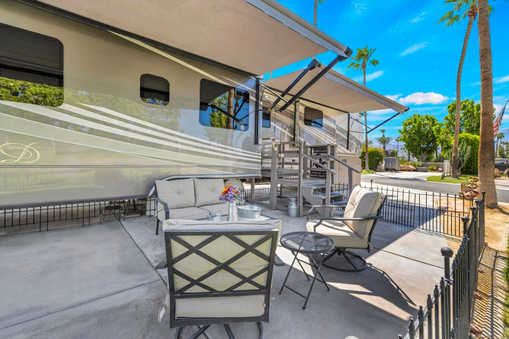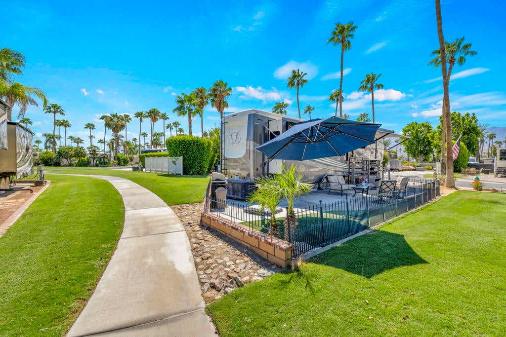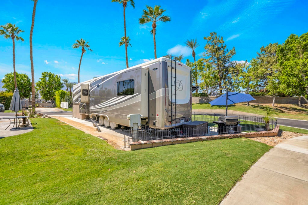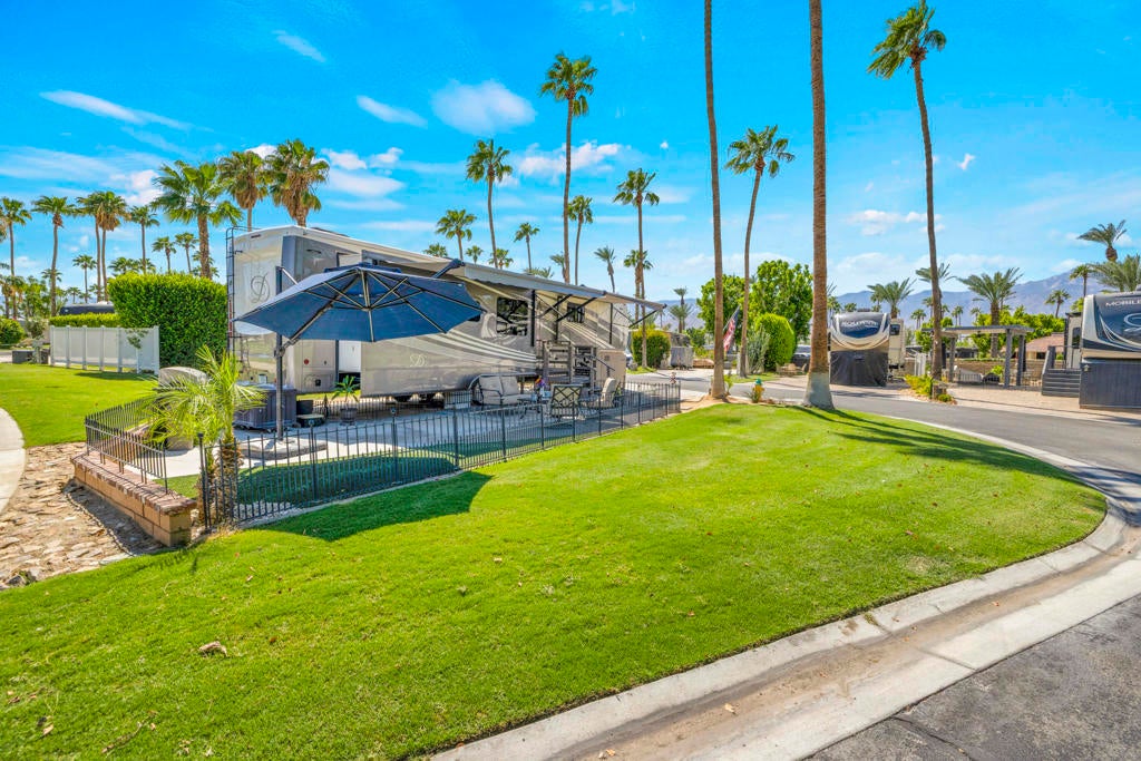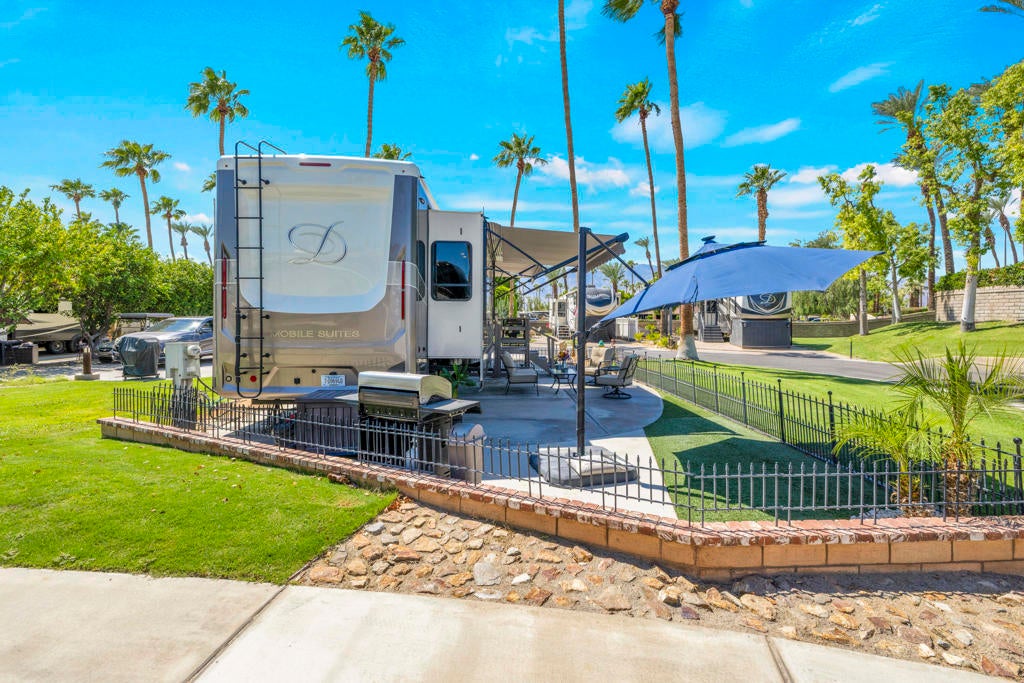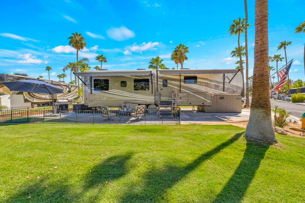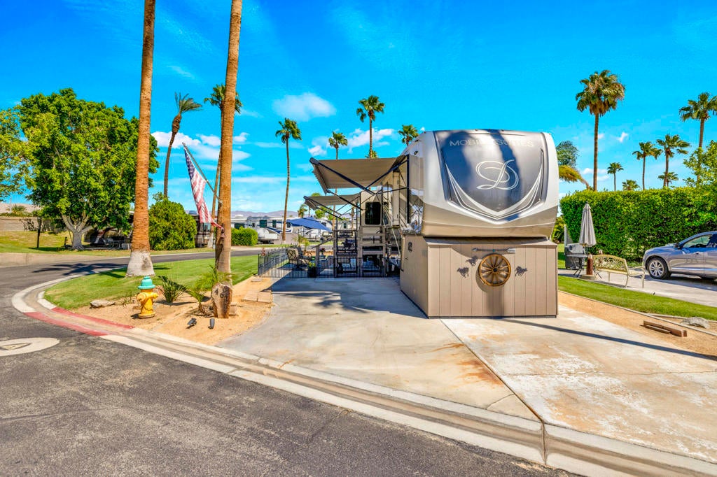 Experience the epitome of the Palm Springs lifestyle with this truly amazing, turn-key RV package. This expanded corner lot is a prime find, situated near the front of the resort for effortless entry and exit. The property is a lush and private sanctuary, with gorgeous greenbelt on both the side and behind, creating a tranquil setting. Enjoy stunning, unobstructed mountain views from the comfort of your patio.The package includes a luxurious 2021 DRV Mobile Suites Santa Fe, an RV known for its high-end finishes and spacious design. This offering comes complete with everything you need for immediate enjoyment: steps, a storage shed, a BBQ grill, washer/dryer, dog fencing, comfortable patio furniture, and a western golf cart for easy resort navigation. Simply bring your clothes and a toothbrush to start living your desert dream.Outdoor Resorts Palm Springs is a Five Star RV Resort Community combining luxury with affordability. It is a guard gated resort that sits on 137 beautifully landscaped acres with 27 holes of executive golf, 10 tennis courts, 13 pickleball courts, 8 swimming pools, a fully equipped fitness center, espresso bar, sports bar, beauty salon/barber shop, full-service restaurant, convenience store, 2 club houses, activities, special events and so much more.