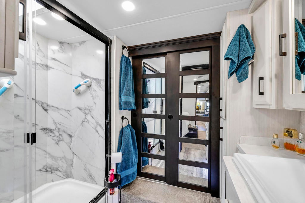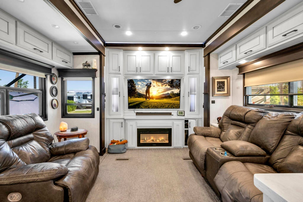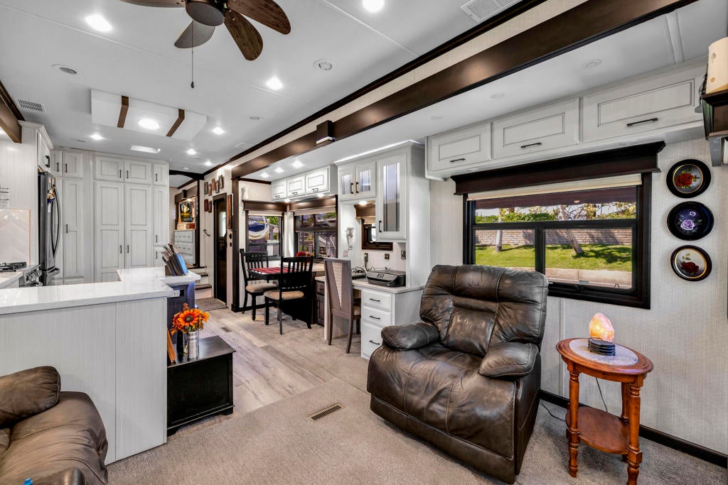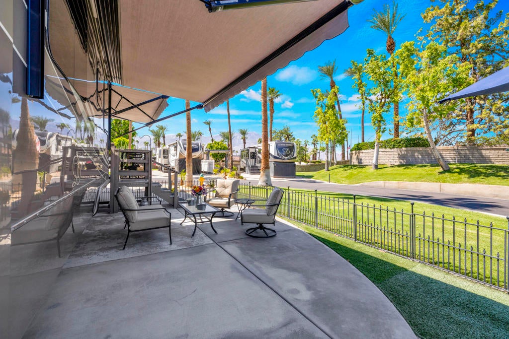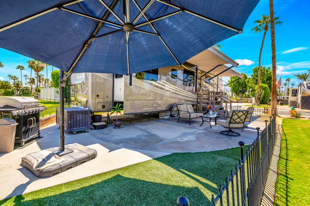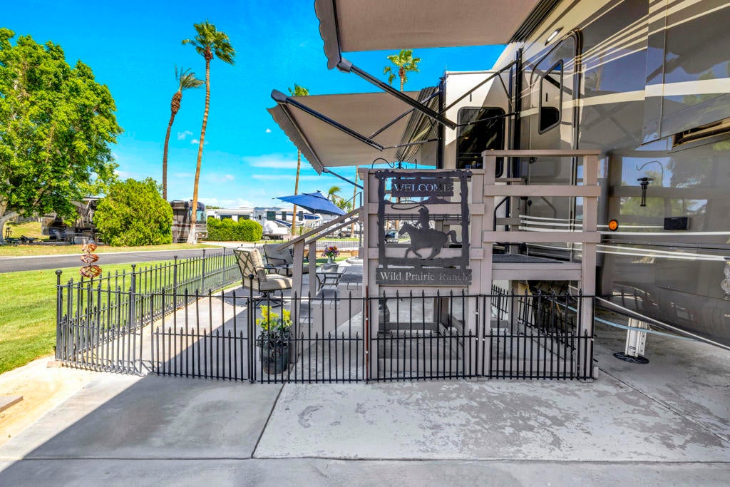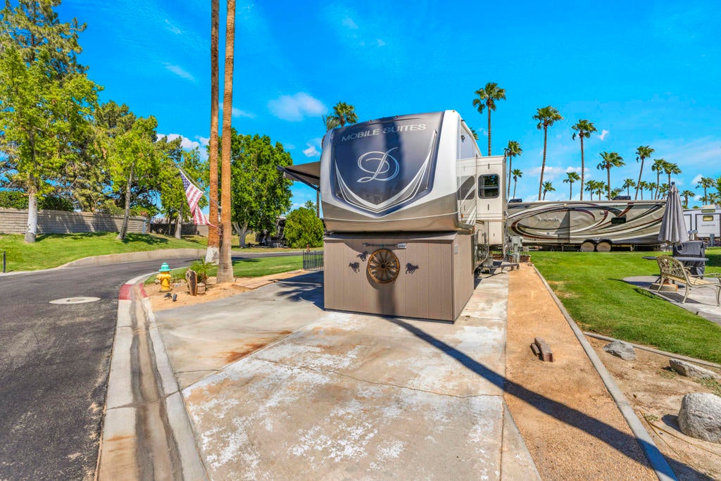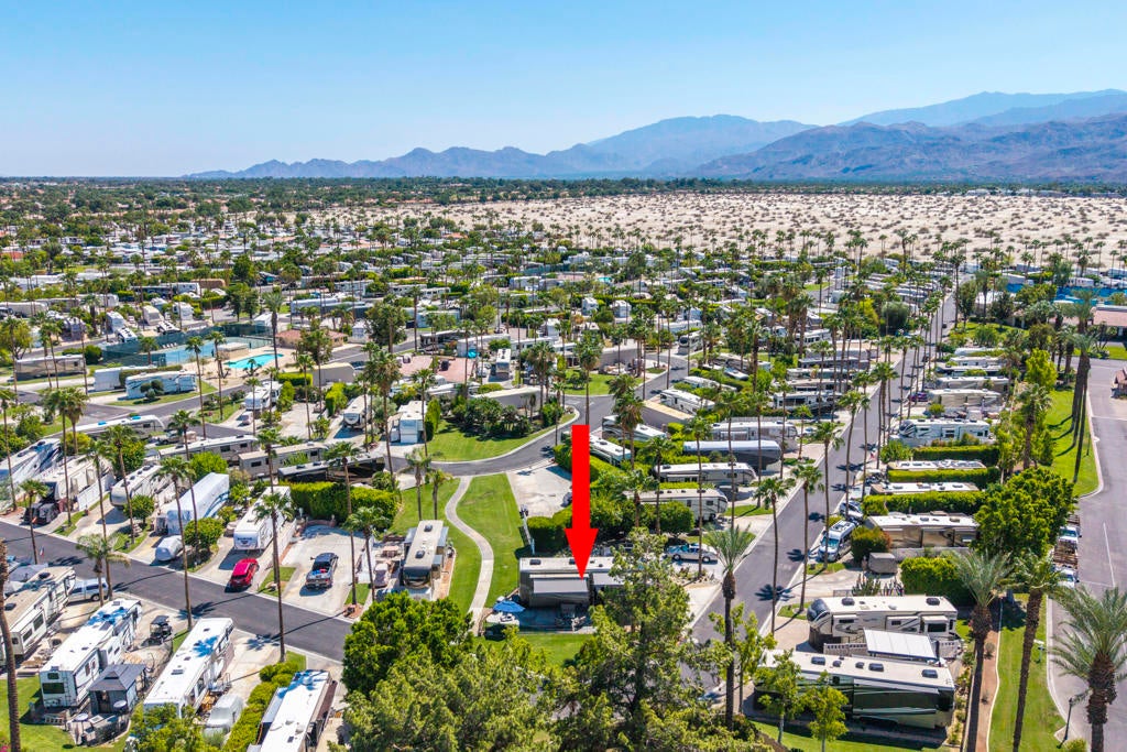 Experience the epitome of the Palm Springs lifestyle with this truly amazing, turn-key RV package. This expanded corner lot is a prime find, situated near the front of the resort for effortless entry and exit. The property is a lush and private sanctuary, with gorgeous greenbelt on both the side and behind, creating a tranquil setting. Enjoy stunning, unobstructed mountain views from the comfort of your patio.The package includes a luxurious 2021 DRV Mobile Suites Santa Fe, an RV known for its high-end finishes and spacious design. This offering comes complete with everything you need for immediate enjoyment: steps, a storage shed, a BBQ grill, washer/dryer, dog fencing, comfortable patio furniture, and a western golf cart for easy resort navigation. Simply bring your clothes and a toothbrush to start living your desert dream.Outdoor Resorts Palm Springs is a Five Star RV Resort Community combining luxury with affordability. It is a guard gated resort that sits on 137 beautifully landscaped acres with 27 holes of executive golf, 10 tennis courts, 13 pickleball courts, 8 swimming pools, a fully equipped fitness center, espresso bar, sports bar, beauty salon/barber shop, full-service restaurant, convenience store, 2 club houses, activities, special events and so much more.