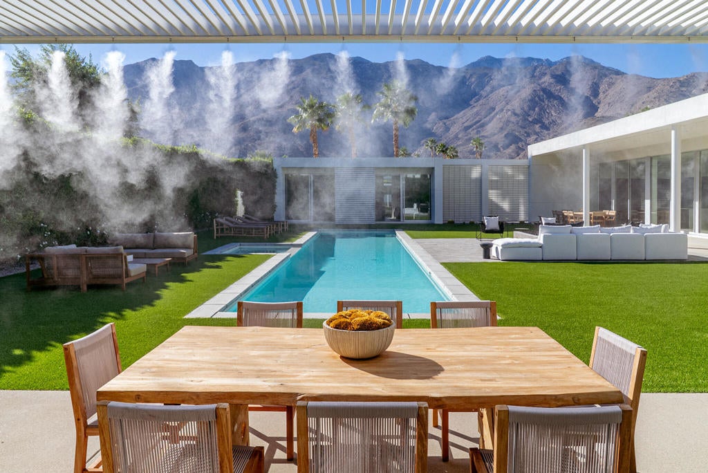 Rare offering within LINEA, a private gated community of only 14 homes in south Palm Springs. 3088 Linea Terrace features minimalist architecture with an artist's attention to visual rhythm, massing and scale. Anchored by a 90-foot expanse of oversized Fleetwood glass sliders facing a 60-foot lap pool, the proportions are grand and harmonious. Linea is an exceptional neighborhood - 14 all white modern homes sited for maximum privacy. 3088 Linea Terrace has perhaps the best street presence - elevated lot, stunning colonnade -- and features the award-winning G floor plan. The soul of this home is its simplicity. The design is clean and bold, the spaces expansive, the landscape low-maintenance. The setting in Andreas Hills is epic, just minutes from central Palm Springs, nestled between mountains on all sides. Four bedrooms and five baths. The main house features the primary suite and two well-separated guest suites, as well as a dedicated media room. The attached one-bedroom casita has its own street entrance. Linea has its own private gate but the HOAs are very low, and you own the land. Three-car garage, fully owned solar, pergola with outdoor kitchen (including wet bar, grill and refrigerator), outdoor shower, covered patio with misters, enormous steam shower in primary. Built for entertainment or your fortress of solitude, minutes from downtown Palm Springs and all its amenities.