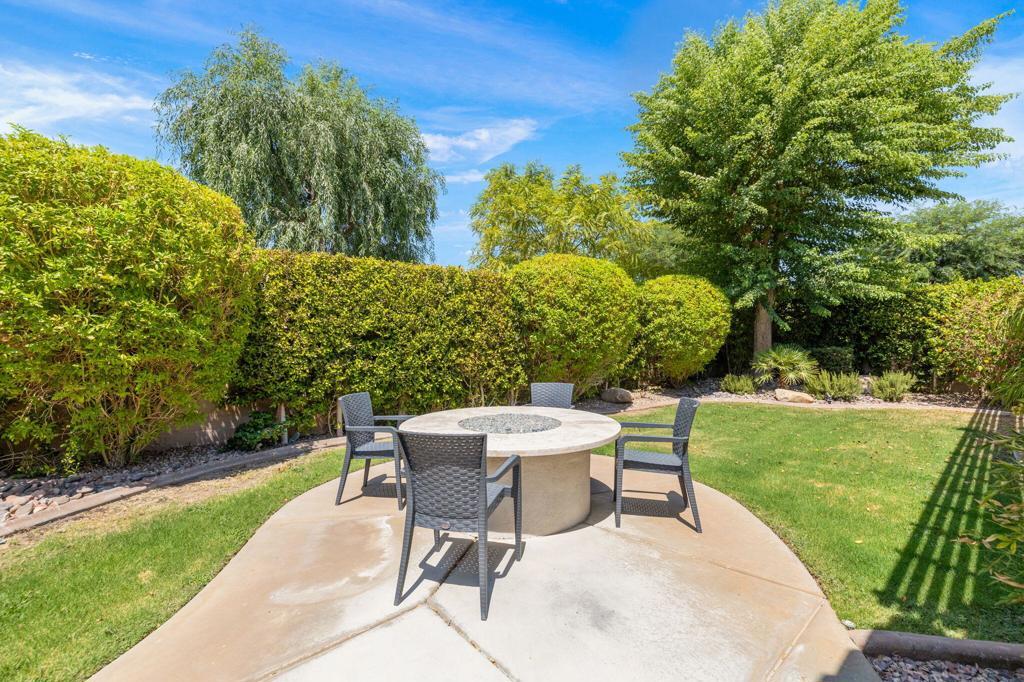 Prepare to be wowed! This is truly one of the most spectacular, extensively upgraded homes you'll find in all of Sun City Shadow Hills. This coveted Merida floor plan boasts three bedrooms, a spacious den, two baths, and nearly 2,400 square feet of pure luxury--meticulously remodeled with the finest materials and designer touches at every turn. From the moment you step inside, you're welcomed by the gleam of elegant custom Italian tile flowing effortlessly throughout the living areas. The formal dining room, large enough to host the entire family for holidays and celebrations, sets the stage for the warmth and sophistication that fill every inch of this home. At the heart of it all lies the ultimate chef's dream kitchen--an open-concept masterpiece featuring dazzling natural quartzite countertops, a double-slab extended island perfect for entertaining, custom cabinetry, under-cabinet lighting, a stylish coffee bar, and high-end KitchenAid appliances. Just steps away, the living room invites you to gather around a dramatic stacked stone fireplace that radiates comfort and charm. Privacy and comfort are perfectly balanced here. The guest bedrooms and bath are thoughtfully tucked away, each dressed in plush Berber carpet, complete with king-size accommodations and custom wood shutters. The primary suite is a sanctuary all its own--offering room for designer furnishings and a spa-like bath you'll never want to leave. Indulge in the oversized walk-in shower with seamless glass, the matching quartzite countertops, exquisite lighting, and a walk-in closet that will stop you in your tracks. And the upgrades? They just keep coming--full-home water filtration, freshly painted exterior, a brand-new 16 SEER A/C system, and even an air-conditioned garage to beat the summer heat. Every detail has been designed for beauty, comfort, and ease. The backyard boasts an exteded patio space with Alumawood covering, quaint built-in gas fire pit and all wrapped in the serene privacy of a lush, beautifully maintained natural oasis! This isn't just a home--it's a statement. A showpiece. A place where luxury meets everyday living. Opportunities like this don't come around often, so act fast--your dream home is waiting!