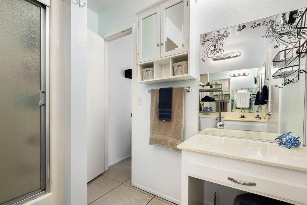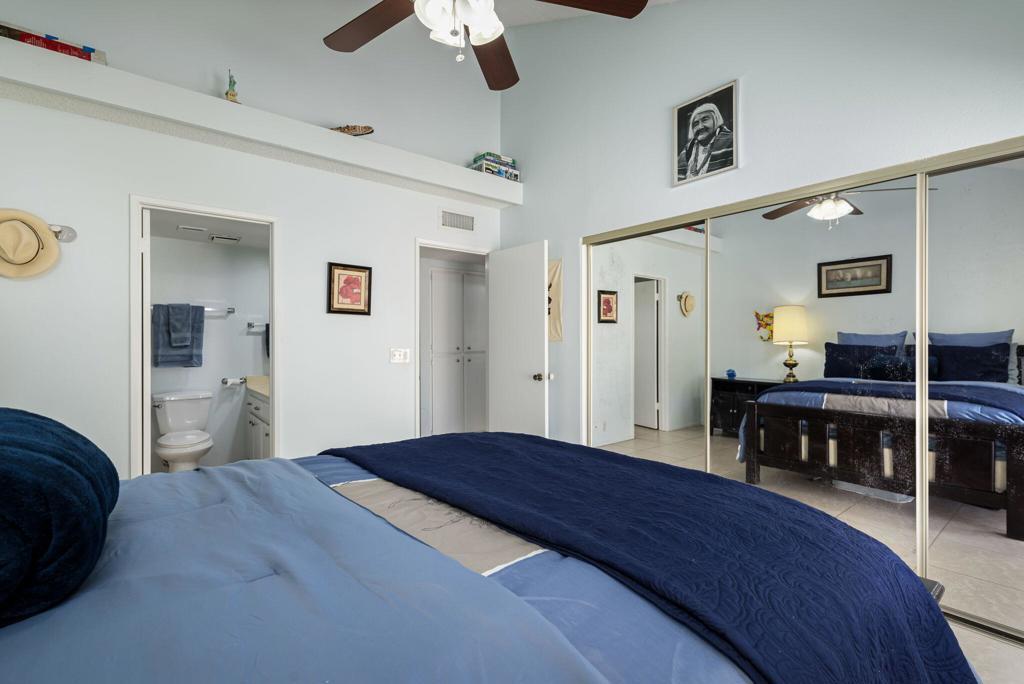 Turnkey furnished 2 bed 2 bath condo in Indian Palm Country Club, nestled among 27 holes of premier golf. Each bedroom features an attached bath and direct access to private patios, perfect for relaxation. Enjoy cathedral ceilings, all-tile floors, and ceiling fans throughout. The great room boasts and electric fireplace for cozy desert night, complemented by a light-filled open layout. Entertain effortlessly with a wet bar and a kitchen featuring a breakfast bar. . Convenient in unit laundry, two patios for morning coffee or vibrant desert sunsets, a onecar garage and an additional carport. Ideally situated on the golf course, directly across from the community pool. Your desert oasis awaits.