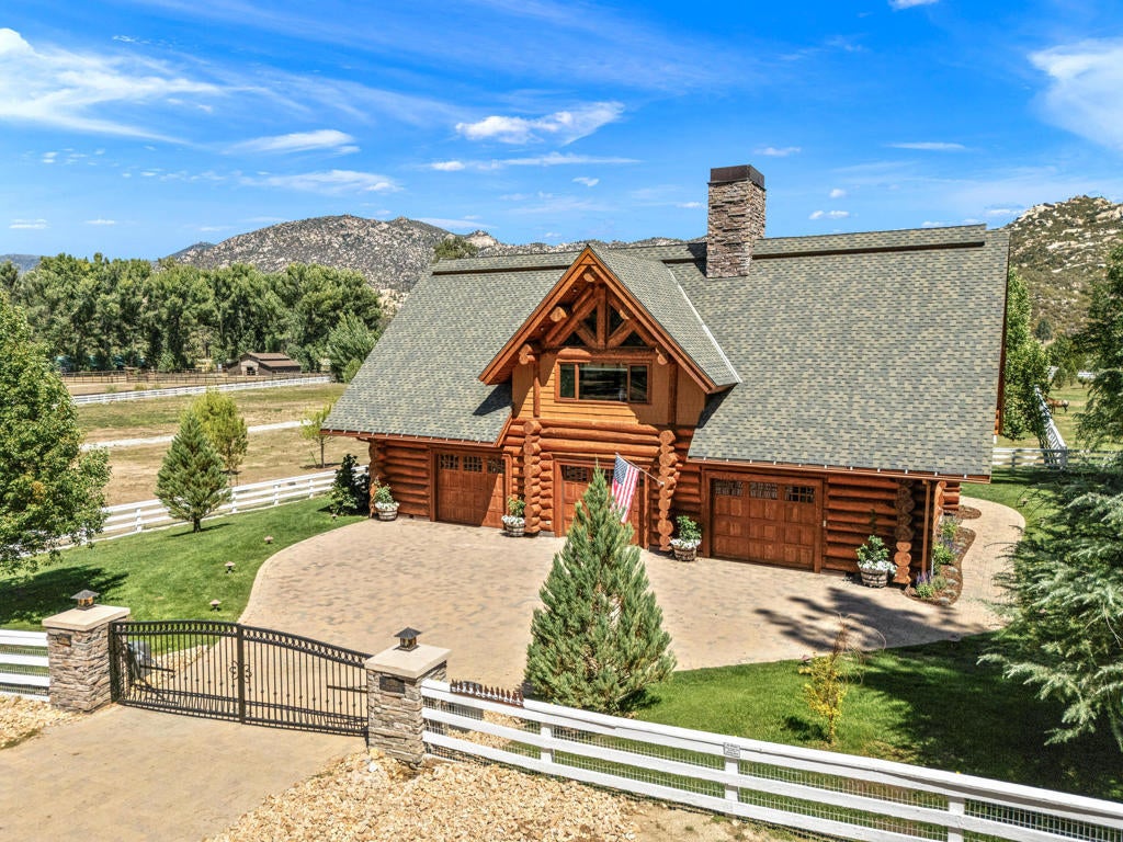 Tucked away in Garner Valley, this handcrafted log estate pairs rustic charm with refined luxury. Not just a home, but a true mountain retreat -- this 9.56-acre equestrian estate in Garner Valley offers privacy, views, and craftsmanship rarely seen today. The handcrafted log residence spans 2,472 sq. ft. with 3 bedrooms and 4 bathrooms, soaring ceilings, a dramatic stone fireplace, and French doors that open to a deck framing the San Jacinto Mountains. Out every window, you'll find a mountain view with endless skies. The kitchen blends rustic character with modern ease: custom cabinetry, granite counters, and premium appliances set the stage for memorable gatherings. Warm woodwork pairs beautifully with thoughtfully selected custom wallpaper, adding a touch of elegance and personality. The primary suite feels like a spa getaway with its stone bath, and soaking tub. While the upstairs guest suite enjoys its own dedicated bath. The downstairs guest suite features its own en-suite bath and a private deck overlooking the pastures, complete with a jacuzzi for ultimate relaxation. Equestrian amenities include a six-stall barn with tack room, half bath, and dog wash, plus turnouts and a round pen. Additional property features include a full RV barn, dedicated kennels, a steel pole barn, and a whole-house Generac generator for peace of mind during power outages. From the back deck, you can watch your horses graze, or saddle up and ride directly onto miles of scenic trails right from your own backyard. At the heart of the property lies a stocked pond with fountains, a refinished deck, and the perfect place to unwind at the end of the day. Recent improvements include: full cedar log restoration, smart irrigation with multiple zones, pond and filtration upgrades, barn and fencing restoration, electrical and plumbing updates, refinished decks, interior woodwork, light fixture upgrades, and more. A rare blend of natural beauty, curated finishes, and lifestyle freedom -- this estate is truly an escape. Garner Valley features 26 miles of private horse riding trails, and a community arena and center.