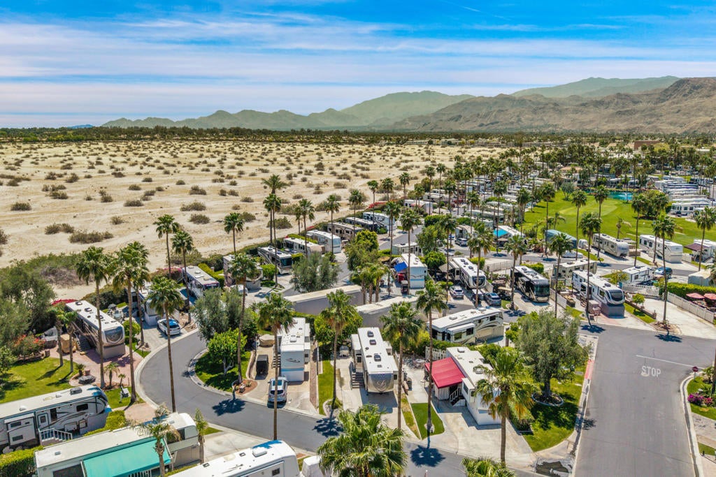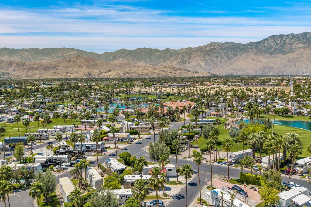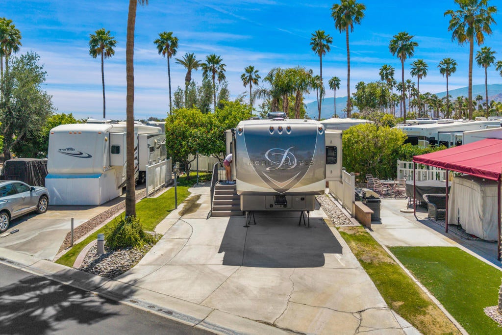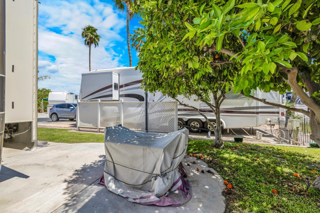 Experience the perfect blend of outdoor living and privacy. Situated on a gorgeous expanded interior lot, this property boasts an abundance of lush grass on both the patio side and rear, creating an inviting and versatile outdoor space. Mature fruit trees provide natural shade, perfect for al fresco dining and entertaining in the beautiful desert climate. Conveniently located near the vibrant El Saguaro Clubhouse, the golf starter shack, and a hub of resort activities, this property offers easy access to all the amenities. Outdoor Resorts Palm Springs is a Five Star RV Resort Community combing luxury with affordability. It's a guard gated resort that sits on 137 beautifully landscaped acres, with 27 holes of executive golf, 10 tennis courts, 13 pickle ball courts, 8 swimming pools, a fully equipped fitness center, sports bar, beauty salon/barber shop, full service restaurant, convenience store, 2 club houses, activities special events and so much more.