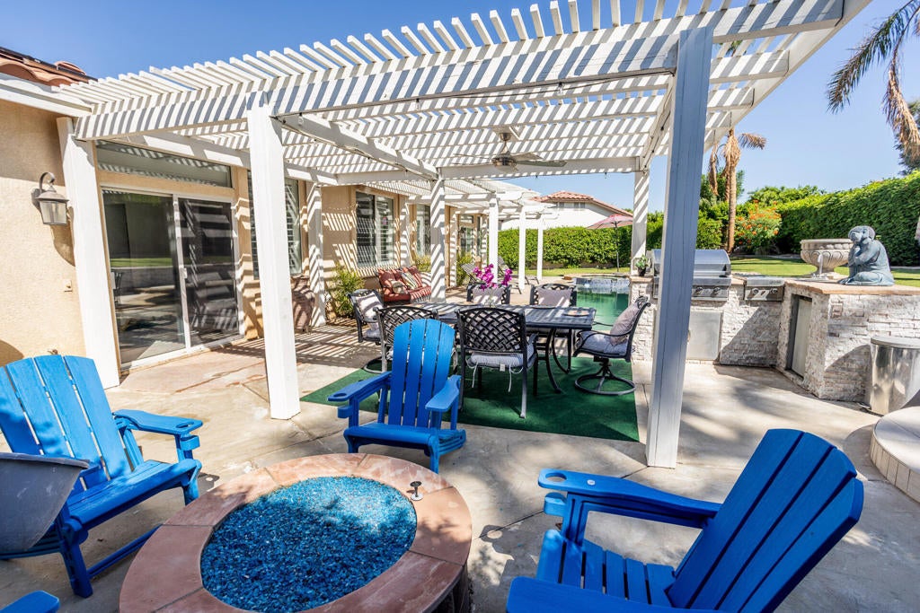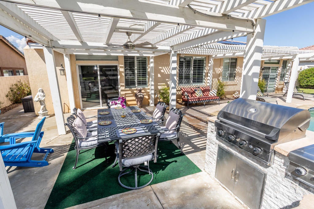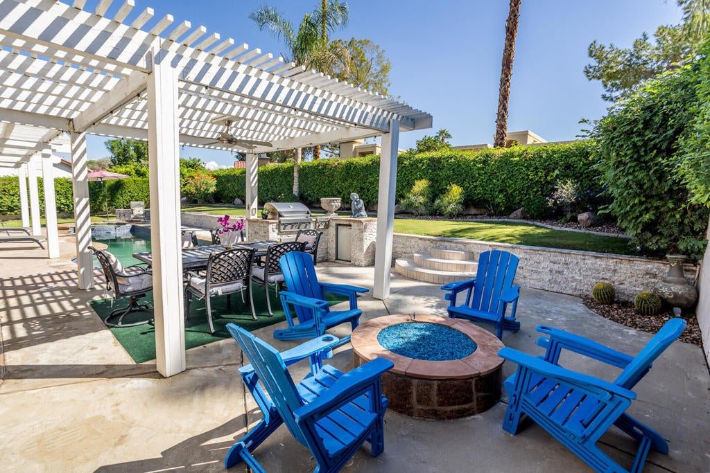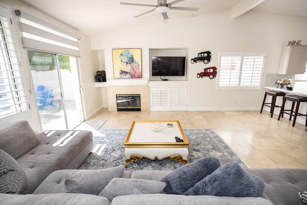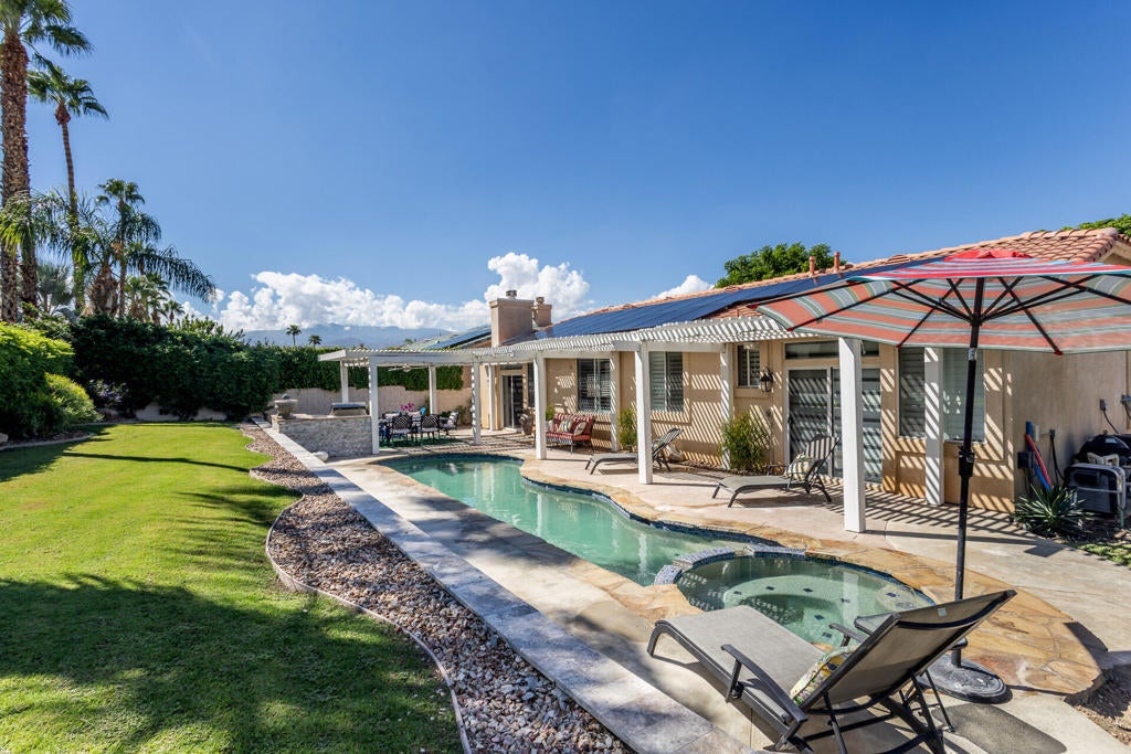 Available for APRIL - come spend Spring Break with us for 12k- Summer prices starting at 3,500 per month: This magnificent home in Palm Desert has four bedrooms, three baths, and a stunning mountain view. The backyard has a pool, a covered patio, and grass lawn. High ceilings and a formal living room gives the home an open and welcoming feel. The kitchen is spacious, with a seated bar, granite counter tops, and top of the line appliances. The family room has a cozy entertainment center and fireplace, while the backyard has a built in grill, fire pit, and outdoor dining area. This home has been remodeled and redecorated, it is the perfect getaway from the city or the snow! Its location is perfect, minutes away from downtown Palm Springs and Indio. The home is in the heart of the desert: go on a hike in Rancho Mirage for the morning, then El Paseo for lunch, and after dinner in Oldtown La Quinta, dance the night away at one of our lovely casinos! The time is always right for a visit to the Coachella Valley!