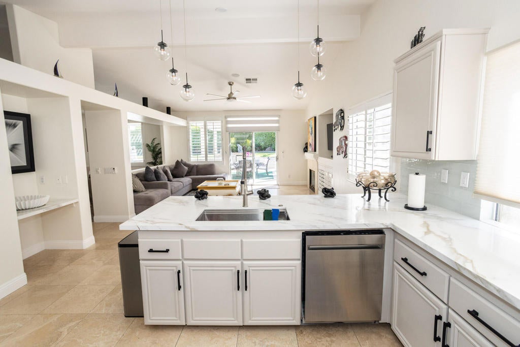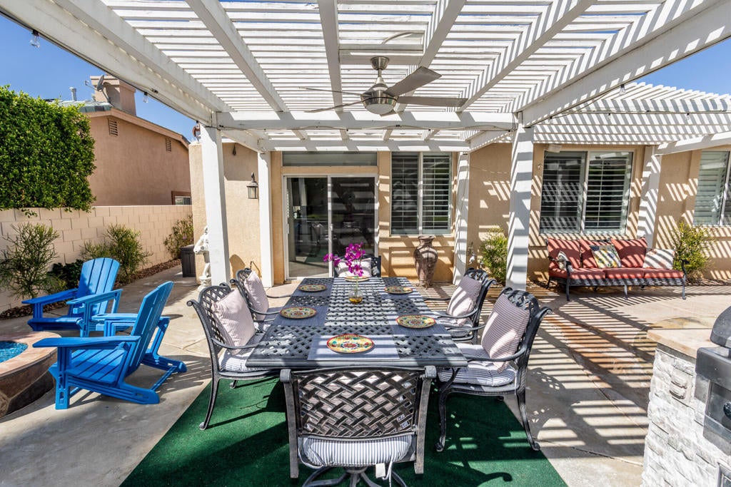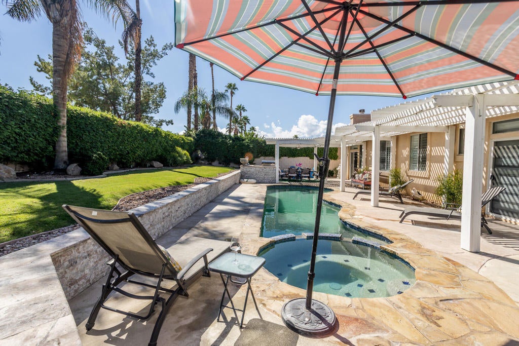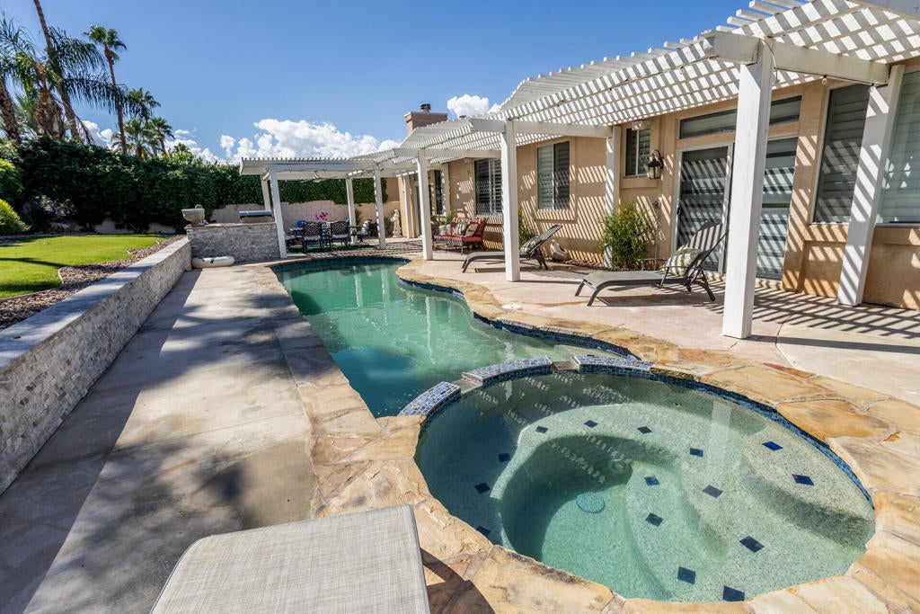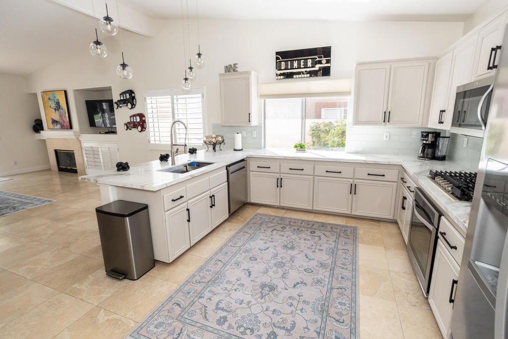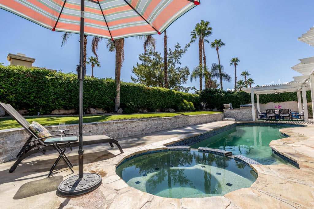 Available for APRIL - come spend Spring Break with us for 12k- Summer prices starting at 3,500 per month: This magnificent home in Palm Desert has four bedrooms, three baths, and a stunning mountain view. The backyard has a pool, a covered patio, and grass lawn. High ceilings and a formal living room gives the home an open and welcoming feel. The kitchen is spacious, with a seated bar, granite counter tops, and top of the line appliances. The family room has a cozy entertainment center and fireplace, while the backyard has a built in grill, fire pit, and outdoor dining area. This home has been remodeled and redecorated, it is the perfect getaway from the city or the snow! Its location is perfect, minutes away from downtown Palm Springs and Indio. The home is in the heart of the desert: go on a hike in Rancho Mirage for the morning, then El Paseo for lunch, and after dinner in Oldtown La Quinta, dance the night away at one of our lovely casinos! The time is always right for a visit to the Coachella Valley!