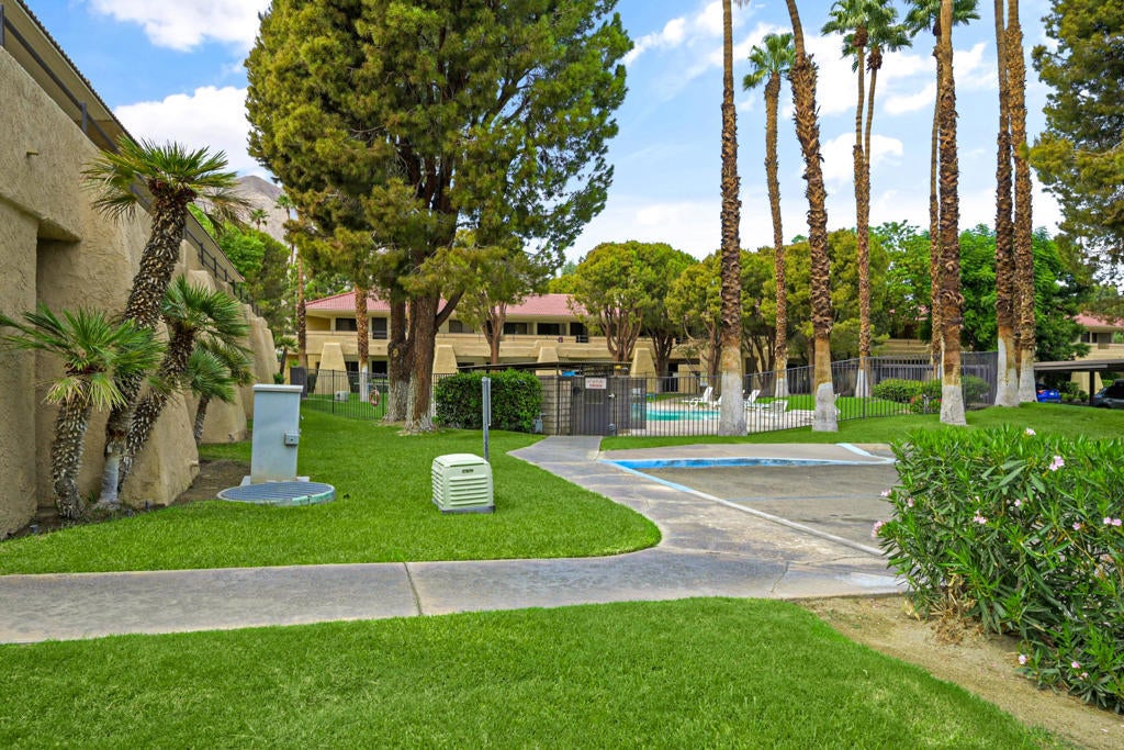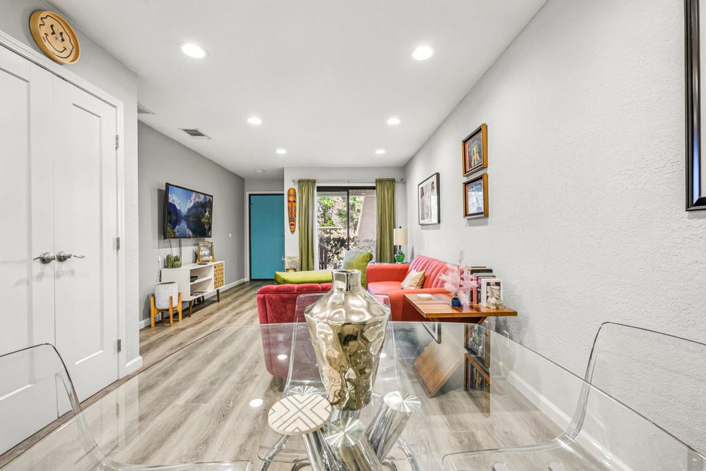 Welcome to this beautifully updated condo in Palm Springs Villas II, offering a fresh modern design and resort-style living. This stylish 1-bedroom, 1-bath condo just steps away from the pool features an open living and dining area with wood-look flooring, recessed lighting, mirrored closet doors, and a covered patio surrounded by lush greenery with a North-facing view of the tennis courts. The kitchen boasts quartz counters, sleek white cabinetry, and stainless-steel appliances. The spacious bedroom includes ample natural light and mirrored wardrobes, while the bathroom showcases a walk-in shower with stone accents and a glass enclosure. Palm Springs Villas II offers tennis courts, sparkling pools and spas, and beautifully landscaped grounds--all just minutes from downtown Palm Springs, dining, and shopping.