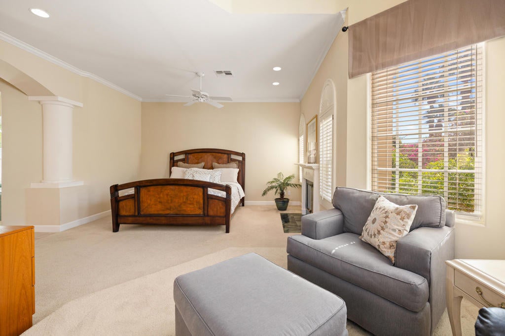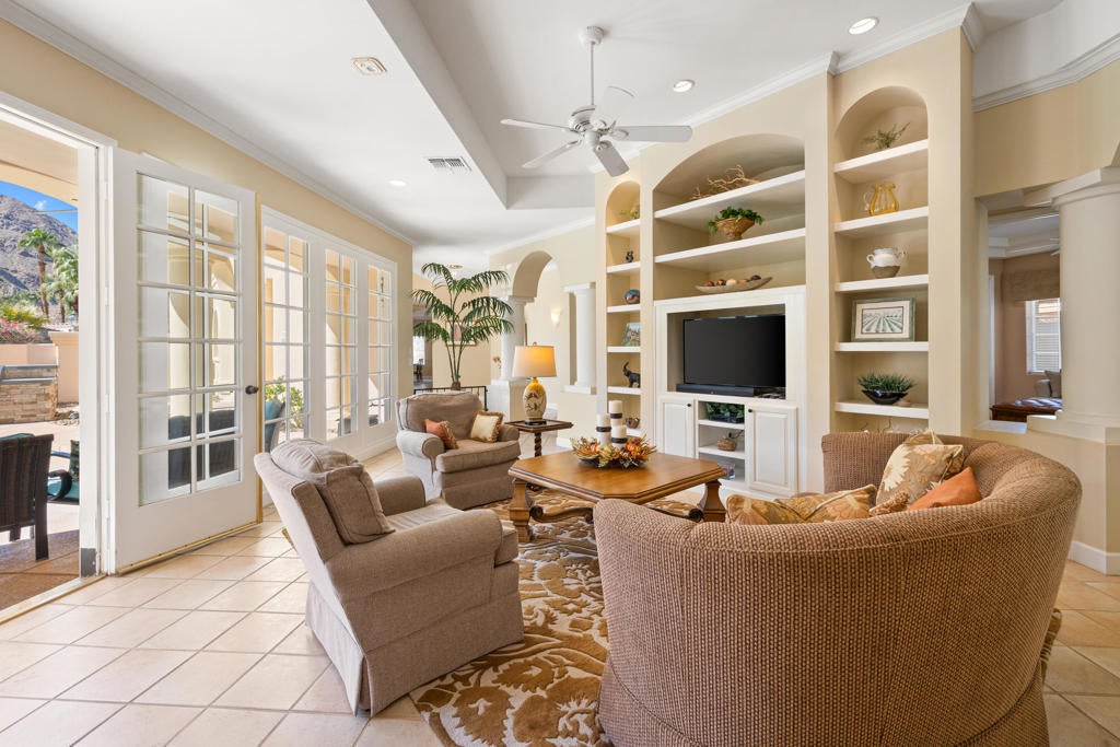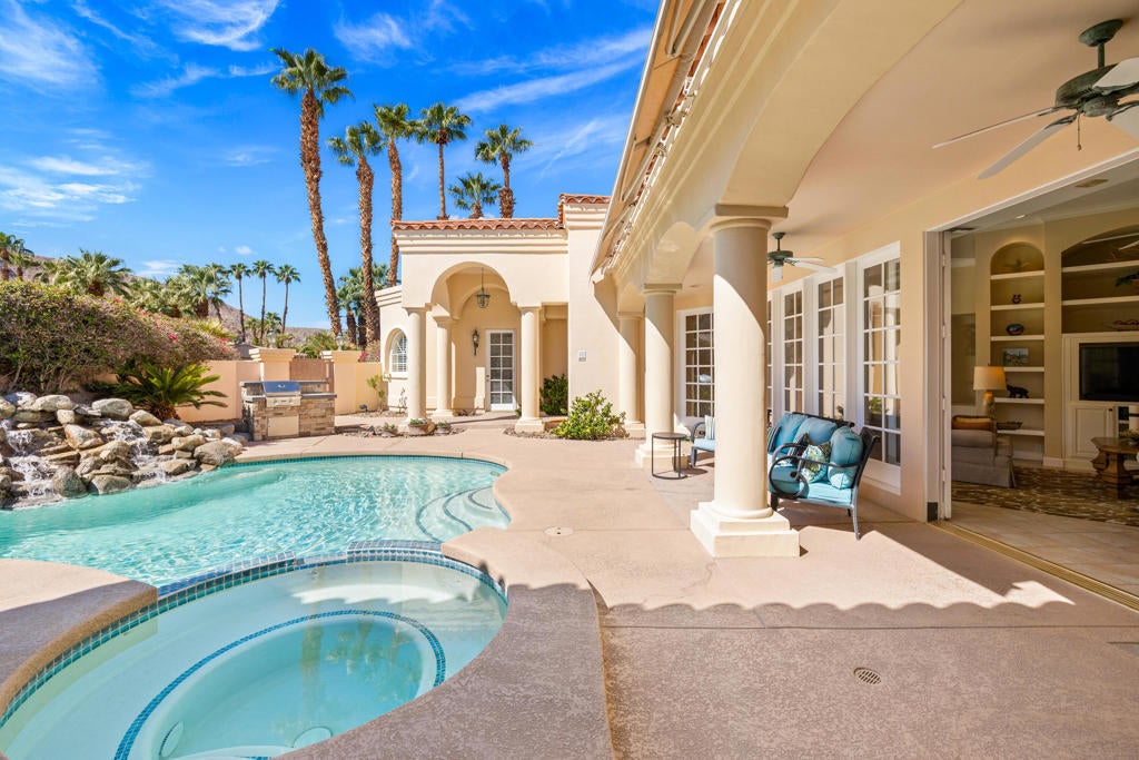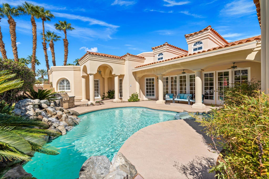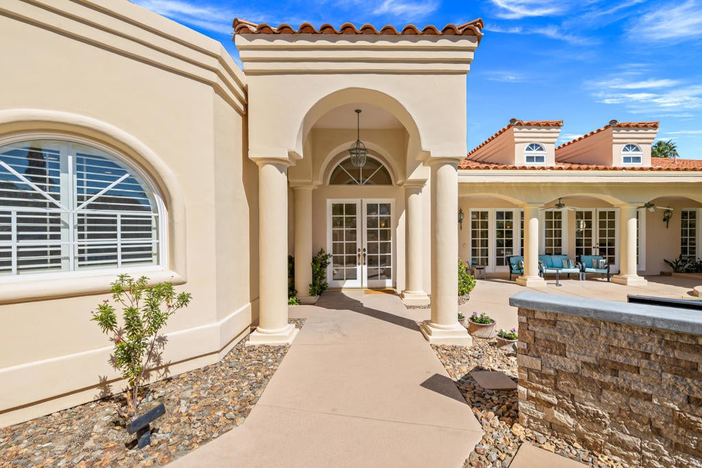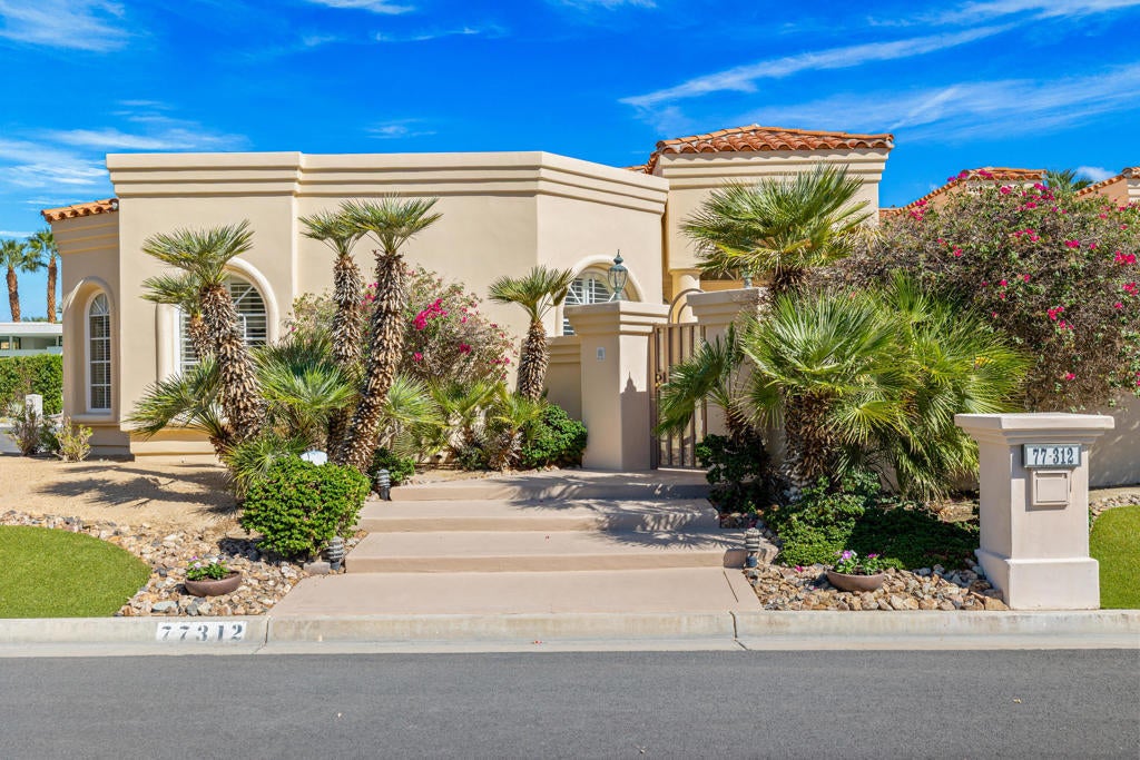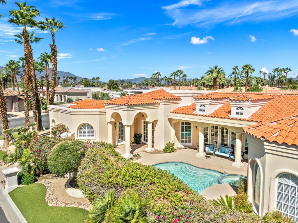 Custom built colonial style Mediterranean home with an Island flavor, and abundance of south and west facing views. French doors open to beautiful pool/spa, waterfall, and mountain views. Located on premium corner lot on quiet cul-de-sac within prestigious Painted Cove neighborhood at guard gated Indian Wells Country Club. Lovely, gated south facing Courtyard entry with gorgeous pool/spa, built-in BBQ, and covered patio. The mountain views and the sunsets are amazing! Home boasts 3678 Sq. Ft., 4 bedrooms, 3 baths, 2 fireplaces, Great Room, formal Dining Room, Gourmet Kitchen, oversized with A/C a 3 car plus golf cart garage. Gourmet Kitchen has granite countertops, kitchen island, and informal dining area. Great Room features awesome south views, built-in entertainment center with custom cabinetry, fireplace, and Wet Bar with granite counters, and bar refrigerator. Primary Bedroom is charming with marble fireplace, large sitting area, and French doors lead out to pool/spa. Primary Bath is spacious, large walk-in closet, double sinks, tiled counters and shower, and jet tub spa. Ensuite baths to the Guest Bedrooms. Large Laundry Room has big closet, deep tub sink, and lots of storage. Low HOA's.