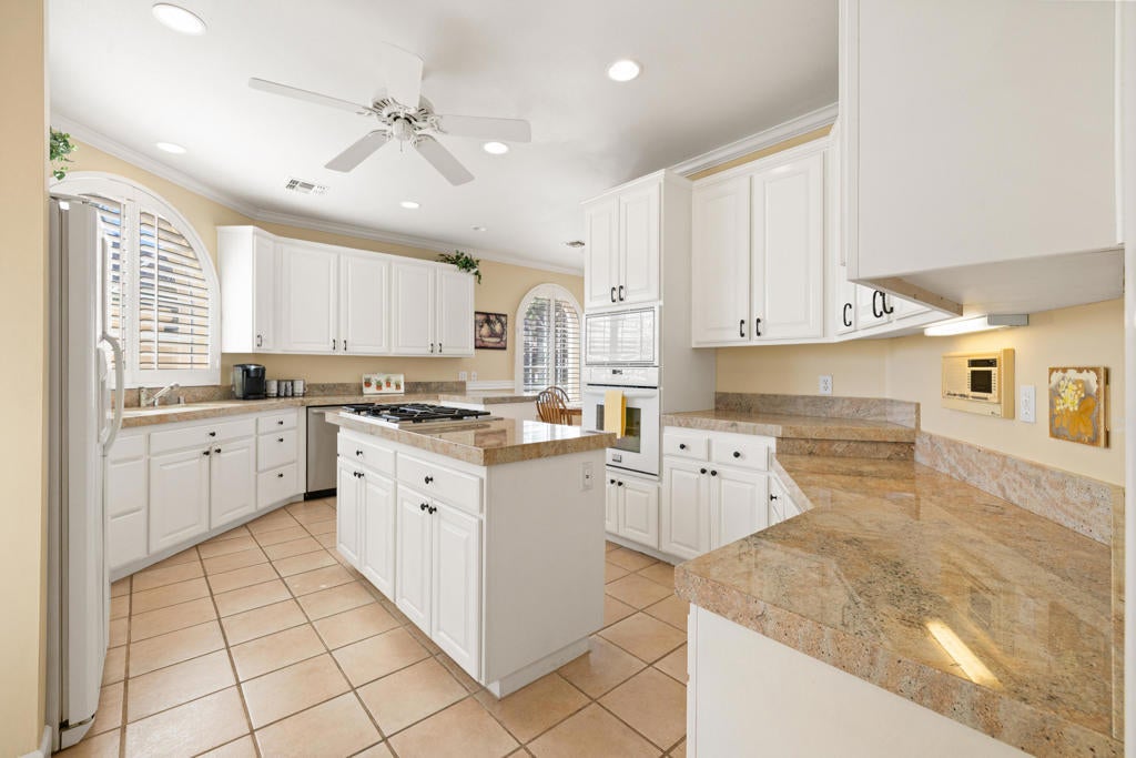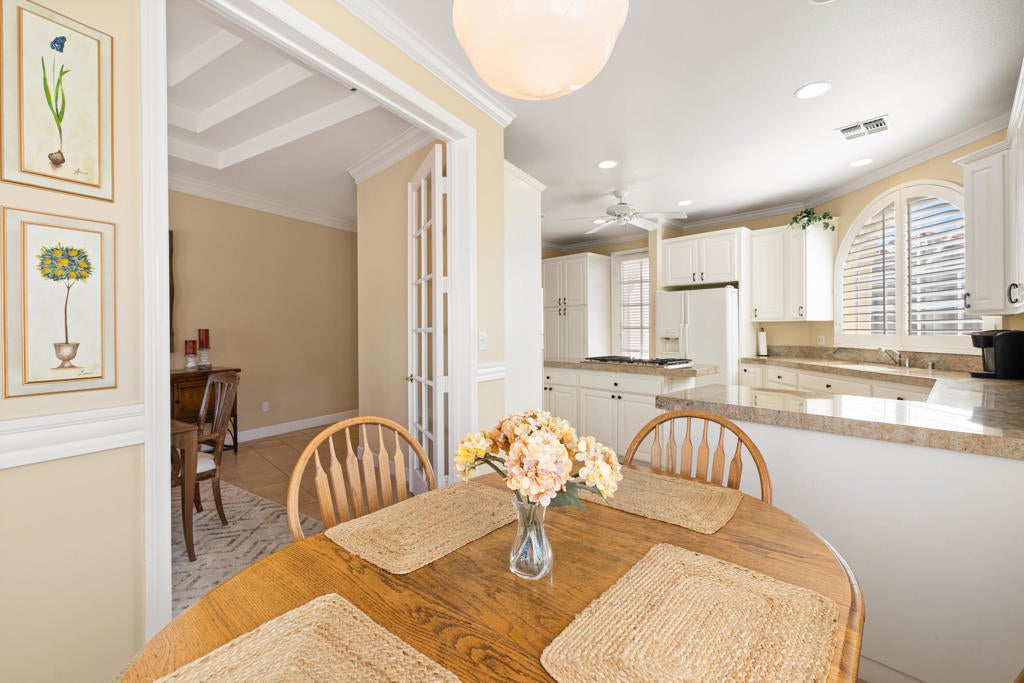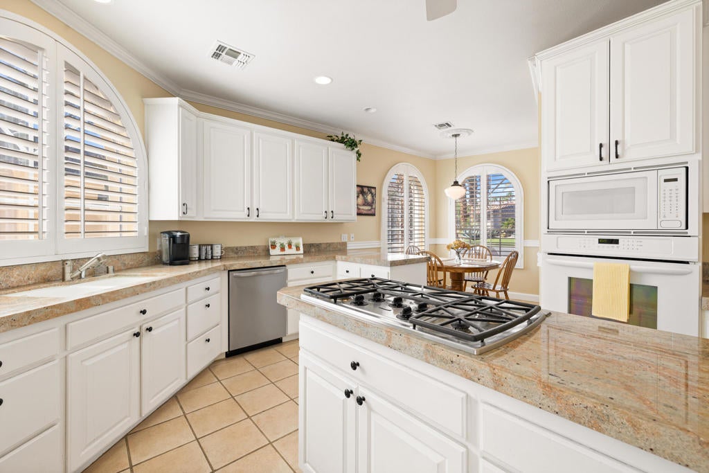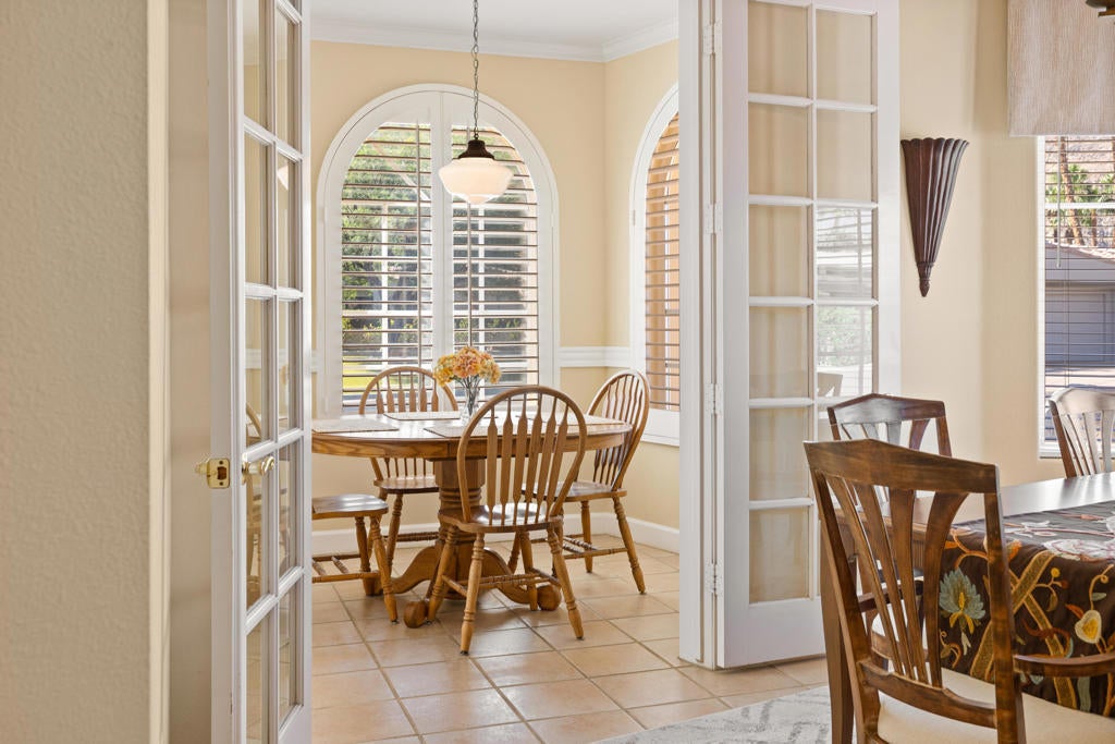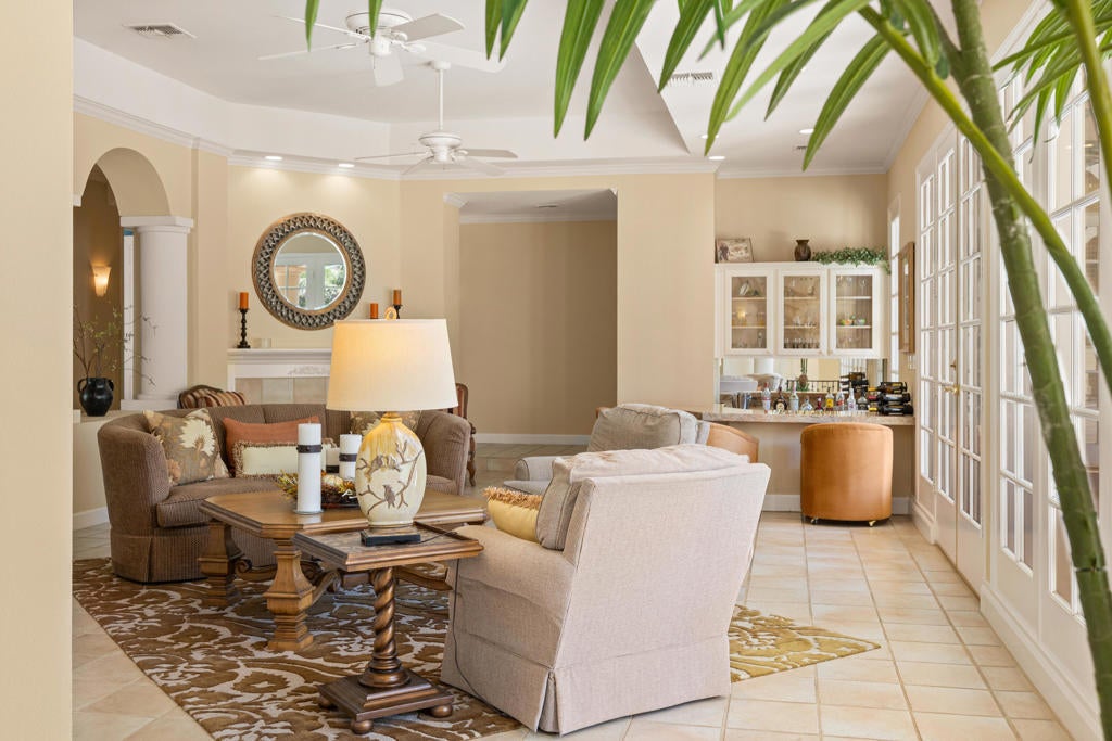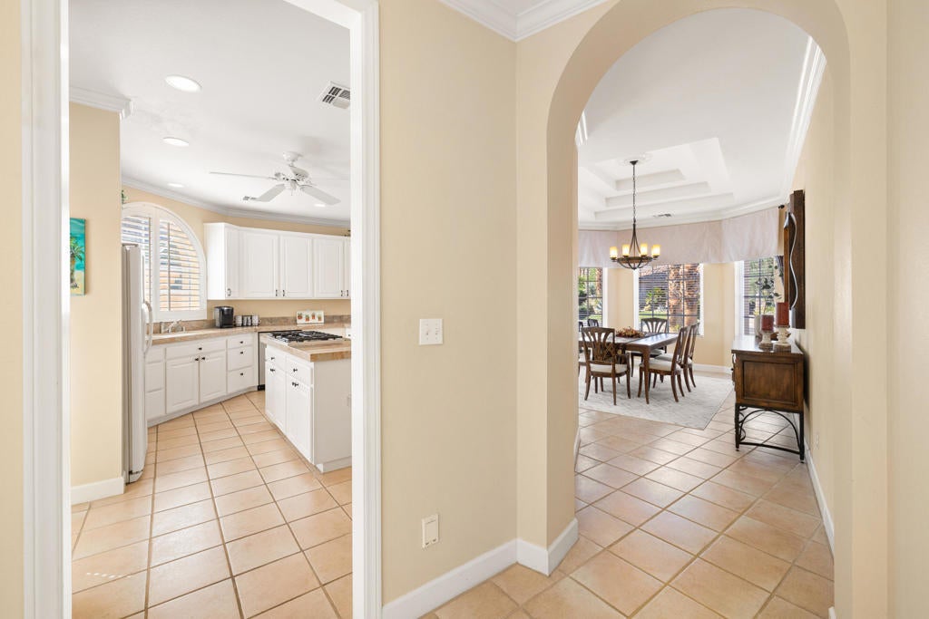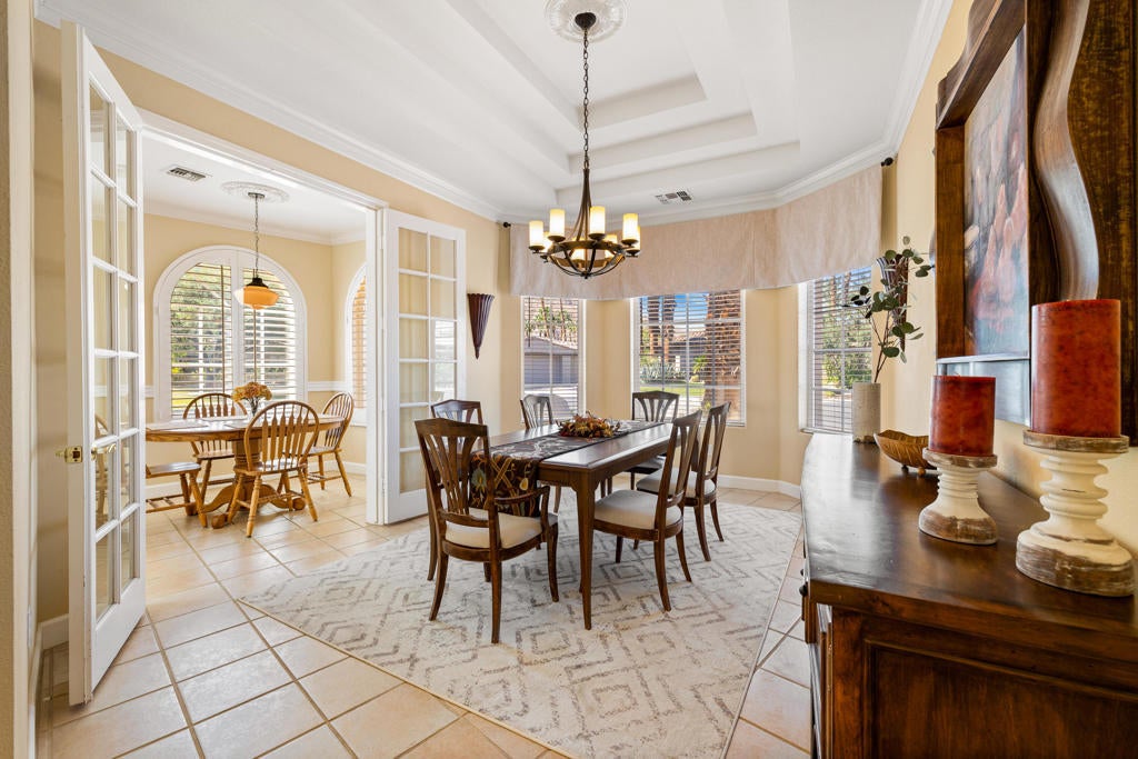 Custom built colonial style Mediterranean home with an Island flavor, and abundance of south and west facing views. French doors open to beautiful pool/spa, waterfall, and mountain views. Located on premium corner lot on quiet cul-de-sac within prestigious Painted Cove neighborhood at guard gated Indian Wells Country Club. Lovely, gated south facing Courtyard entry with gorgeous pool/spa, built-in BBQ, and covered patio. The mountain views and the sunsets are amazing! Home boasts 3678 Sq. Ft., 4 bedrooms, 3 baths, 2 fireplaces, Great Room, formal Dining Room, Gourmet Kitchen, oversized with A/C a 3 car plus golf cart garage. Gourmet Kitchen has granite countertops, kitchen island, and informal dining area. Great Room features awesome south views, built-in entertainment center with custom cabinetry, fireplace, and Wet Bar with granite counters, and bar refrigerator. Primary Bedroom is charming with marble fireplace, large sitting area, and French doors lead out to pool/spa. Primary Bath is spacious, large walk-in closet, double sinks, tiled counters and shower, and jet tub spa. Ensuite baths to the Guest Bedrooms. Large Laundry Room has big closet, deep tub sink, and lots of storage. Low HOA's.