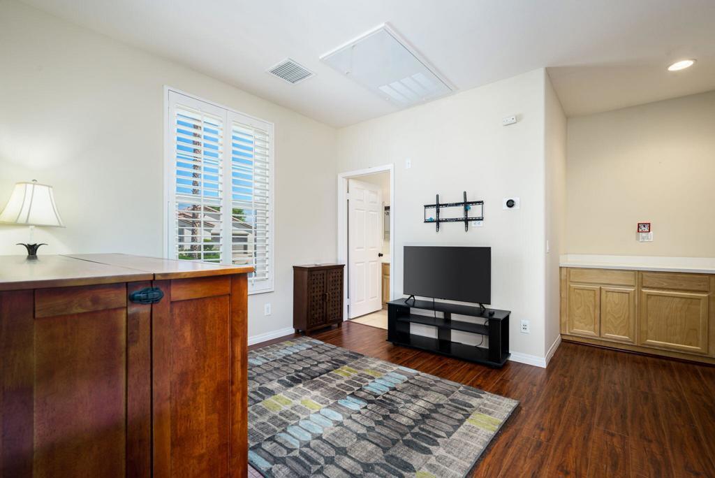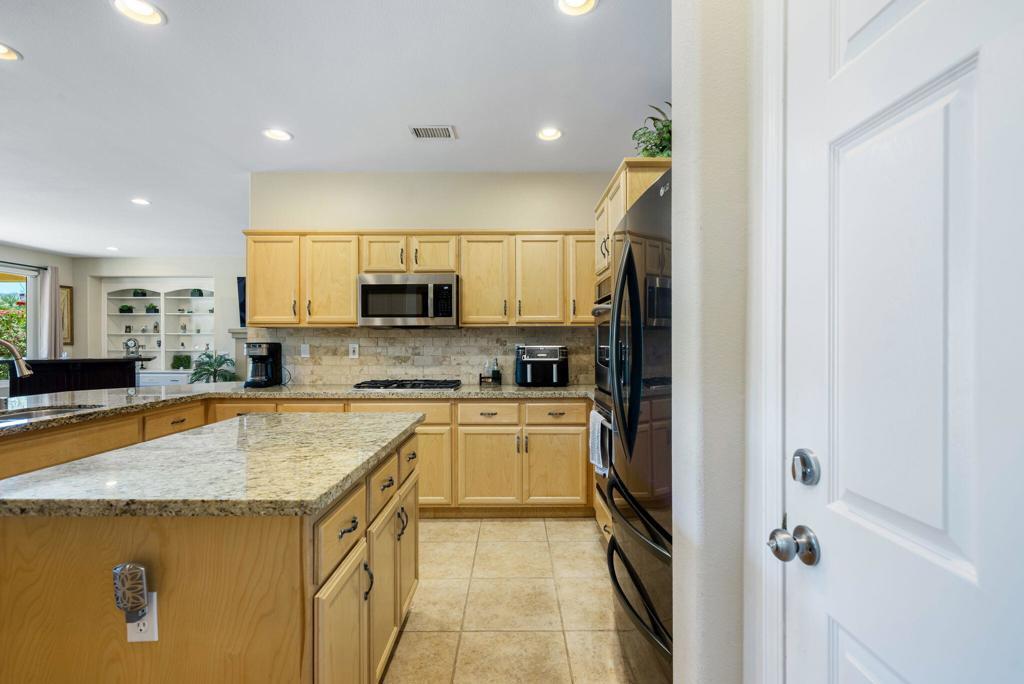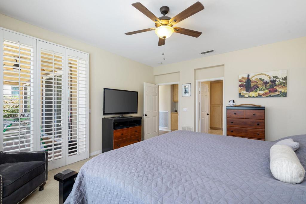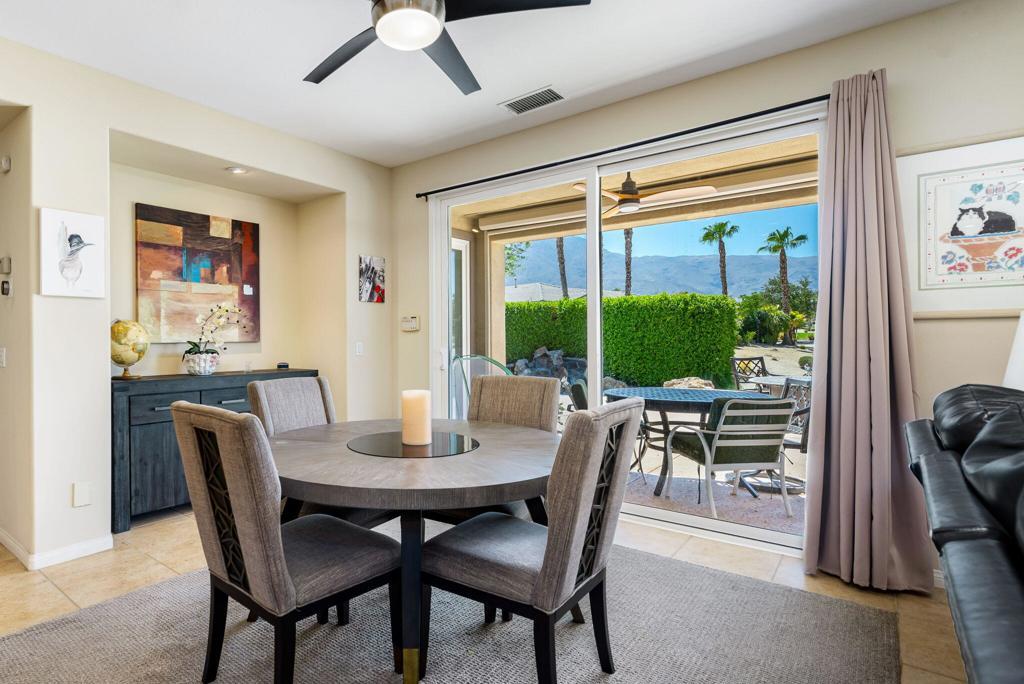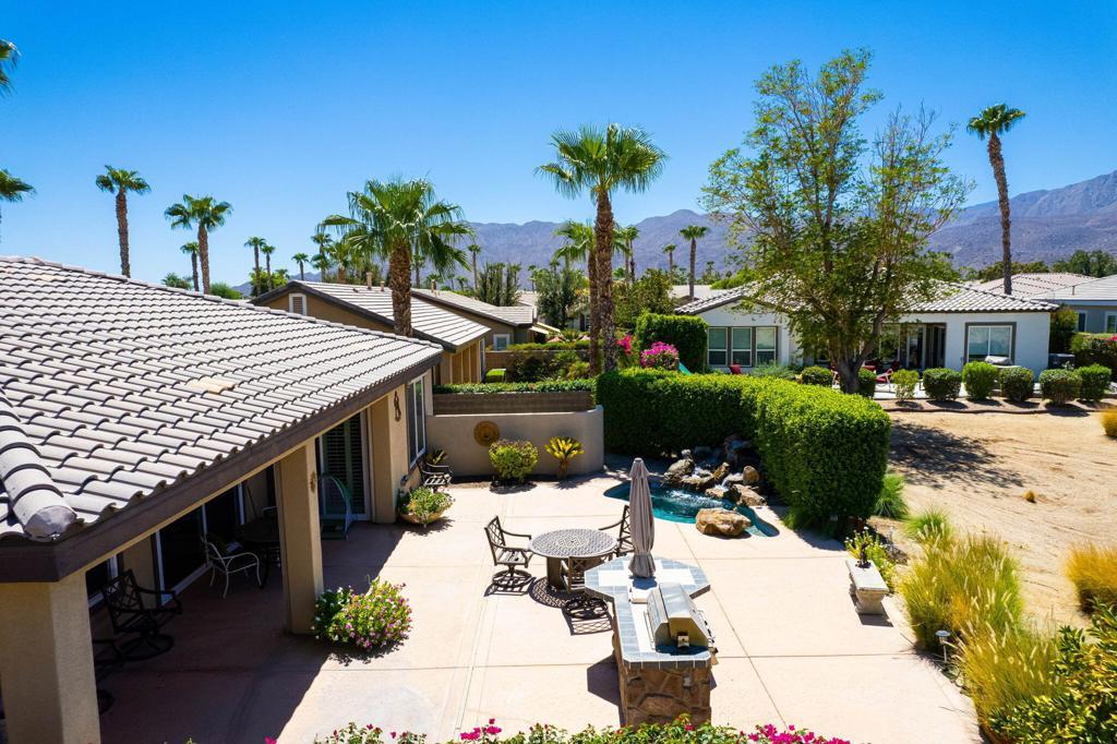 RENTED 2-1-2026 thru 4-30-2026. Welcome to your dream retreat just off the 18th Tee at Trilogy La Quinta! This stunning west-facing oasis, complete with a charming Casita, offers a resort-style backyard that's perfect for entertaining or relaxing. Picture yourself unwinding in the pebble-finished spa, enjoying the tranquil sound of the rock waterfall, or grilling up a feast at the fully equipped BBQ island. With panoramic views of the mountains, lake, and golf course, your evenings on the shaded patio will be nothing short of magical. Step inside this 1,806-square-foot single-level gem to find three spacious bedrooms, three luxurious baths, and a great room designed for comfort with a cozy tile-encased fireplace and custom built-ins. Recently updated flooring throughout the home. The primary suite is your personal sanctuary, featuring plantation shutters, private patio access, a walk-in closet, and a spa-like en suite bath. The gourmet island kitchen, open to the dining room, boasts granite countertops, a custom backsplash, stainless steel appliances, double ovens, and ample cabinetry--everything a chef could desire. The attached Casita, with elegant wood flooring, provides the perfect haven for guests, ensuring comfort and privacy. An extended 2-car garage, all new Milgard windows, upgraded carpets, ceiling fans, and automatic sunshades complete the package, making this home a perfect blend of luxury and functionality.