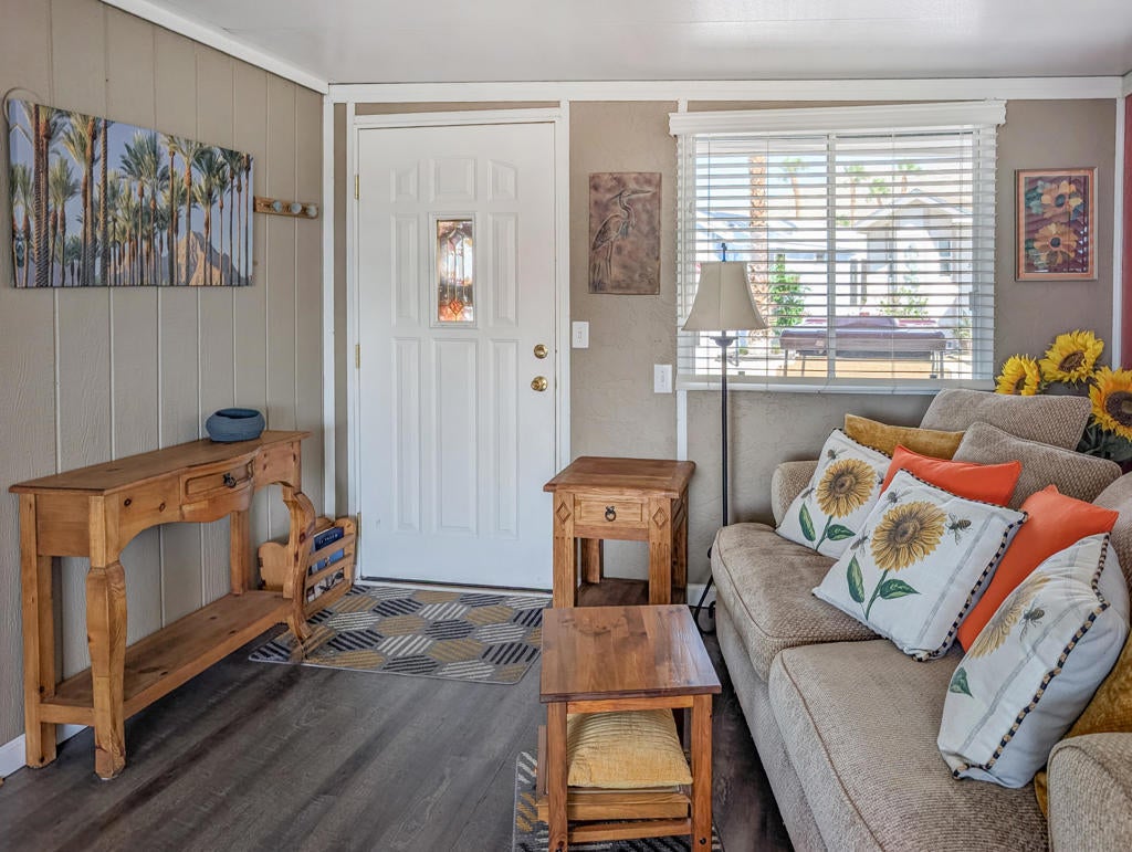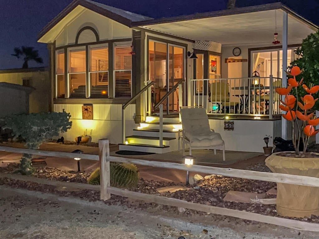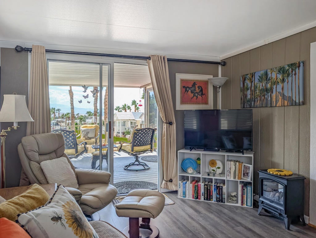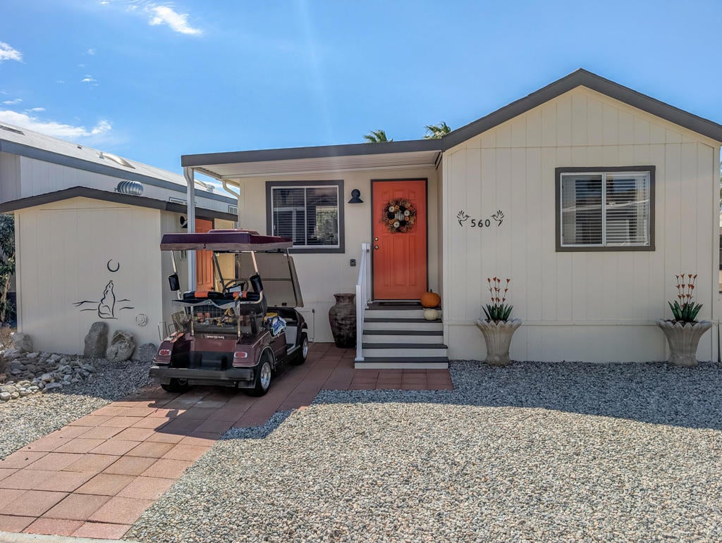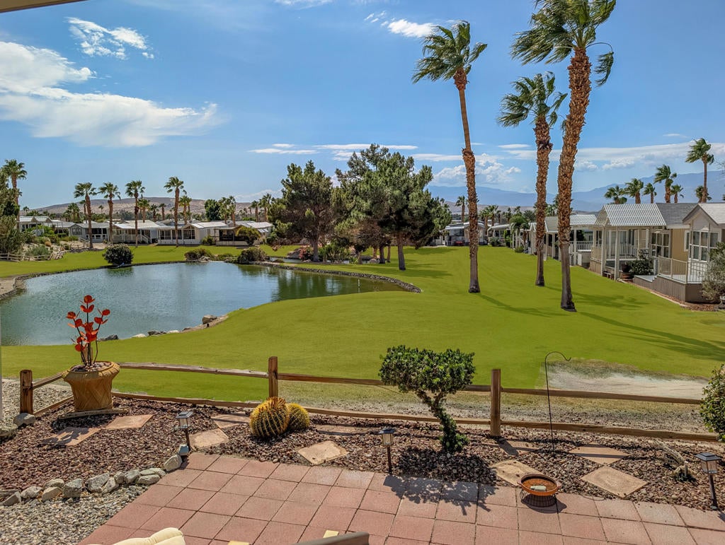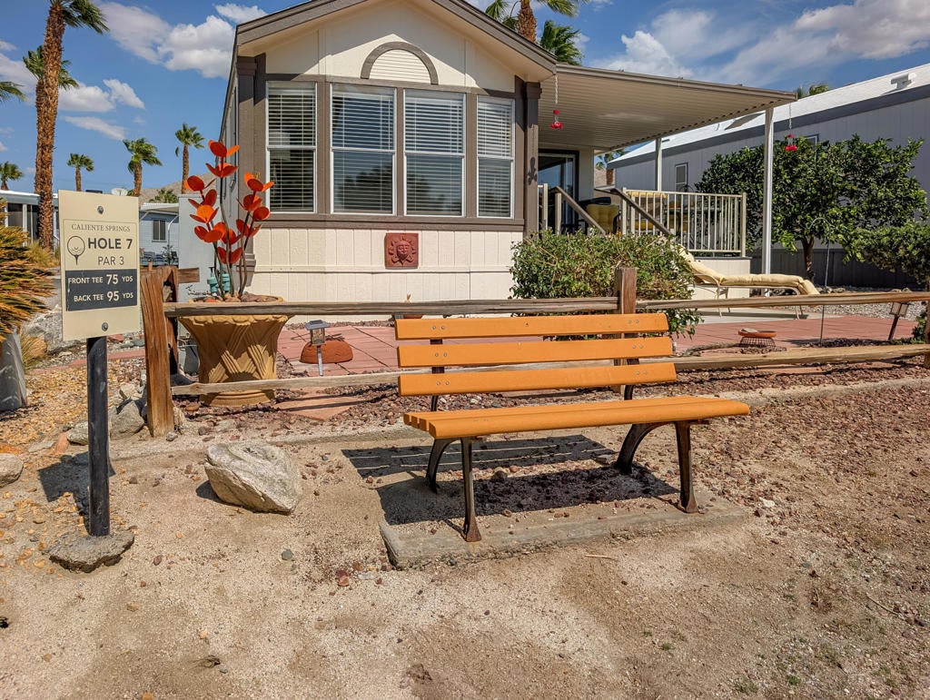 Stunning Home with Exceptional Resort Amenities; This remarkable property offers unbeatable views and is surrounded by beautiful water features. Located on the 7th tee of the golf course, this impressive 1-bedroom, 1-bath home is a ~600 sq. ft. 1998 Fleetwood Park Model. From the moment you enter, you'll be captivated by the modern design, vibrant and well-appointed furnishings, and the stunning vistas. The home provides both privacy and a turnkey living experience, making it the ideal getaway or a permanent residence. Outdoor Living and Entertaining; Enjoy a spacious, wind-protected deck--perfect for entertaining guests or unwinding as you watch the sun set over the hills. This inviting space allows you to savor all the comforts of home while soaking in the scenic surroundings.Community and Resort Amenities;Caliente Springs is a premier 55+ resort community, renowned for its extensive amenities. Residents have access to a fabulous mineral-fed hot spring pool and spas, a 9-hole golf course, 12 pickleball courts, tennis courts, laundry facilities, and much more. The community is actively involved, fostering a close-knit environment where friends truly become family. Please note that the lot is not owned; space rent is $950 per month. Golf Cart included.