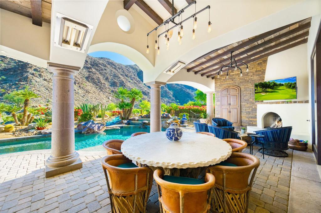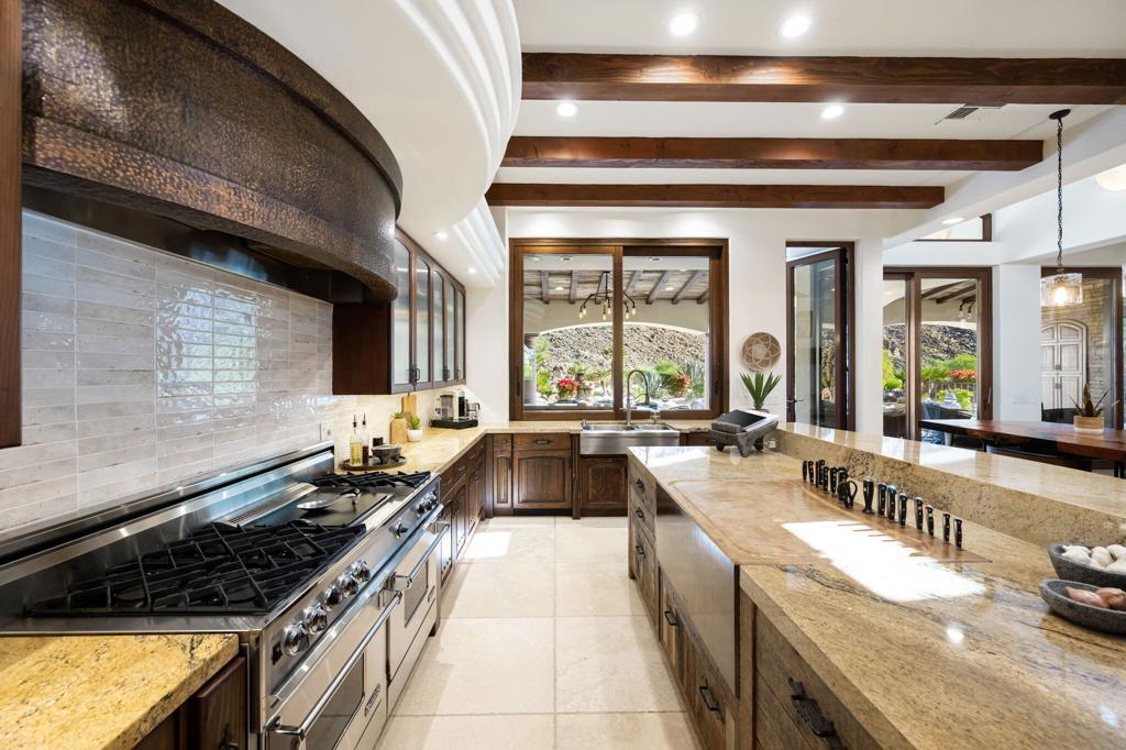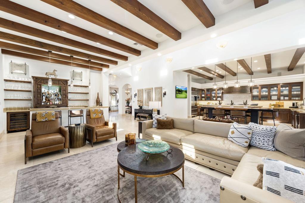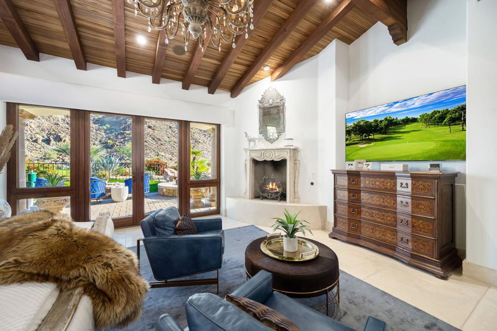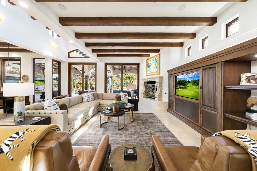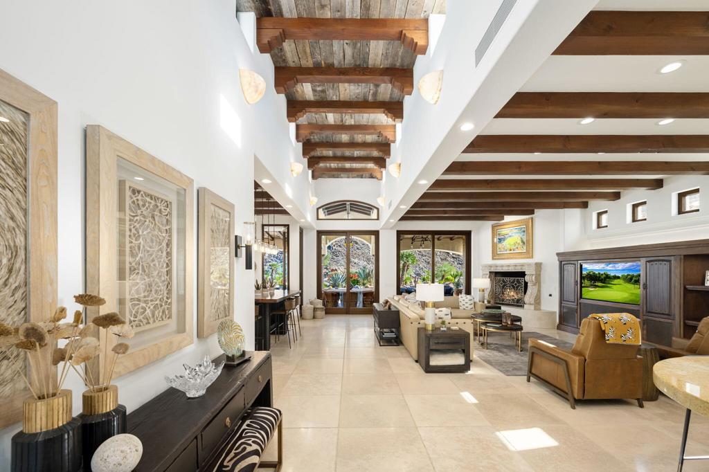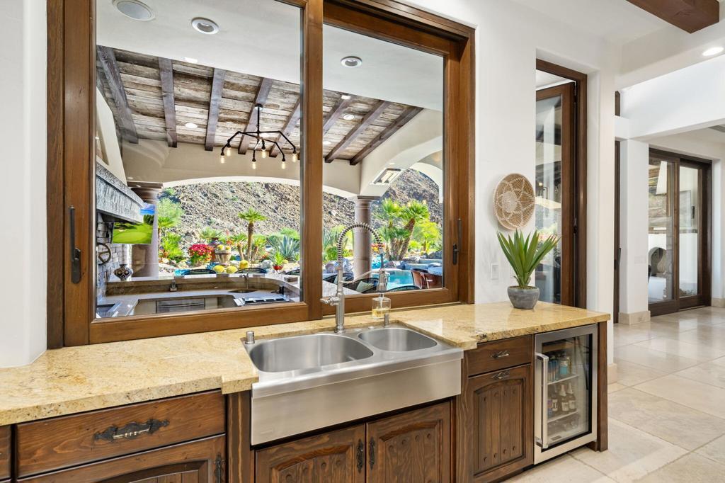 Newly remodeled and furnished by a top interior designer, this amenity rich home in quiet and private location has 4 bedrooms including casita with living room. This Jim McIntosh masterpiece is a study in fine detailing with Albertini windows & sliding doors, Italian marble floors, carved stone fireplaces, handsome beams & wood ceilings. Light and bright open floor plan with new paint and LED lighting, spacious living and family rooms, gorgeous dining room, restaurant style bar, & stunning wine room. Restaurateur's kitchen includes commercial grade refrigerator, 60-inch range, and beautiful slab & tile detailing. Elegant primary bedroom suite with reclaimed wood ceiling, fireplace, beautiful bathroom suite, and huge closet. Handsome office can be the 4th bedroom, and the spacious casita suite with kitchenette, living area & cozy bedroom. Built for outdoor living with huge, covered patio with outdoor kitchen / bar (with BBQ, frig, ice & dishwasher), multiple seating areas, fireplace, heaters & misters. Intimate setting with dramatic close mountains, and sparkling swimming pool, spa and nearby fire pit. Pool has new pebble tec, new equipment & LED lights. Recent upgrades include electric shades, several new AC units & thermostats, Lutron dimmer switches, new ice machines & subzero beverage center, several new TVs, new misting system, new hot water heater. Impeccably maintained by meticulous owners. Offered furnished per inventory except some personal items and one chandelier.