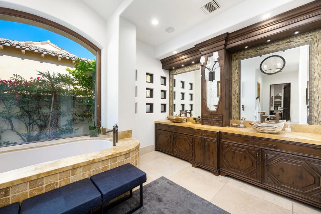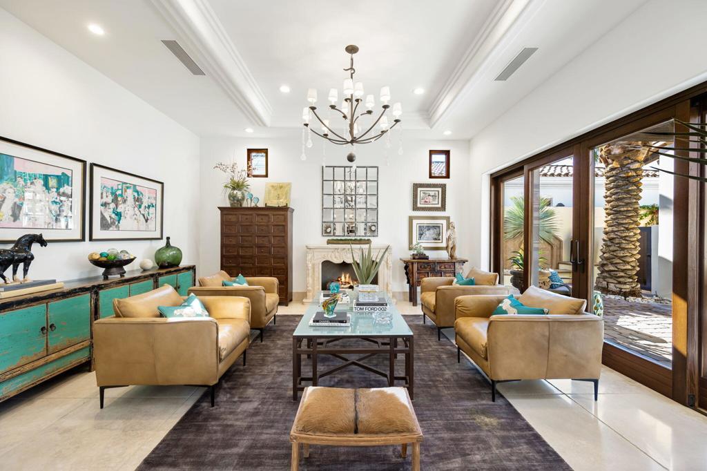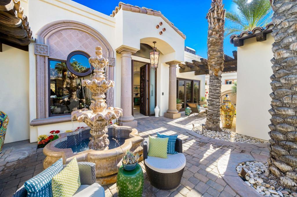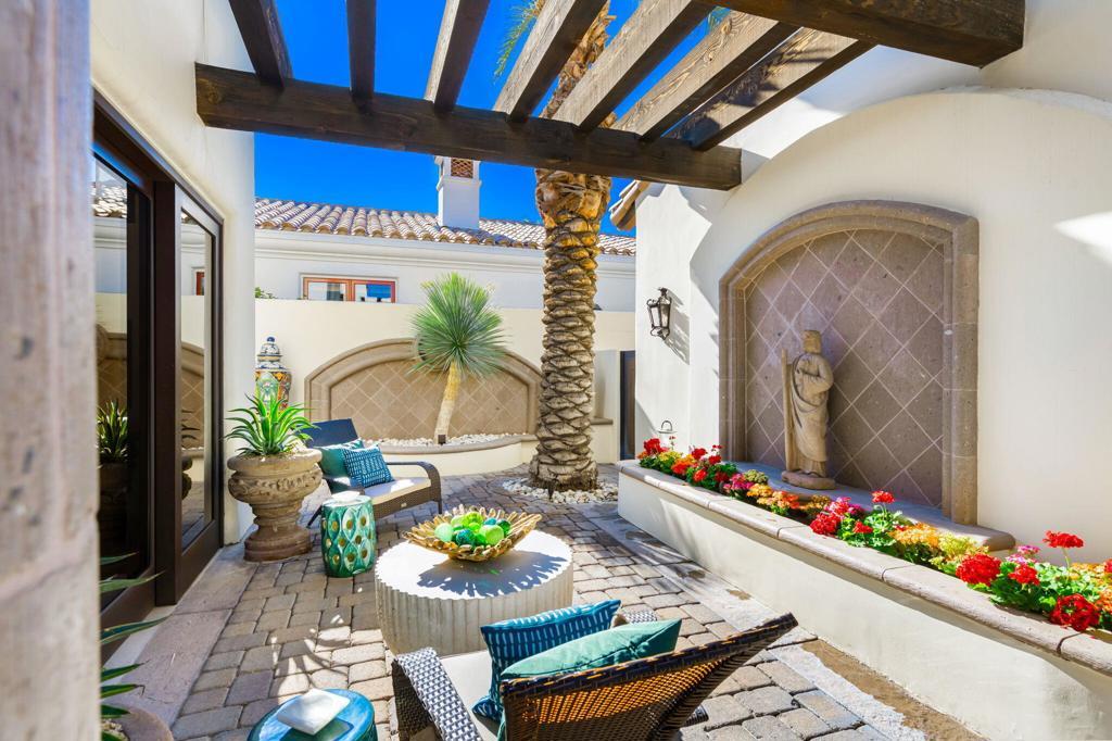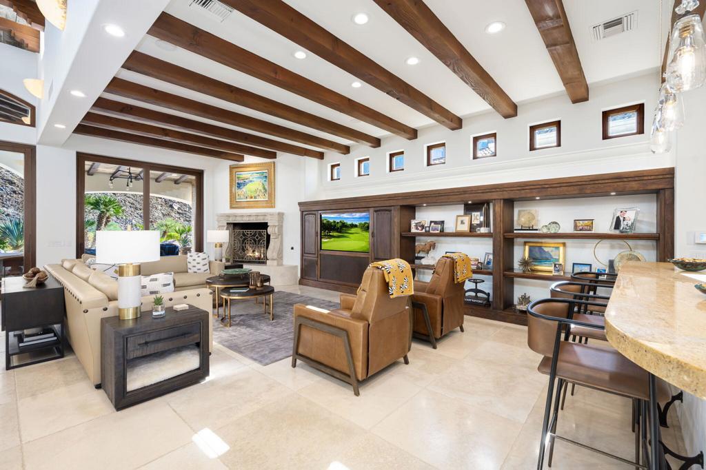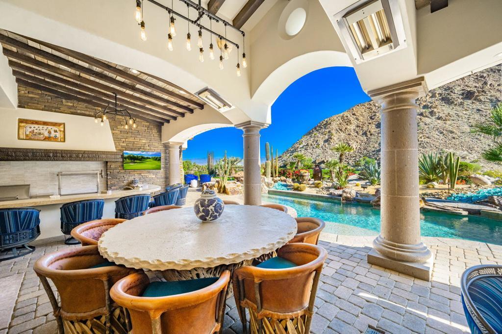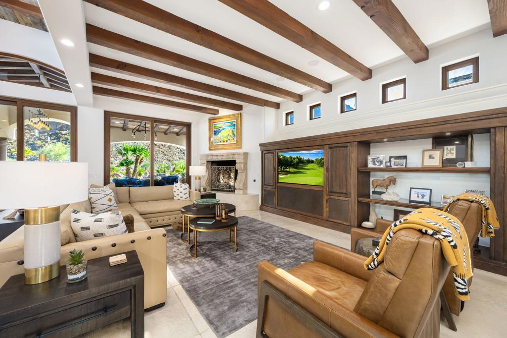 Newly remodeled and furnished by a top interior designer, this amenity rich home in quiet and private location has 4 bedrooms including casita with living room. This Jim McIntosh masterpiece is a study in fine detailing with Albertini windows & sliding doors, Italian marble floors, carved stone fireplaces, handsome beams & wood ceilings. Light and bright open floor plan with new paint and LED lighting, spacious living and family rooms, gorgeous dining room, restaurant style bar, & stunning wine room. Restaurateur's kitchen includes commercial grade refrigerator, 60-inch range, and beautiful slab & tile detailing. Elegant primary bedroom suite with reclaimed wood ceiling, fireplace, beautiful bathroom suite, and huge closet. Handsome office can be the 4th bedroom, and the spacious casita suite with kitchenette, living area & cozy bedroom. Built for outdoor living with huge, covered patio with outdoor kitchen / bar (with BBQ, frig, ice & dishwasher), multiple seating areas, fireplace, heaters & misters. Intimate setting with dramatic close mountains, and sparkling swimming pool, spa and nearby fire pit. Pool has new pebble tec, new equipment & LED lights. Recent upgrades include electric shades, several new AC units & thermostats, Lutron dimmer switches, new ice machines & subzero beverage center, several new TVs, new misting system, new hot water heater. Impeccably maintained by meticulous owners. Offered furnished per inventory except some personal items and one chandelier.