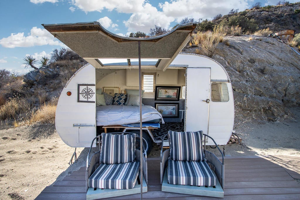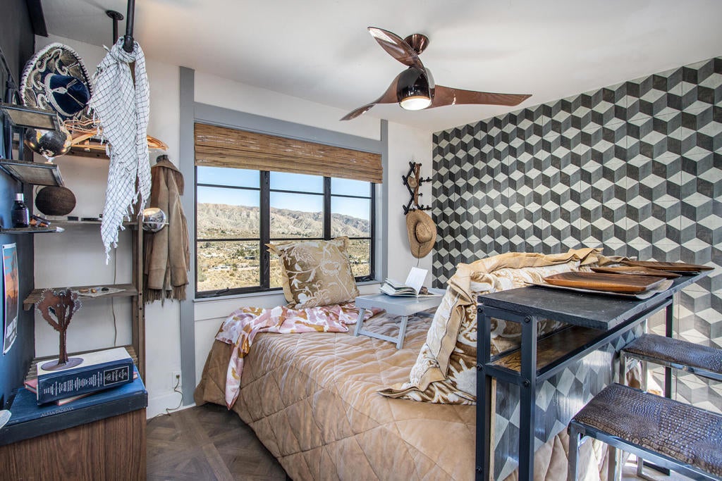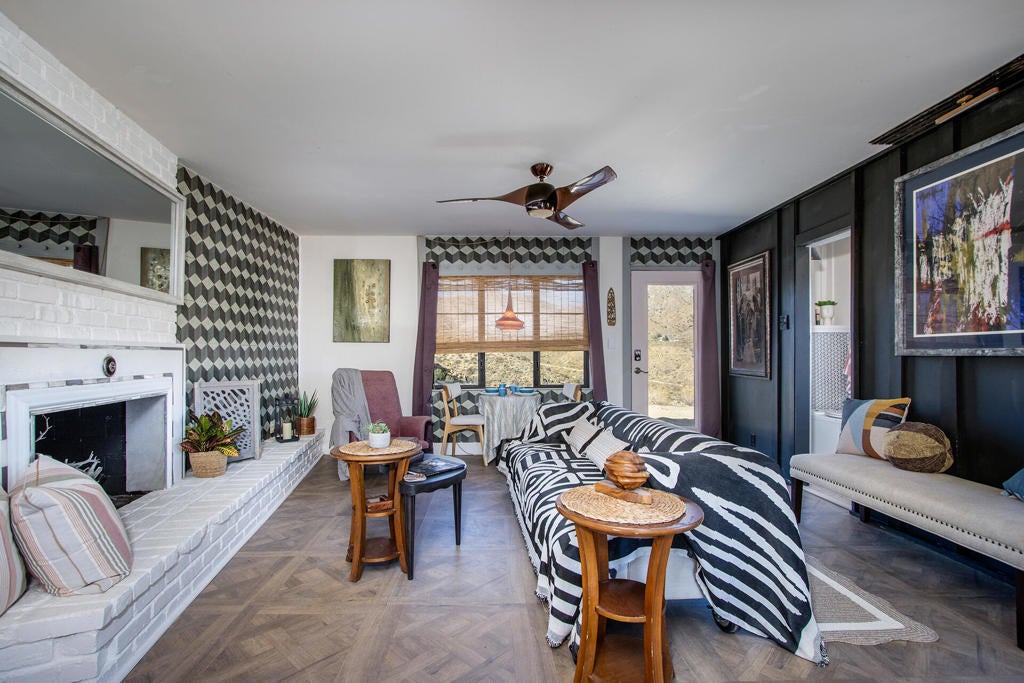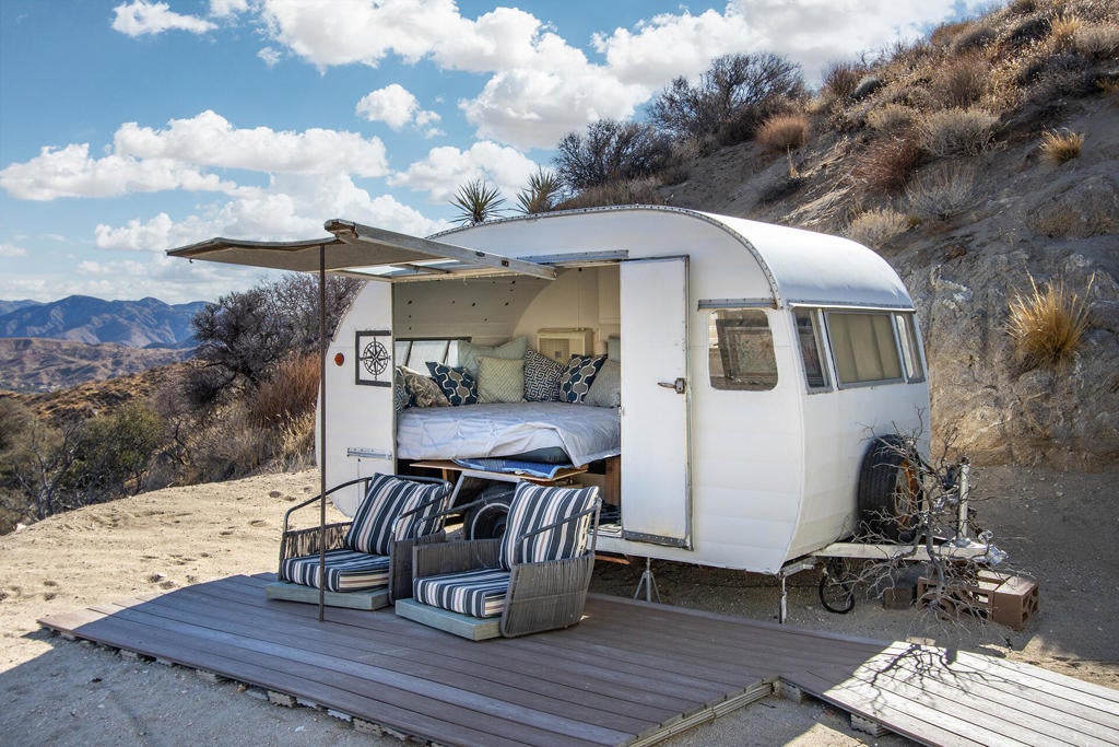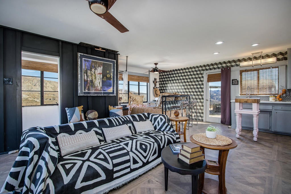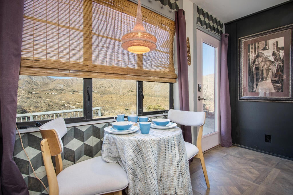 Owner Will Carry Financing! Dream cabin elevated on a hill in the clouds. Meticulously remodeled designer mid century home. Stunning natural panoramic views. 10 acres on two legal lots. Property backs up to government land that connects to the Sand to Snow Monument. Your own nature park with trails, valleys, ridges, and 360' views. Slab walkway leads to the entryway with a matte black barn light. Front door opens to the living room with a masonry fireplace, hearth ledge, gallery wall with picture light and large windows. Kitchen area with recessed lighting, butcher block island, and vintage kitchen. Bedroom nook with inspiring vistas, shelving, ceiling fan, and breakfast bar table. Bathroom with floating pedestal sink, mirror cupboards, large walk in tile shower. Step out on the hilltop patio high above the valley. Vintage remodeled 50's trailer guest unit with deck patio and sofa chair loungers. Queen bed with cabinets and amazing views. Natural desert fauna of yucca trees, creosote bushes, and cactus. 20 miles to Palm Springs. 115 miles to LA. 21 miles to Joshua Tree National Monument. 10 miles to Yucca Valley. The local Covington Park offers tennis courts, kids playgrounds, and community center. Restaurants and amenities nearby. May qualify for Conventional Lending. Don't wait, Call Now!