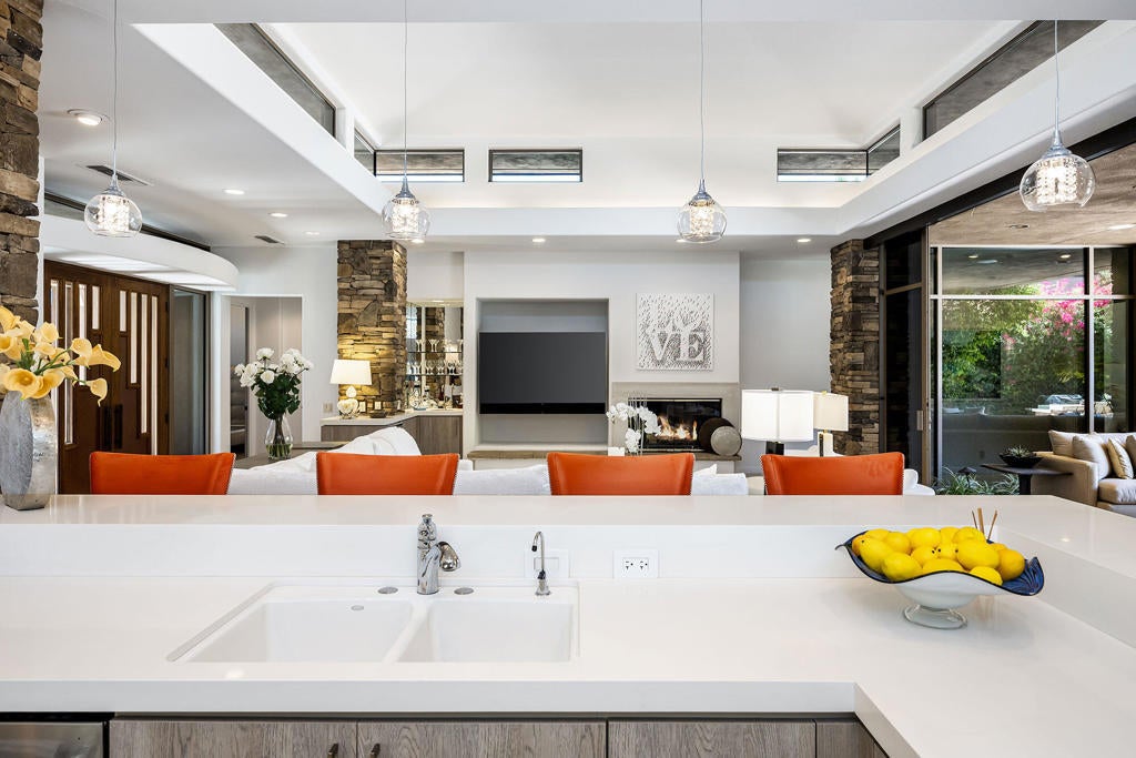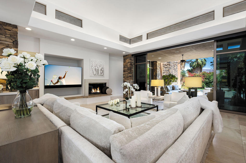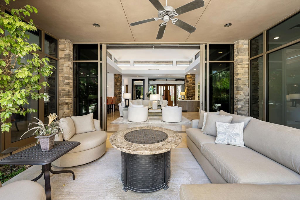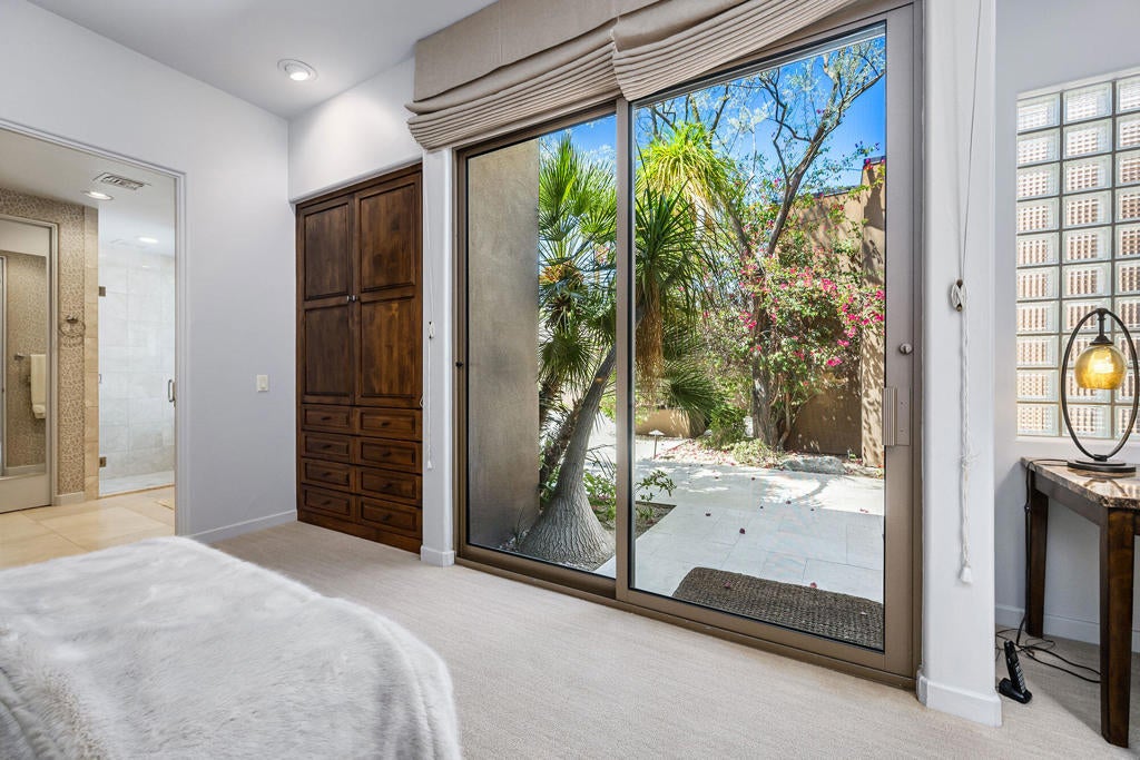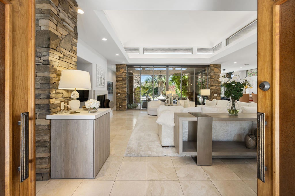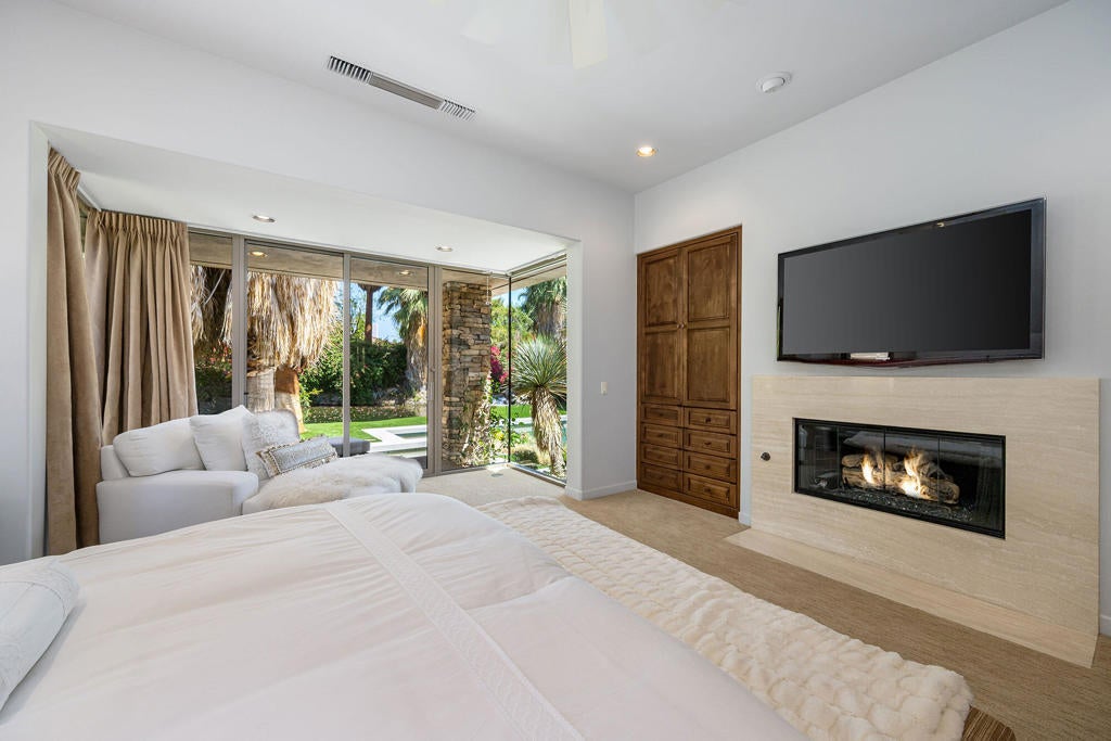 Welcome to an extraordinary desert retreat within the prestigious gates of BIGHORN Golf Club, where luxury and serenity meet in perfect harmony. A custom gated arrival courtyard sets the tone with a handcrafted water feature, lush tropical landscaping, and an inviting seating area that warmly welcomes you home. Beyond, your own private lake and cascading waterfall create a rare, resort-like backdrop--offering daily tranquility and a true vacation-at-home lifestyle.Inside, the light-filled great room is designed to embrace the views, showcasing vaulted ceilings with clerestory windows, a striking stone fireplace, built-in media center, and a corner wet bar with custom-faced refrigerator. Electronic shades and walls of glass sliders open effortlessly to a covered outdoor living room overlooking the saltwater pool, waterfall, and shimmering lake. Seamless indoor-outdoor dining allows you to host with ease, with seating for eight framed by floor-to-ceiling windows and direct access to the entertainment patio.The bright, chef-inspired kitchen features quartz countertops, custom cabinetry, breakfast bar seating, and premium appliances including a high-performance Viking gas range and Sub-Zero refrigeration--perfect for effortless entertaining or extended stays. Outdoors, a multi-tiered, ultra-private patio is anchored by your lake and waterfall, complete with spa, barbecue center, and expansive lounge areas--your own private oasis under the desert sky.The primary suite is a luxurious retreat with a travertine fireplace, sitting area, private patio, and spa-like bath illuminated by skylights, featuring a soaking tub, dual vanities, and dual walk-in closets. A detached guest casita with morning bar and full bath provides ideal accommodations for visitors, complemented by two additional interior guest suites with en-suite baths. Completing the residence is a two-car garage plus a dedicated golf cart garage--designed for effortless Club living in one of the desert's most coveted communities.