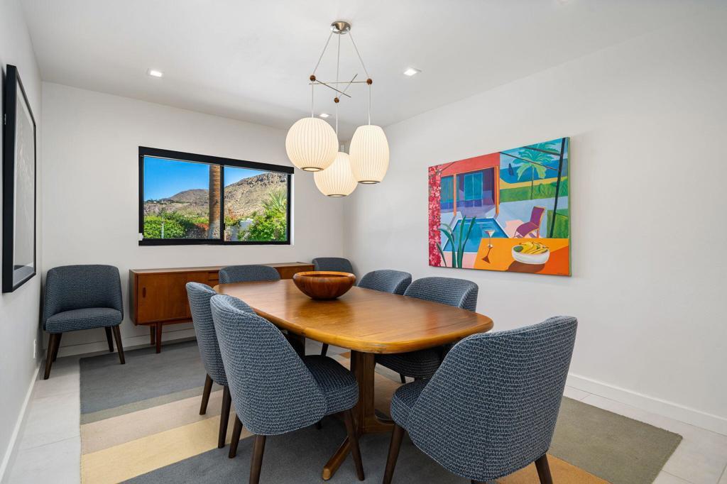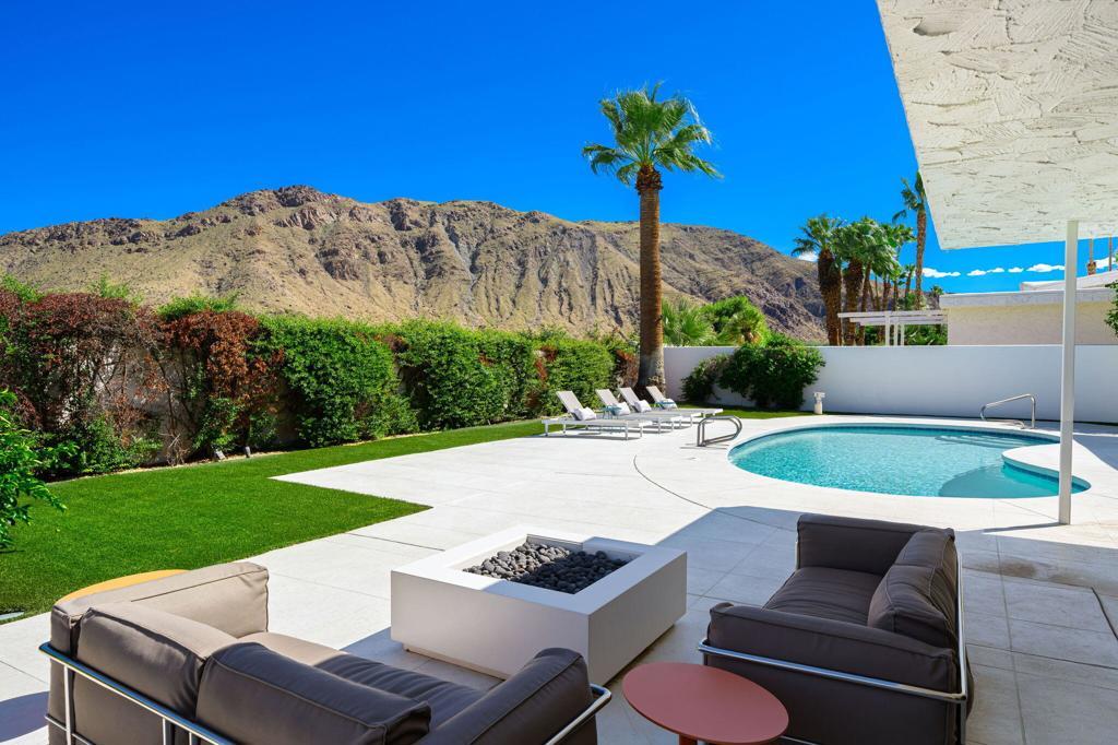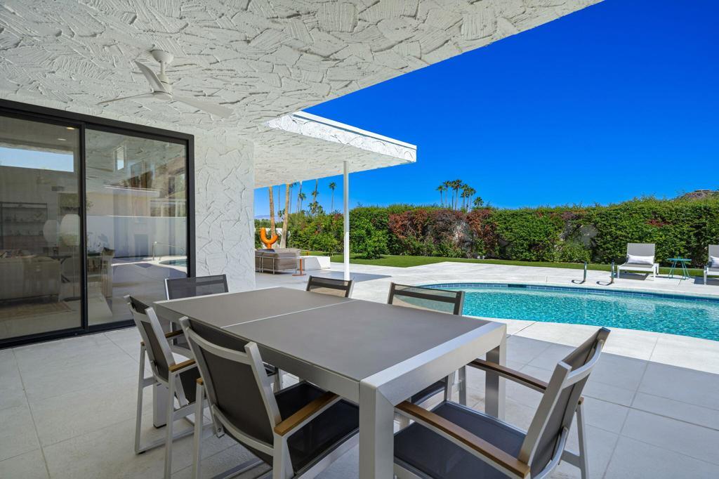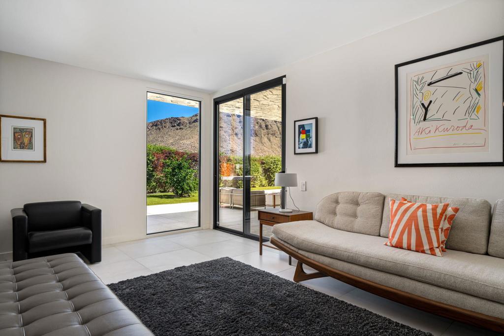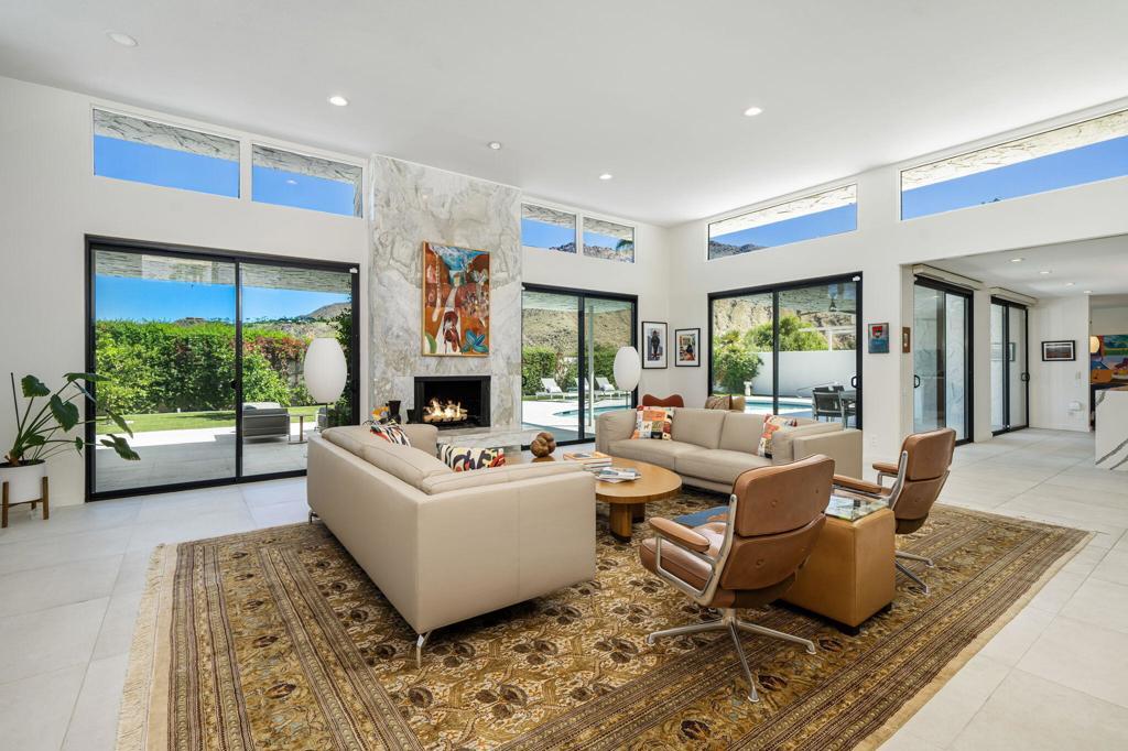 Great Views! Welcome to Canyon Estates, a distinguished community renowned for its mid-century architecture in South Palm Springs. This executive home, designed by acclaimed architect Charles DuBois, showcases exceptional mid-century modern design elements including high ceilings, clerestory windows, and expansive walls of glass that seamlessly integrate indoor and outdoor living spaces .The property offers panoramic mountain views, a pool, hot tub, and several leisure areas on an expansive, private lot. A gated entryway opens to an elegant floor plan comprising 3,137 square feet, remodeled with contemporary features and conveniences. Notable upgrades include new driveways and walkways, updated gates, and 23 owned solar panels with backup battery support. The roof was replaced in 2019. Additional highlights feature porcelain tile flooring, new sliding doors, double-pane windows, a comprehensive water filtration system, and a gourmet kitchen equipped with a Cambria Quartz island, G.E. Monogram Series appliances, and custom cabinetry. The spacious living room boasts a floor-to-ceiling custom fireplace and direct access to outdoor patios, ideal for entertaining. The primary suite offers stunning mountain vistas and includes a luxurious bathroom with a granite walk-in shower. The well-designed layout encompasses four bedrooms, three and a half bathrooms, a formal dining area, laundry area, and a two-car garage. This property is situated on fee land, providing added value. Select furnishings may be available under a separate agreement outside of escrow. Homeowners Association amenities include access to a nine-hole golf course, clubhouse, fitness center,tennis/pickleball courts,cable/internet, earthquake insurance, landscape maintenance and more! Call for your private showing today!