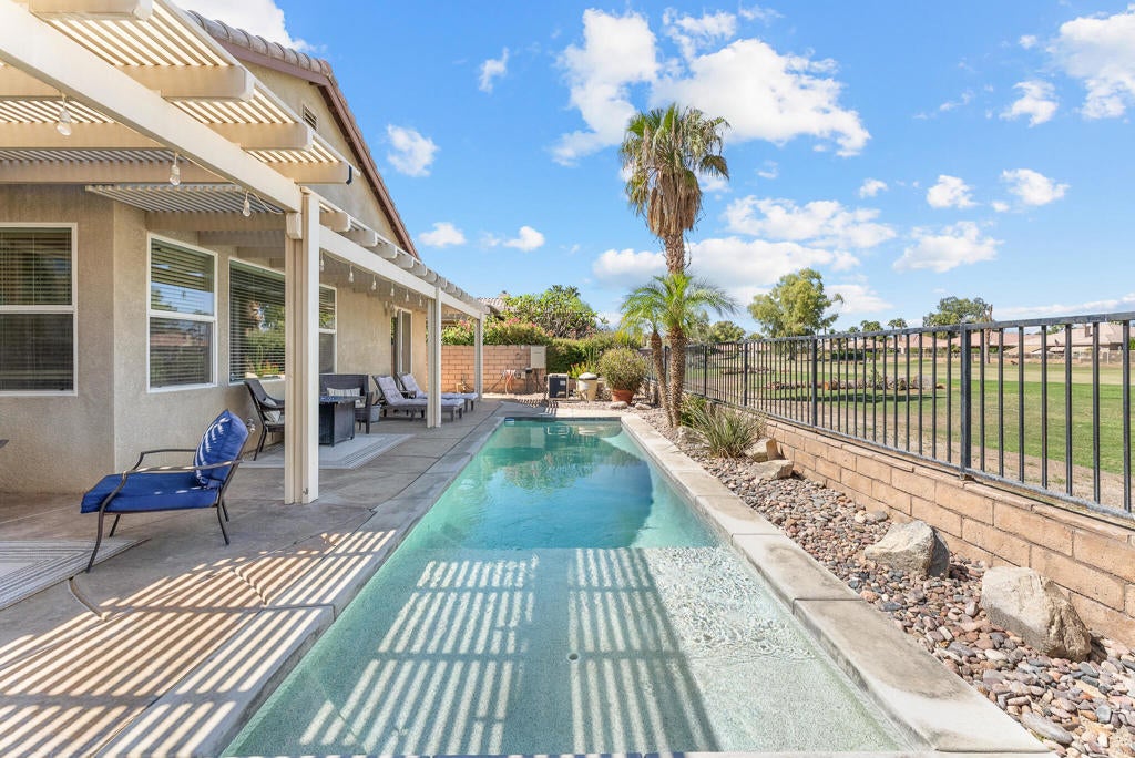 Come check out this beautiful 3 bedroom, 2 bathroom home located on the golf course. This home offers an open kitchen and spacious floor plan with plenty of natural light. The backyard features a private pool and direct golf course views, with abundant sunshine perfect for relaxing or entertaining. Currently operating as a successful Airbnb, this property also offers great income potential with only a 10 minute walk from the Coachella festival.
