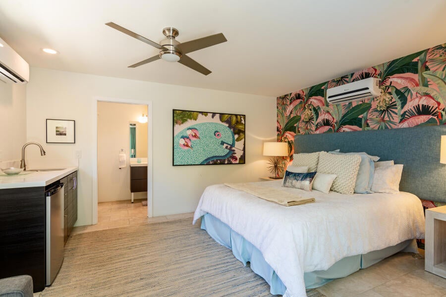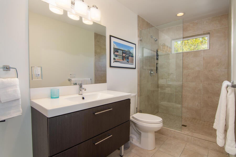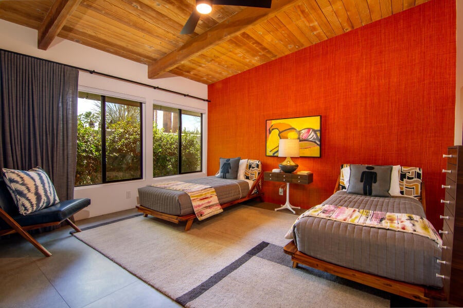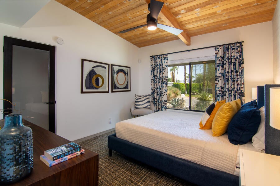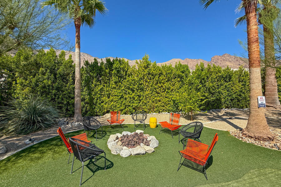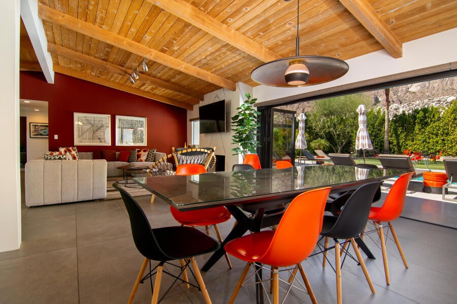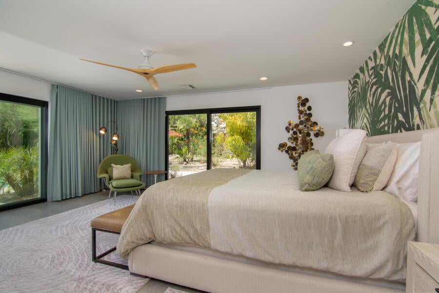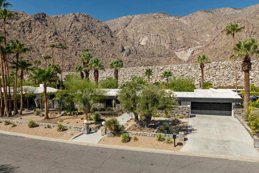 The most exquisite Midcentury Modern home ever available in Vista Las Palmas has come to market for the most discerning buyer. Originally built by the famed Alexander Company and renovated by Christopher Kennedy for the Palm Springs Modernism Tour, this architectural gem blends timeless design with luxurious modernism. The home welcomes you with an expansive open floor plan featuring a dramatic floor-to-ceiling marble fireplace, exposed beam ceilings, and Cantina-style hideaway doors. These seamlessly connect the living and dining areas to a stunning poolside courtyard, showcasing views of the San Jacinto Mountains directly behind the home.The main living area is spacious with a gas fireplace. Adjacent is the dining space with a handcrafted wood table that comfortably seats eight and opens to a chef's kitchen. The striking marble center island doubles as prep space and includes bar seating for two. Large windows flood the kitchen with natural light and frame views of the Las Palmas neighborhood. Five bedrooms offer luxury accommodations, including four in the main house and one in the attached guest casita. The primary suite, located on the west side of the home, features sliding glass doors opening to the serene backyard. Its spa-inspired ensuite includes a dual-sink vanity, oversized walk-in shower, stand-alone soaking tub, and sliding doors leading to a private garden with a walk-in closet.On the opposite wing are three additional bedrooms and a second master suite with direct pool access through sliding doors. This suite features ample closet space luxurious marble bathroom with an oversized shower, dual rain heads. The additional two guest rooms share a well-appointed bathroom with a single vanity and glass-enclosed shower.The fifth bedroom, located in an attached guest casita, offers ultimate privacy. It includes a private entrance, mini-fridge, its own A/C unit, and an ensuite bath with a glass-panel shower and single vanity. The backyard is a true showstopper. Set against a mountain backdrop, the sparkling pool and spa are surrounded by lush landscaping and resort-style amenities including a 3-hole mini putting green, out door shower, six loungers, a bocce court, shaded dining area for eight, gas barbecue, and firepit. Furniture, accessories and artwork is available for purchase outside of escrow. For the first time in months Vista Las Palmas is available for Short Term Rentals, this is a very successful high-end rental property.