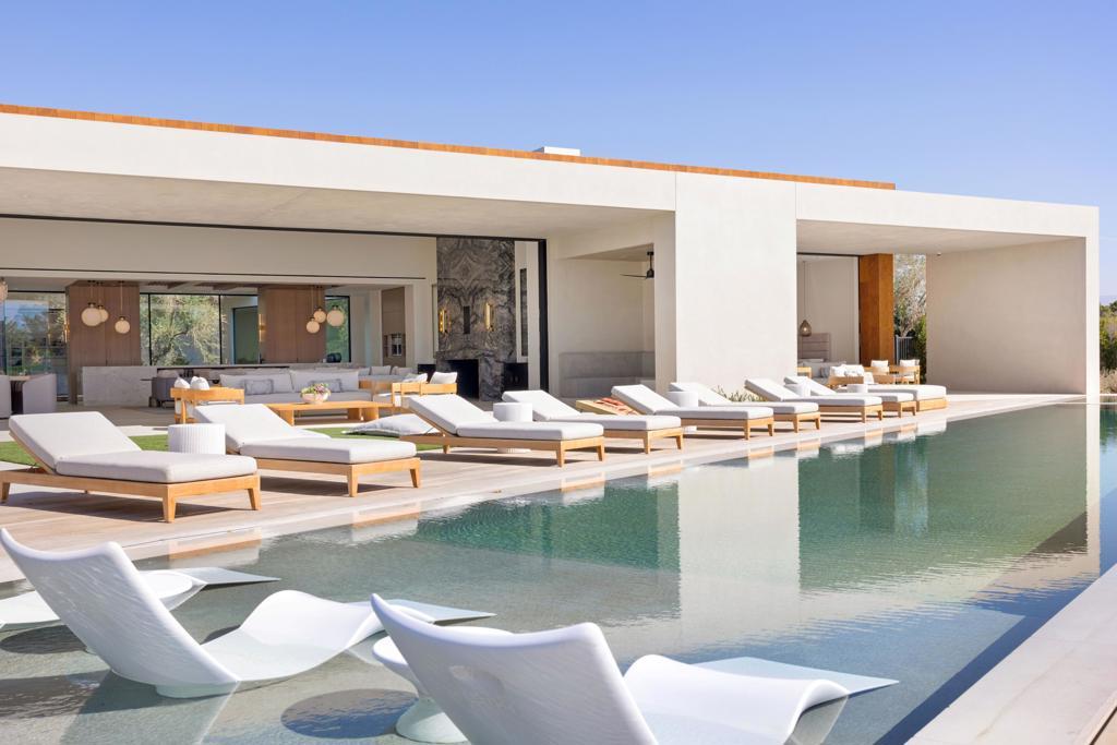 Experience the ultimate in luxury living at this stunning estate in the prestigious Madison Club. This exquisite property offers 7 bedrooms, 7.5 baths, and 10,046 square feet of living space, with panoramic views of the Santa Rosa Mountains and the 4th hole of the renowned Tom Fazio-designed golf course. This home is a masterpiece of design and craftsmanship, featuring top-of-the line finishes and amenities, such as a golf-simulator room, an office/home gym, art hallways, and a well-appointed bar and wine cellar. Enjoy breathtaking panoramic views by the cozy fireplace in the spacious great room or unwind in the opulent primary bedroom suite, complete with fireplace, sauna and steam room. The gourmet kitchen is a chef's dream, equipped with a prep kitchen and a large pantry. The floor to ceiling glass doors pocket away to create a seamless transition from indoor to outdoor living areas, where you can enjoy the outdoor fire features, the infinity edge pool, the spa, and the built-in barbecue. The separate living upstairs offers privacy and comfort, with two bedrooms, two baths, a living area, a kitchen, and an outdoor lounge area with a fireplace and endless 360-degree views of the desert. This home is a rare opportunity to own a piece of paradise in one of the most exclusive communities in the desert. Don't miss this chance to live your dream at the Madison Club.