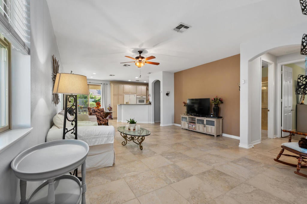 This tranquil and serene San Ysidro Retreat sits on a spacious 8,276/sf south-facing corner lot, offering privacy and easy access to amenities. The upgraded home features high ceilings, large windows, flexible living areas, tinted bedroom windows, tile and LVT flooring (no carpet), and a built-out walk-in closet. Recent improvements include new HVAC, a walk-in shower in the second bath, painted kitchen cabinets, a newer dishwasher, and an updated refrigerator. The private backyard features fruit trees, real grass, mature landscaping, and shade trees. Sun City Shadow Hills Community highlights include two golf courses, clubhouses, pools, fitness centers, tennis and pickleball courts, a restaurant, and social clubs. The property is being sold partially furnished. Make an appointment to see it today!