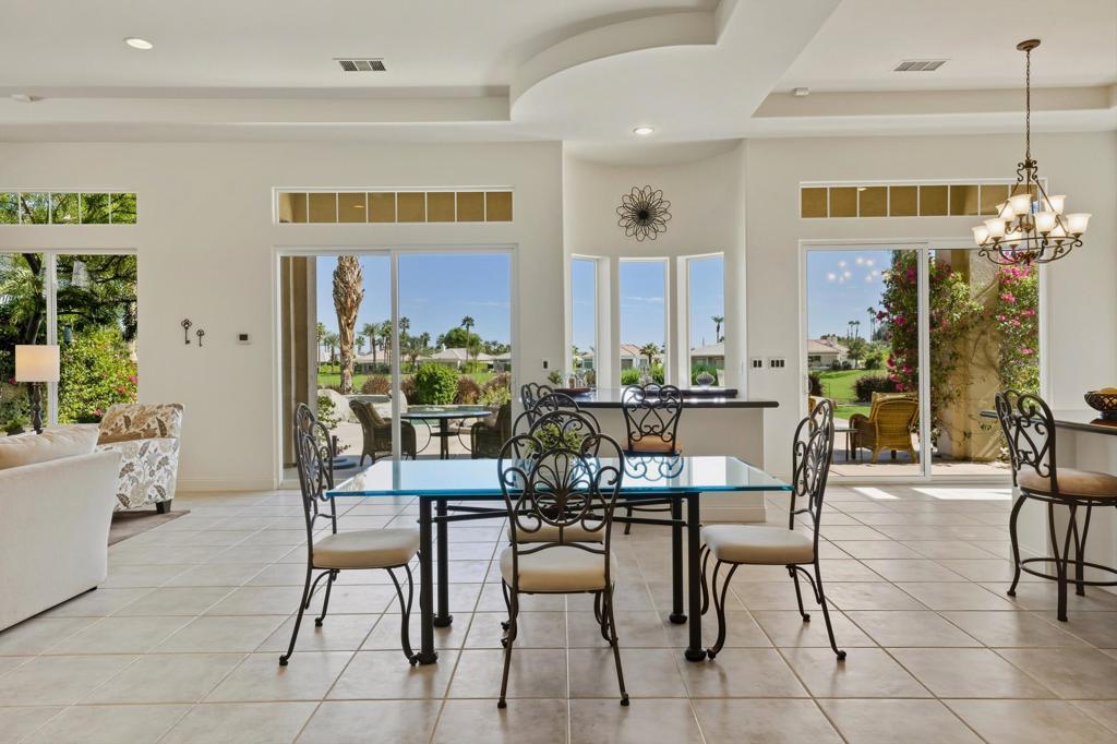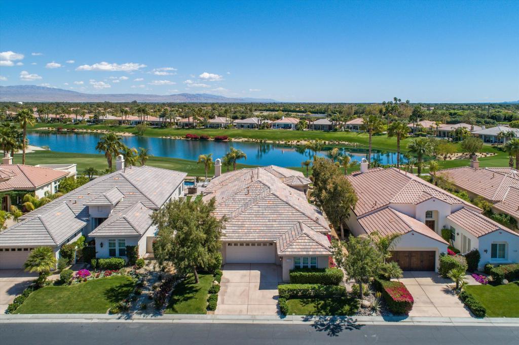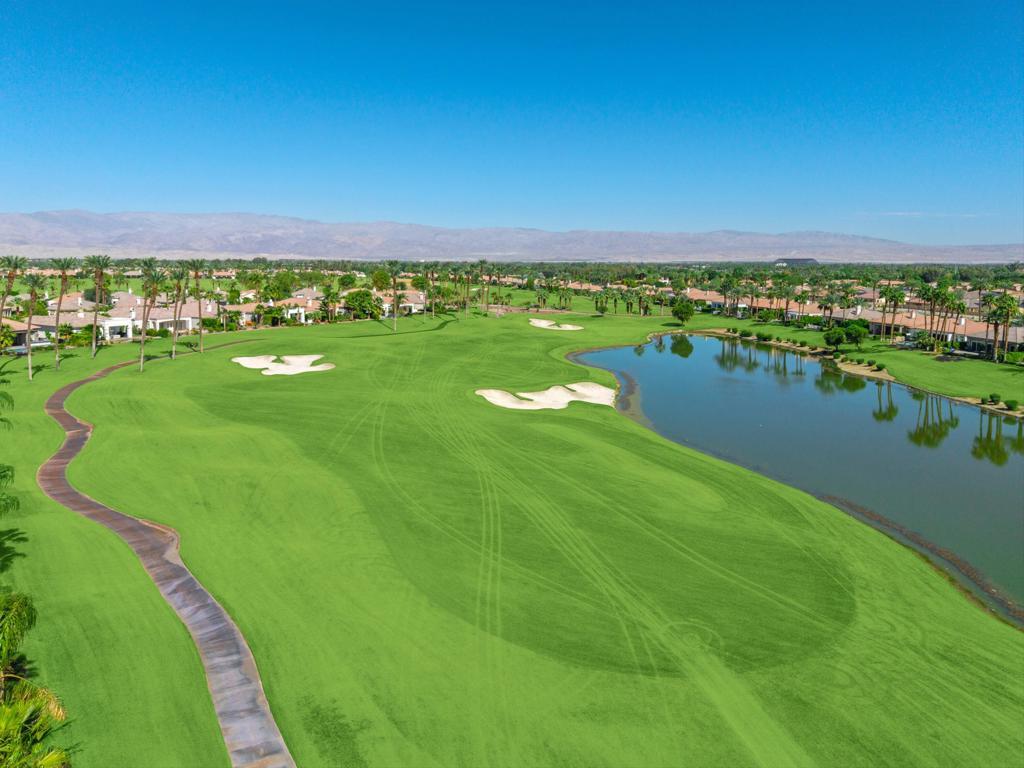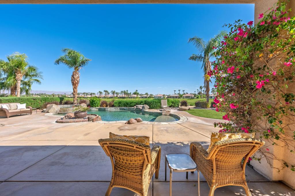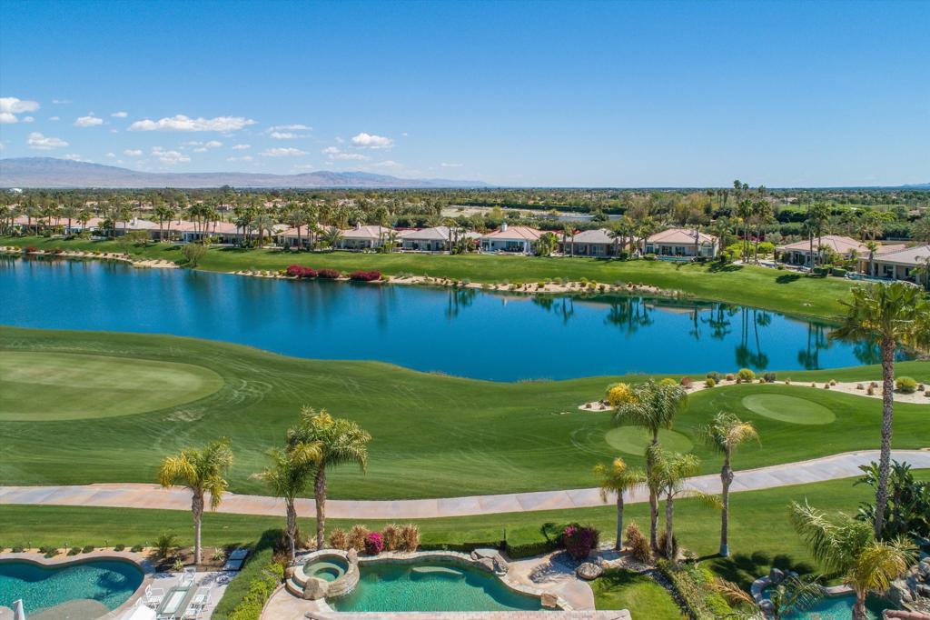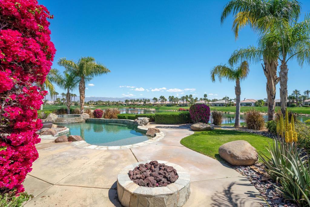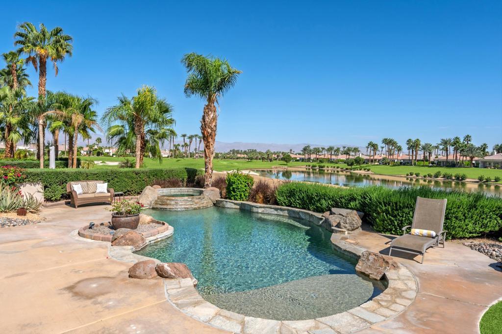 Priced to sell! Experience unparalleled resort-style living in this exquisite Mountain View Country Club estate, boasting breathtaking panoramic views of mountains, the 15th fairway, and a serene lake. This immaculate 2,535 sq ft residence is designed for seamless indoor-outdoor enjoyment, with expansive walls of glass opening to a spectacular backyard oasis. Imagine year-round entertaining in your private paradise featuring a custom pool and spa, lush designer landscaping, and multiple alfresco lounging and dining areas. Step inside to an open-concept living space characterized by soaring ceilings and sophisticated finishes. A magnificent floor-to-ceiling stone fireplace serves as the heart of the home, creating a dramatic focal point. The gourmet kitchen is a chef's delight, outfitted with rich wood cabinetry, elegant granite slab countertops, and a generous island complete with a wet bar, perfect for hosting. The luxurious primary suite is a private sanctuary, offering direct access to a patio and a spa-like ensuite bathroom with a soaking tub and walk-in shower. Two additional guest suites ensure comfort and privacy for visitors. Convenience abounds with a spacious three-car garage, including a dedicated golf cart bay, and ample storage throughout the home.Living at Mountain View Country Club offers world-class amenities including an Arnold Palmer Signature golf course, tennis, pickleball, bocce ball, fitness center, spa services, and a vibrant clubhouse with dining and social events. The location is minutes from Old Town La Quinta, fine dining, shopping, hiking trails, and the best of the Coachella Valley.Whether as a permanent residence or seasonal escape, this home delivers the quintessential desert living experience.