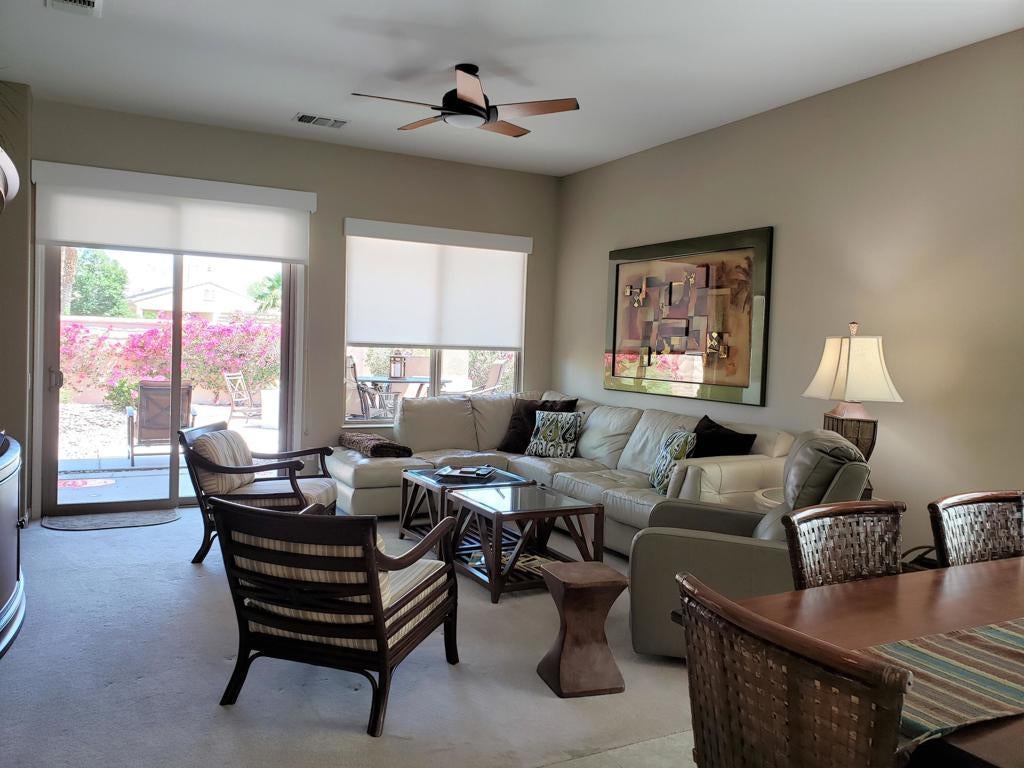 Indio, Sun City Shadow Hills- Serrente Model - Turnkey Furnished -ANNUAL LEASE TERM. Available Beginning January 12, 2026. Age restricted community. Owner will not remove furnishings. This attractive 2 bedim 2 bath home features a Great Room with smart TV, Den with sleeper sofa. Beautiful kitchen w/granite slab counters, Refrigerator, Breakfast bar & Dining Area. Gas range, convection oven & Microwave. Primary Bedrum with king bed and TV. Attached private bath with dual sinks and walk-in shower. Guest Bedroom with queen bed, guest bath with shower/tub. Laundry room with washer & dryer. 2 Car attached garage. Covered patio with view of the Chocolate Mountains. Very well maintained . Sun City Shadow Hills is an active adult community offering two clubhouses with state of the art fitness centers, indoor/outdoor pools, bocce courts, billiards, lighted sports courts, two golf courses, restaurant plus numerous club and social activities. Age restricted community - occupants must be 55 yrs old. Call for details.