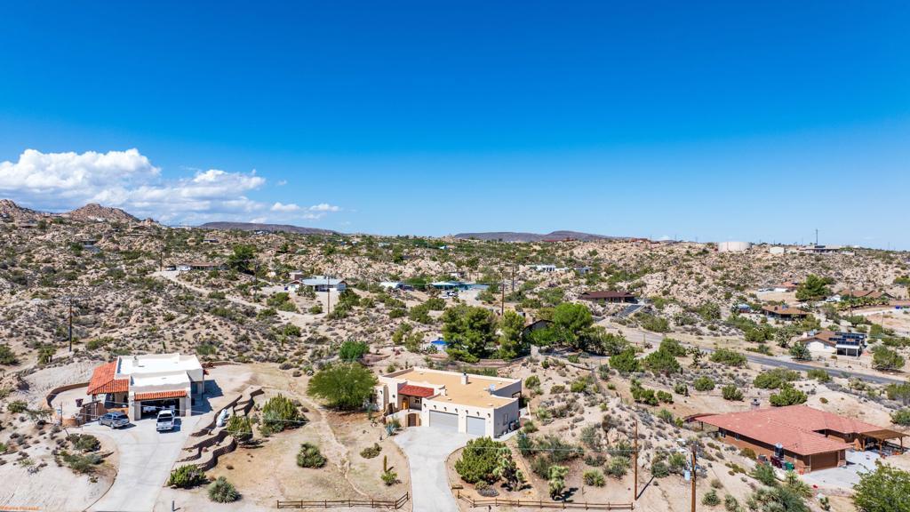 Experience elevated Yucca Valley living in this Sante Fe style home with panoramic mountain and desert vistas from every window, and two outdoor patios for indoor outdoor living. This 3 bed, 2 bath home exudes the distinctive flair of the southwest with wood beam ceilings, gorgeous unique woodcrafted cabinetry, Talavera tiles as backsplash, light plates, window accent, artwork, and cabinet knobs. Open concept living room and dining area are centered with a striking fireplace, and stunning views that captivate your eyes. The kitchen is spacious and ready for the busy cook with SS appliances, trendy black sink and faucet, under cabinet lighting, and a door to the back patio for easy outdoor BBQ and dining. There is a breakfast bar to seat 3 comfortably, a workspace, and glass front cabinets. The primary bedrm is set apart for privacy, slider to the back patio, large walk-in closet, large ensuite bath, separate shower, double sinks. Two guest bedrms are roomy, carpeted, and one has a walk-in closet, share the nearby convenient guest bath. The front courtyard beckons you at night to take in the city lights below from your hillside perch. The back courtyard is covered and roomy perfect for dining out or taking quiet moments from a lounge chair. Close to shopping, dining, and attractions like Joshua Tree National Park. Retirees downsizing will find comfort in the single-story design and SW charm. Creative professionals, entrepreneurs, locals will enjoy the inspiring views and space to create--indoors and out. Remote workers can escape the city and work from a serene, stylish environment. Second-home buyers will find an easy lock-and-leave home less than two hours from Los Angeles. Original architectural details offer a classic desert aesthetic, while the spacious lot invites endless possibilities--whether it's a garden, workshop, studio, or outdoor lounge. Soak in the serenity with morning coffee on the patio or wind down as the sun sets over the hills. This is the home you've been searching for.
