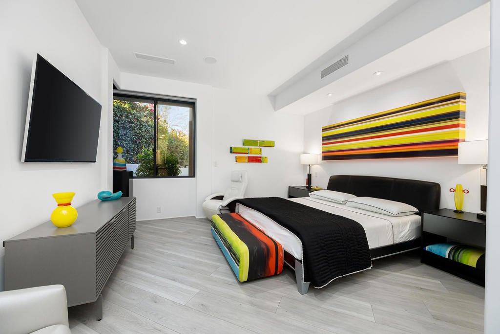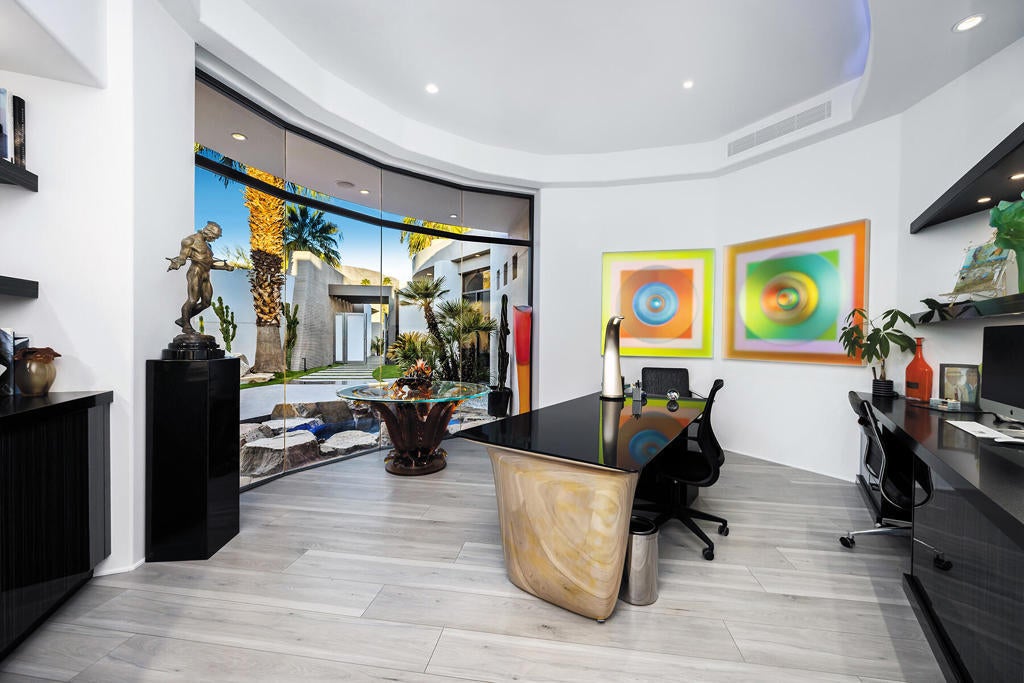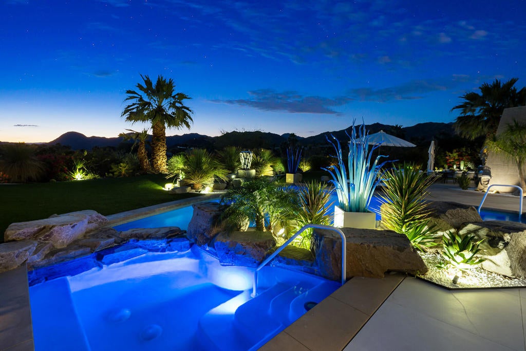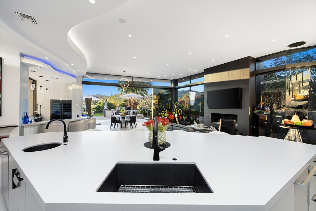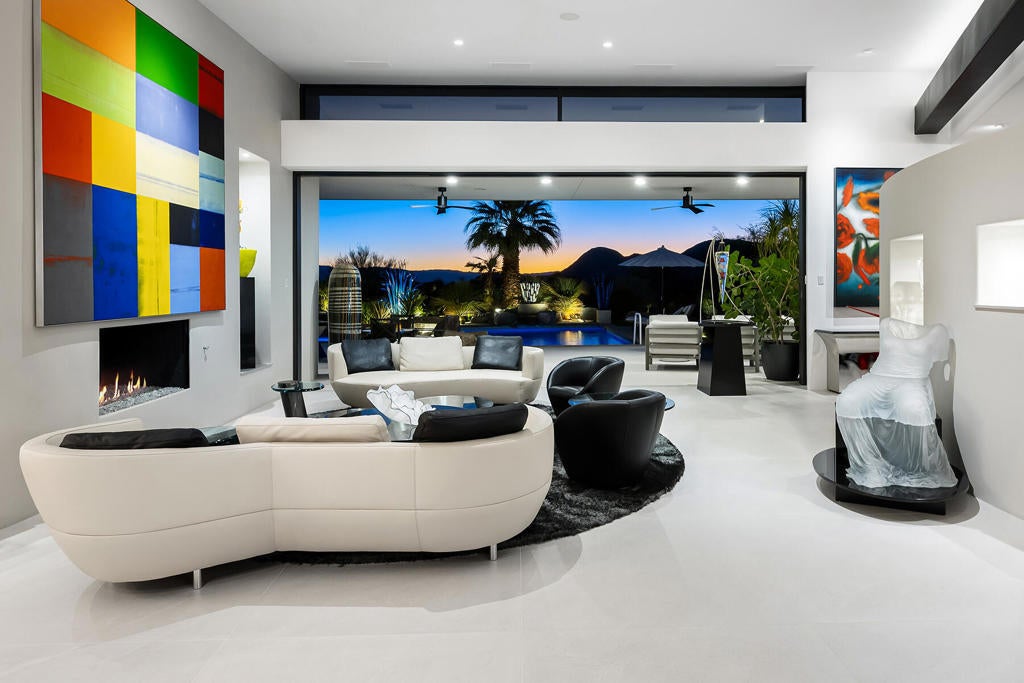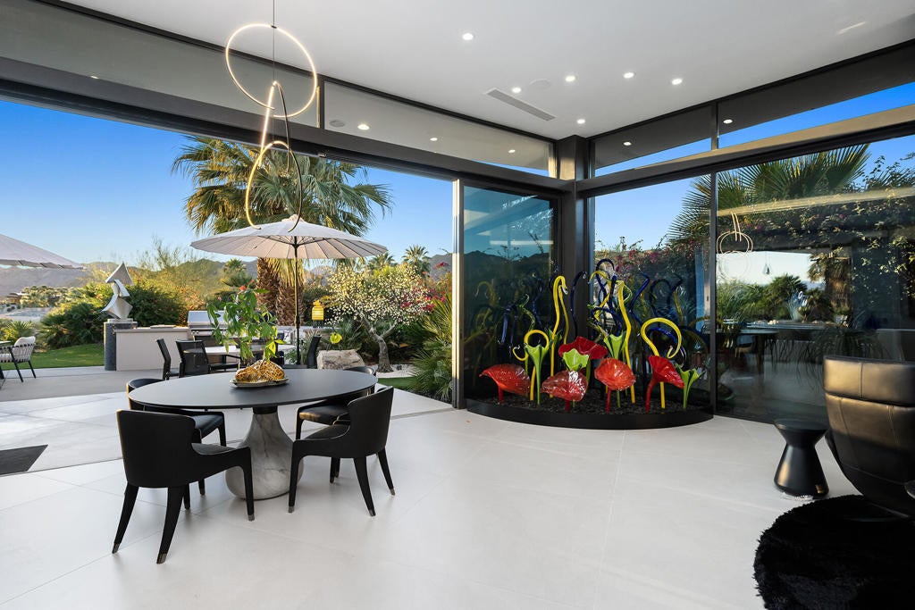 This beautifully remodeled contemporary home features 4 bedrooms and 4 1/2 baths. The moment you arrive in the motor court you can sense the grandness of these home. Entering the gated courtyard, you are greeted by a soothing water feature that runs along both side of the walkway. Once in the home you are mesmerized by the breath taking mountain vistas, and lush surroundings. The living area features upgraded lighting for art and pocket sliders leading the the entertainment patio, pool/spa and BBQ. The state of the art kitchen features the latest decor appliances for the chef inside you. The primary bedroom offers a private sitting area that is perfect spot for reading a book. The spa like primary bath features two water closets and two walk in closets, one of which is currently set up for Pilates. An office with views of the courtyard water feature and mountain views is a great spot to get some work in. The two interior guest suites feature full baths and walk in closets to keep you guest comfortable. The guest house off is located off the courtyard and feature a kitchenette, sitting area and fireplace. The home has been remodeled in the past two years including the pool and spa. The solar array is owned as well.