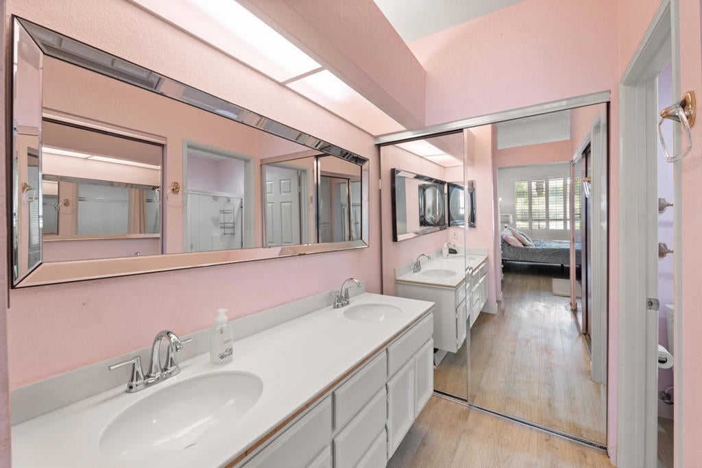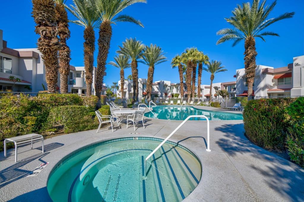 Welcome to this turnkey furnished ground floor retreat in the heart of Palm Springs! This well-maintained 2 bedroom, 2 bath condo is clean, spacious and offers a large primary suite with double vanities, two large closets and views of the sparkling pool and spa. The home features new floors, shutters throughout, a large enclosed patio with an additional storage closet, indoor laundry, a covered parking space and plenty of guest parking. La Palme is conveniently located near downtown Palm Springs and offers resort style amenities including 6 pools, 3 tennis courts, EV charging stations and beautiful landscaping. The HOA dues also include cable, wifi, water and trash.