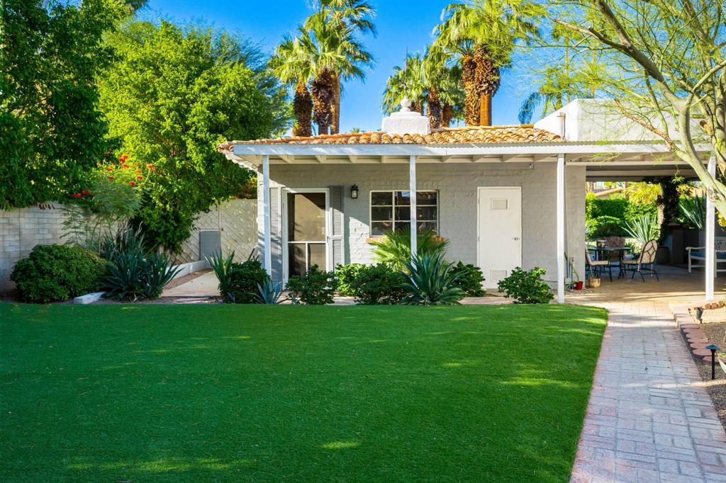 Experience the ultimate combination of Palm Springs' rich past and alluring present at this sprawling custom estate in the exclusive enclave of Old Las Palmas. The former home of legendary star Mary Martin, this exceptionally private and peaceful property is available for the first time in more than 35 years. Carefully upgraded while preserving its original style, the estate was created in 1936 and features a single-level main house and a detached guest house with rooftop view patio, encompassing a total of six bedrooms and five baths in approximately 4,078 square feet. Beyond a breezeway entrance, the residence opens to a formal fireplace-warmed living room with vaulted and beamed ceiling, a dining room with pool views and wet bar, and a casual family room. Large picture windows allow natural light to illuminate living spaces, while hardwood floors add warmth to every occasion. Highlighted by two garden windows, the kitchen presents custom cabinetry, solid-surface countertops, a nook with built-in banquette seating, a built-in pantry, and a large bar for dining and buffet-style serving, all with fabulous pool views. Each bedroom is unique, with some sharing upgraded baths, and the primary suite hosting two baths, a walk-in closet, cedar-lined sauna, and a retreat with outdoor access that has the potential to become another bedroom. A bonus room with bath, Murphy bed and direct patio access enhances versatility. Classic features include a cabinet hidden behind a painting, a built-in shoe-shine station and a walk-down basement, while new dual-zone AC and splits ensure year-round comfort. Grounds are beautiful and serene, with a street-to-street homesite of approximately .68 acres welcoming stunning mountain views, a private front yard with lawn and gardens, a private side yard with lifelike turf and towering palm trees, and a resort-caliber backyard with recently refreshed PebbleTec pool and spa, resurfaced decking and enviable privacy. Historic photos showcase Martin and fellow screen legends, including Janet Gaynor, enjoying the poolside setting. The terraced backyard's lower level is home to mature citrus trees, an open-air fireplace with ample room for seating, a newer covered patio with BBQ, a long gated driveway with ample room for guest parking, and a rotating solar array with new panels that follows the sun to maximize energy production. Additional parking is available on a paver-finished front driveway leading to an attached two-car garage.